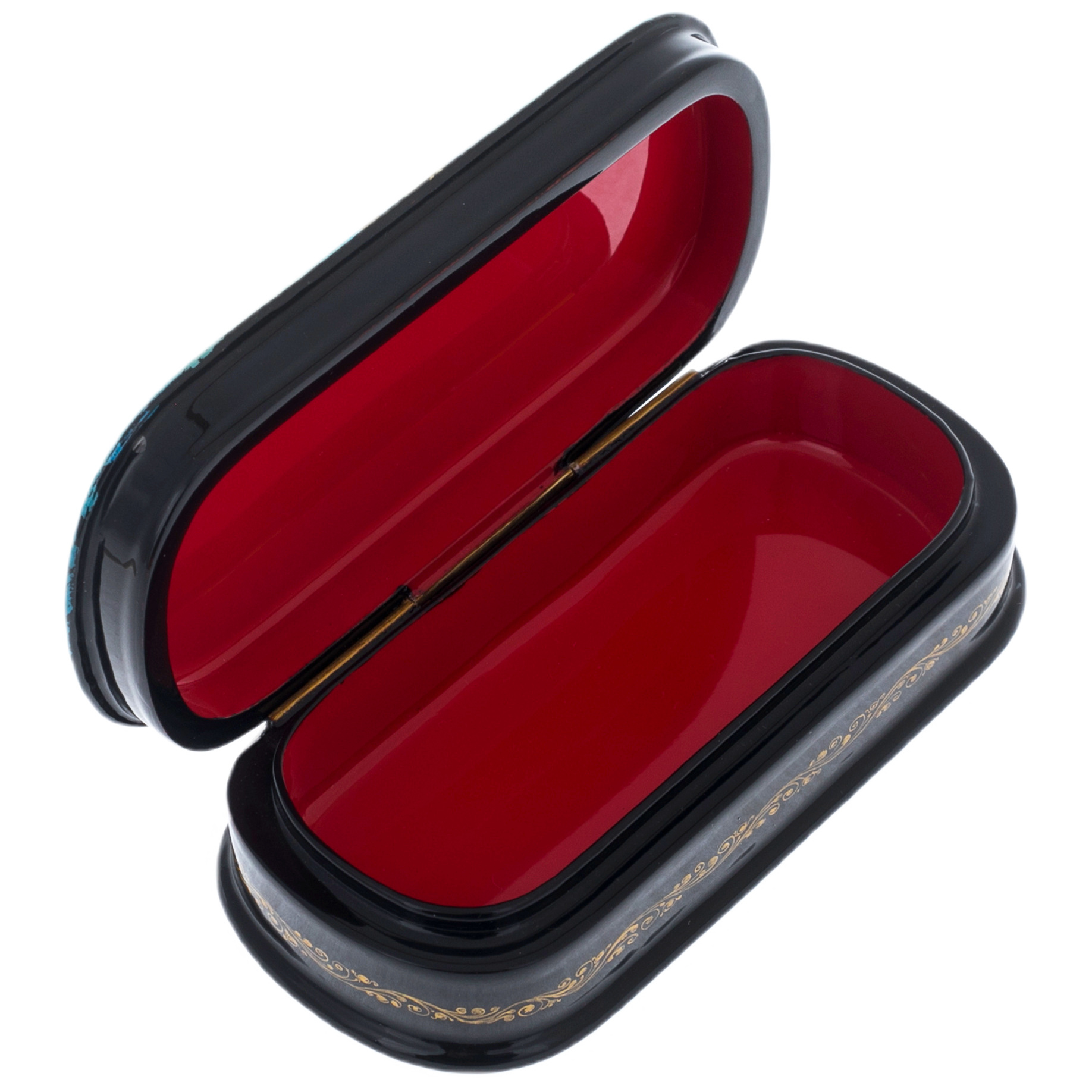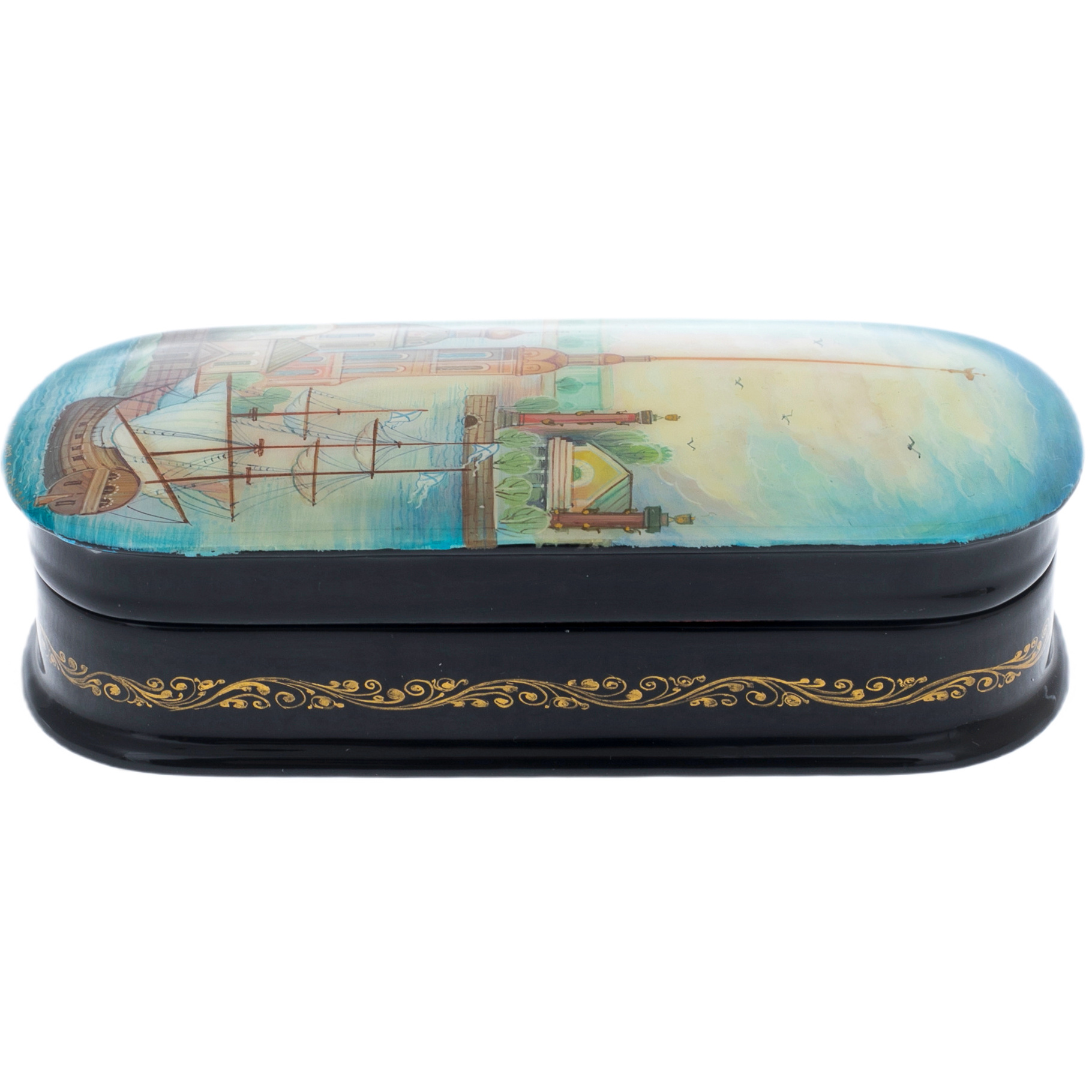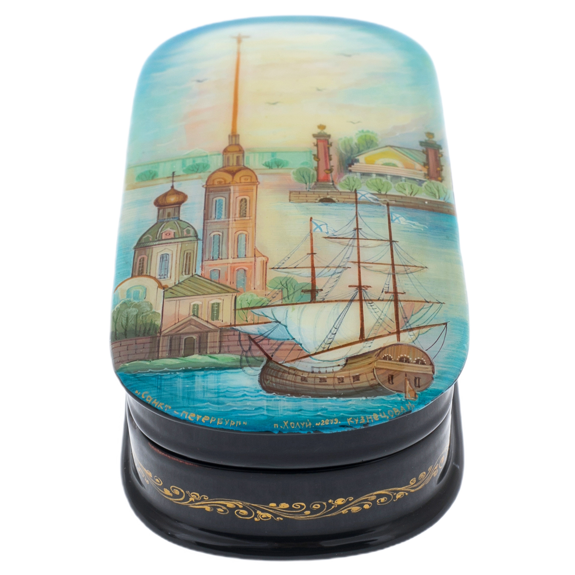 Эта шкатулка, украшенная золотым орнаментом вдоль корпуса, воплощает элегантность и роскошь, подходящие для ценителей искусства и истории. Лаковая поверхность сверкает под светом, словно зеркало, возвращая к ощущению недосягаемой красоты и гармонии, к атмосфере культурного величия, в которой утопает Санкт-Петербург. Корпус шкатулки является свидетельством мастерства и изящества, превращая её в произведение, достойное стать украшением самой утончённой коллекции.