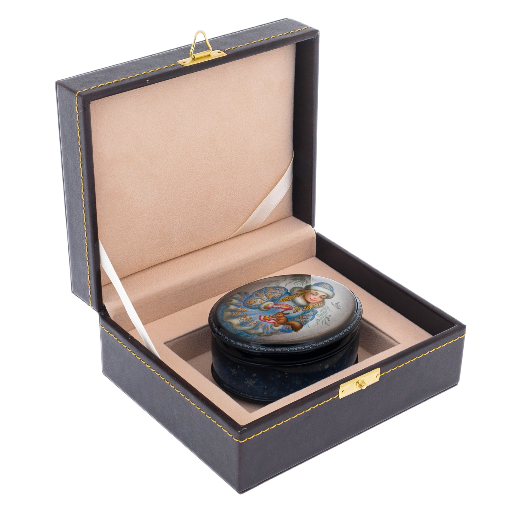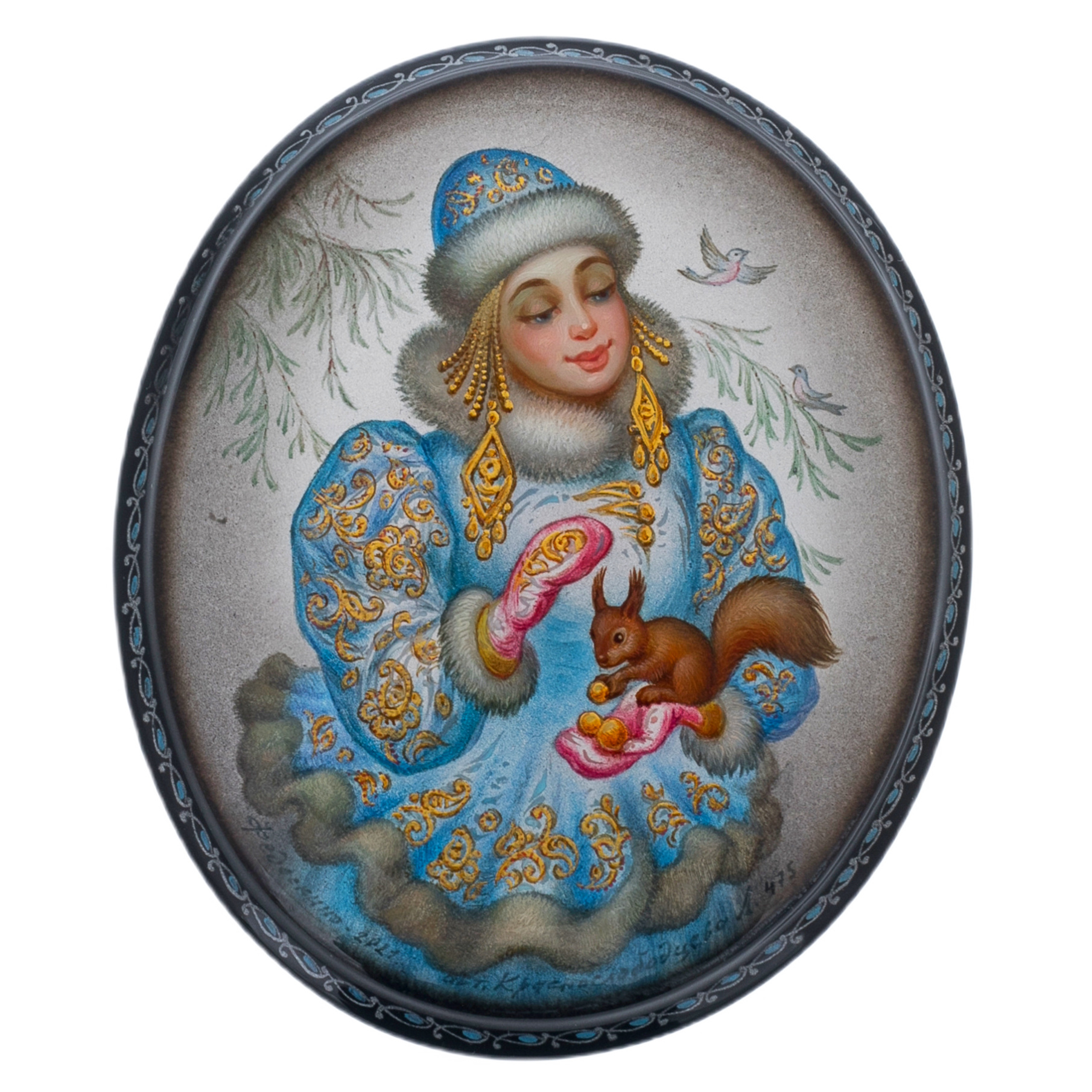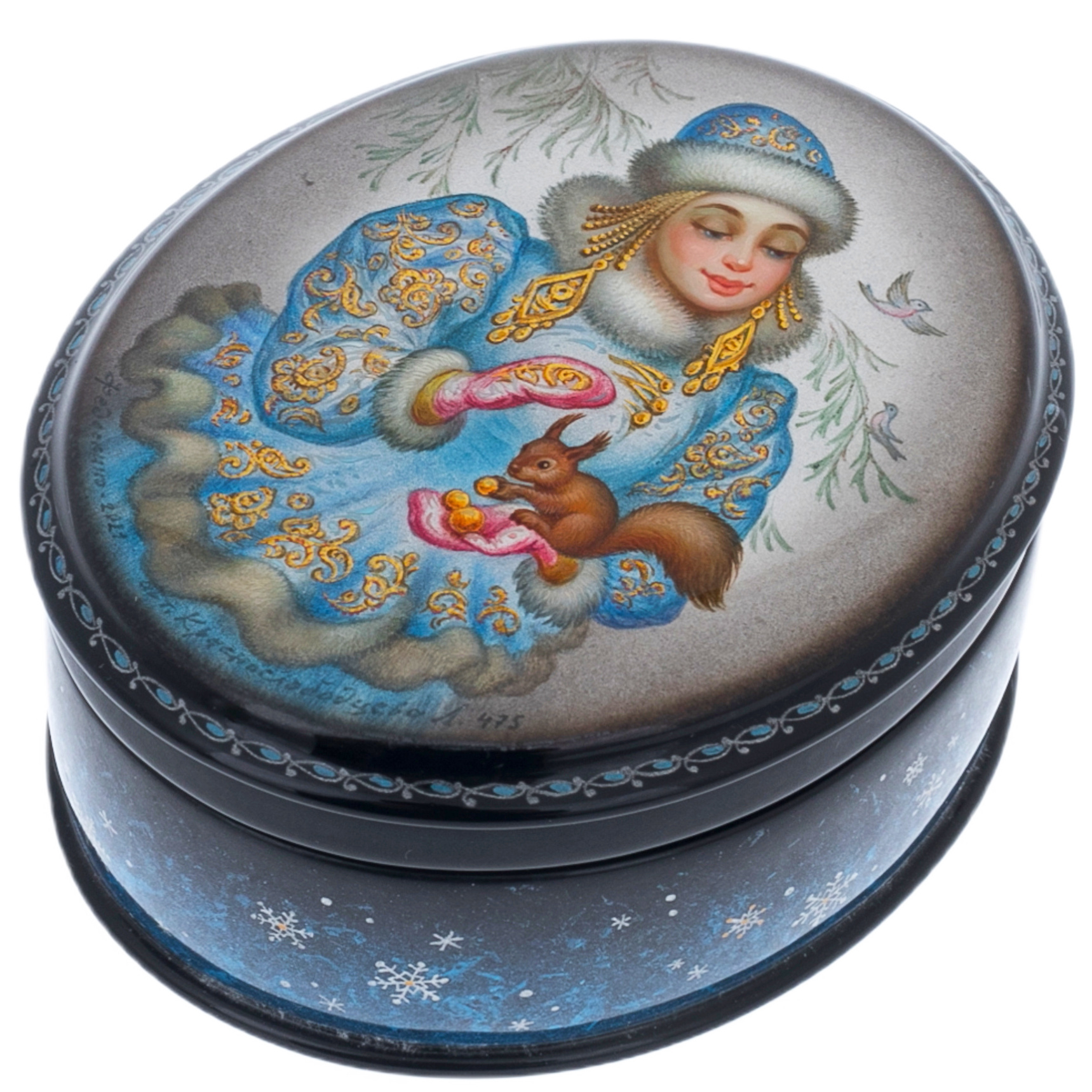 Шкатулка "Снегурочка" — это не просто предмет, а истинное произведение искусства, способное перенести в мир волшебства и детских мечтаний. На её изысканной поверхности разворачивается трогательная сцена, где нежная Снегурочка, символ новогоднего чуда, с улыбкой держит на руке белочку, мирно грызущую золотые орешки. Этот образ олицетворяет радость ожидания и искреннюю веру в чудеса, присущую каждому ребенку, а также взрослым, не забывшим о своих мечтах.