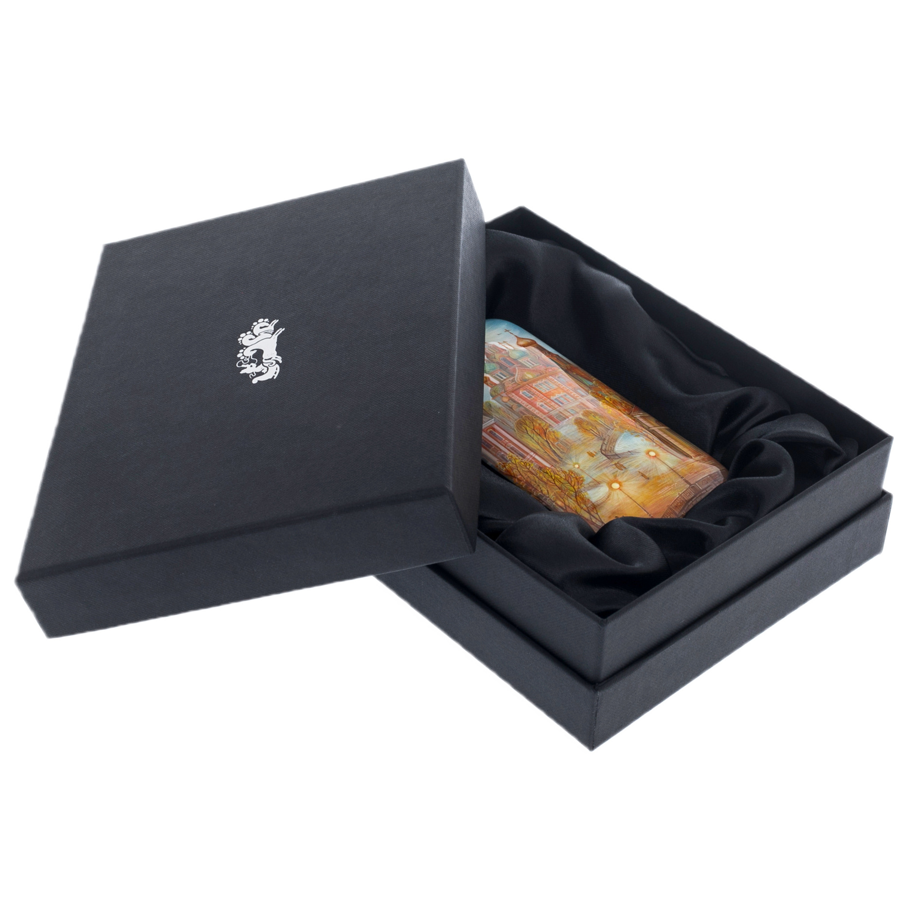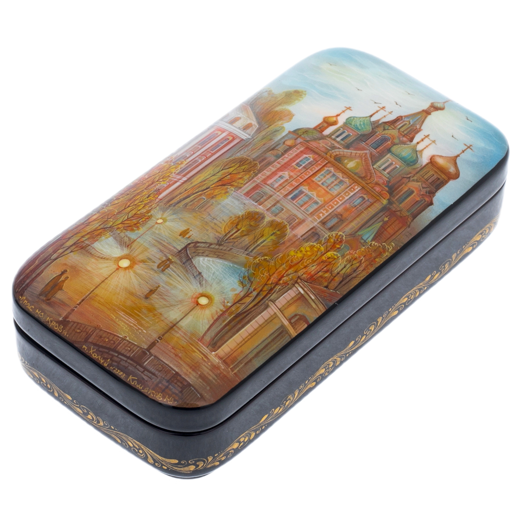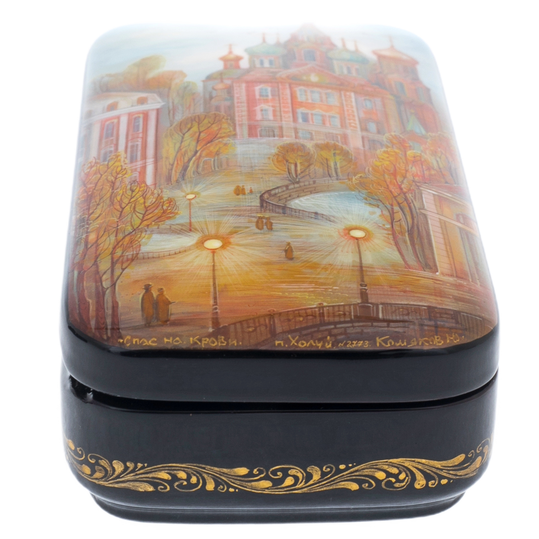 Шкатулка "Спас на Крови" — это настоящий шедевр русской лаковой миниатюры, в котором мастер воплотил дух Санкт-Петербурга, окутанный легкой дымкой туманного утра. На ее крышке, в волшебной симфонии оттенков, предстает храм Спаса на Крови, в окружении старинных улиц и осенней листвы, которая кажется охваченным солнцем пламенем, освещающим каменные мосты и тихие воды каналов. Каждая деталь на этом небольшом полотне, от колоколов до оконных переплетов, наполнена торжественной тишиной и вечностью, где время словно замирает, отдаваясь в руки искусства.