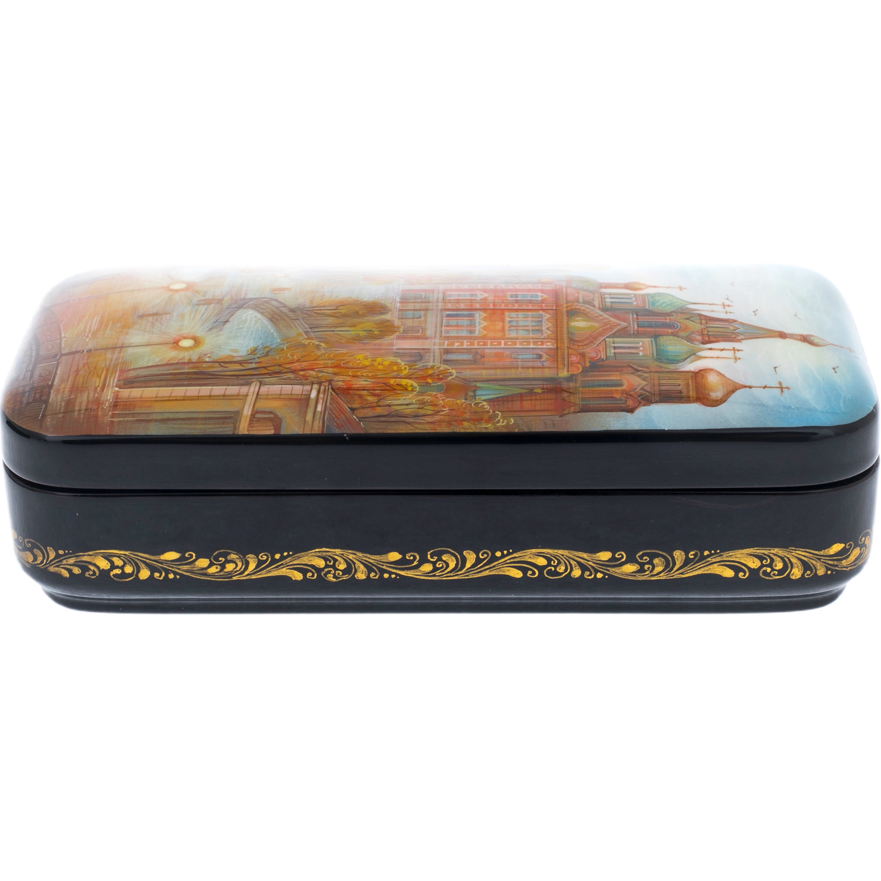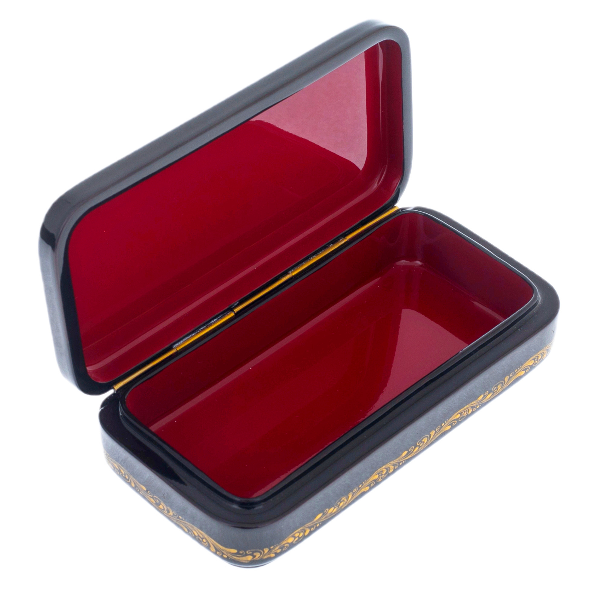 Эта шкатулка обрамлена золотым узором, подчеркивающим её утонченность и роскошь. Каждая линия, каждый завиток орнамента — это невидимая связь с древними традициями мастерства, где каждый мазок — отражение бережного отношения к искусству и истории. Лаковая поверхность, глубокая и зеркальная, словно приглашает провести рукой по гладкой текстуре, ощутив холодную элегантность, в которой заключена тайна былых эпох.