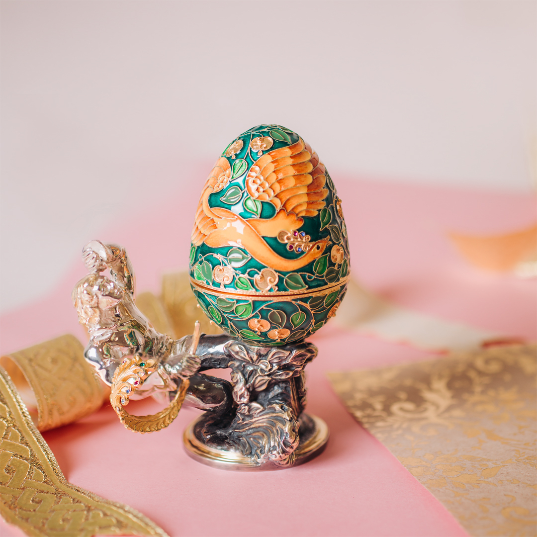 Яйцо-шкатулка «Жар-птица» — изысканное ювелирное произведение, вобравшее в себя символику русских легенд и величие художественного ремесла. Выполненное из серебра, изделие покоится на скульптурной подставке в виде юного ангела с арфой — образа, наполненного лёгкостью и мечтательностью. Яйцо украшено сияющим орнаментом из листьев, цветов и мифической птицы, расставленным на фоне глубокого зелёного эмалевого неба, будто сотканного из тени сада, где каждый изгиб листвы хранит дыхание чуда.