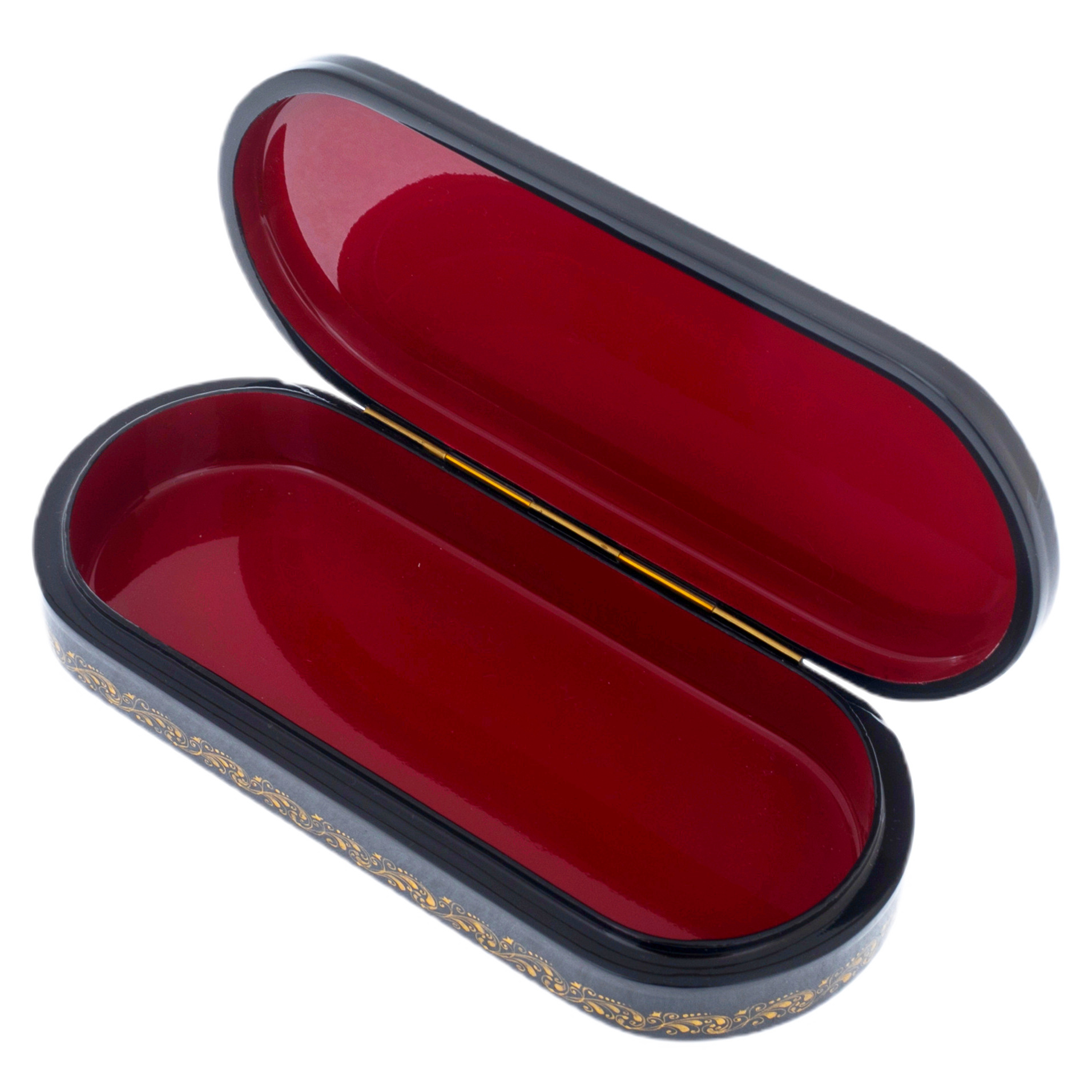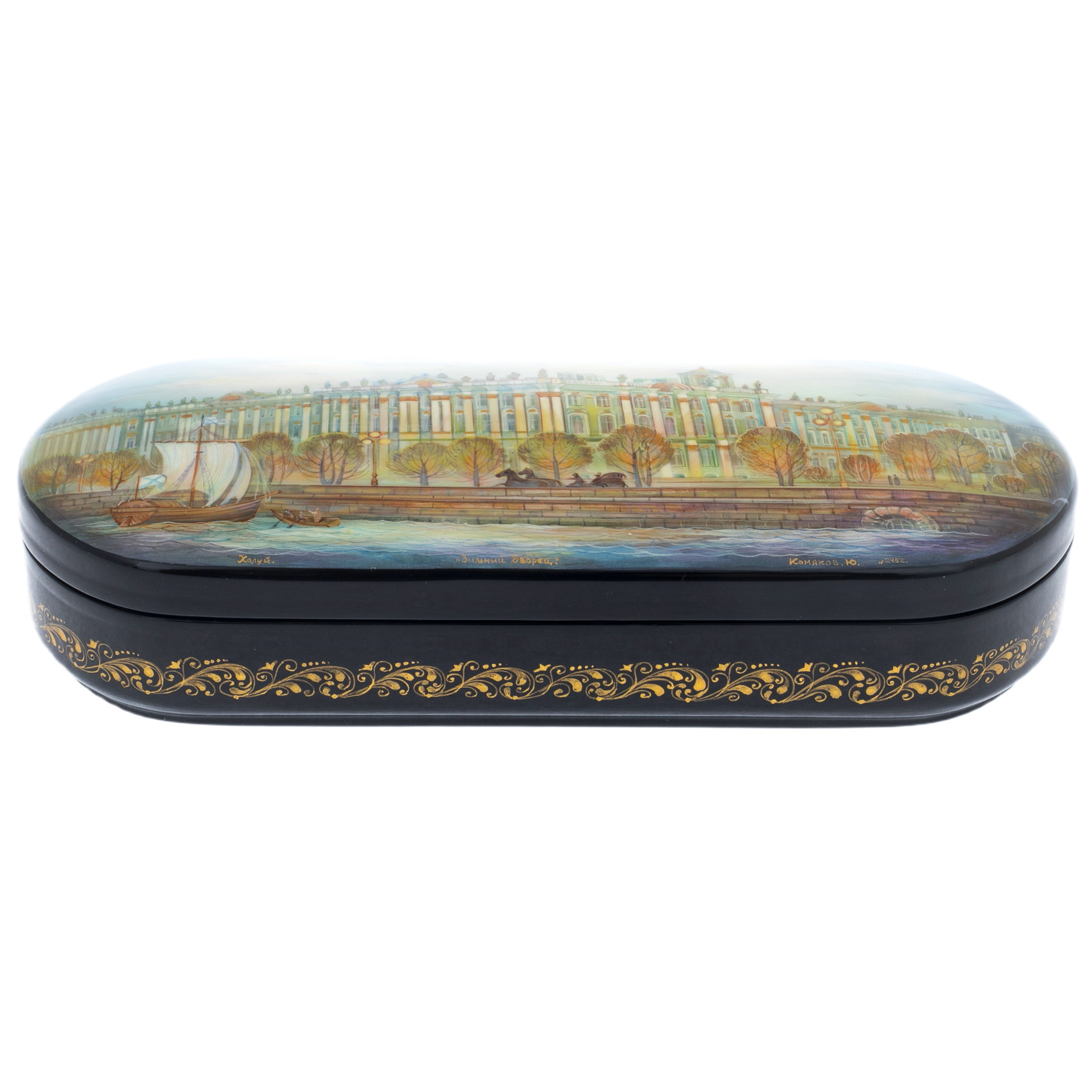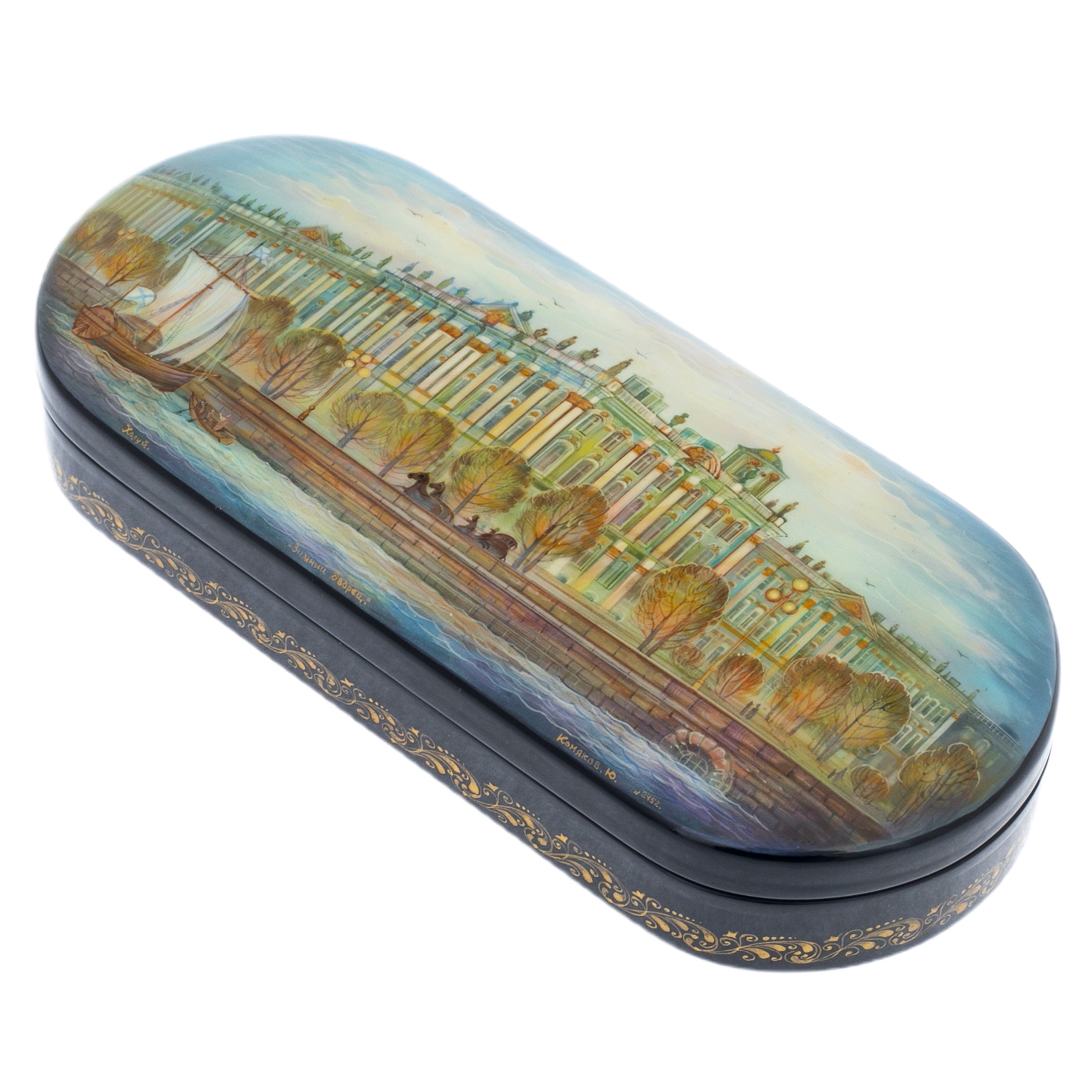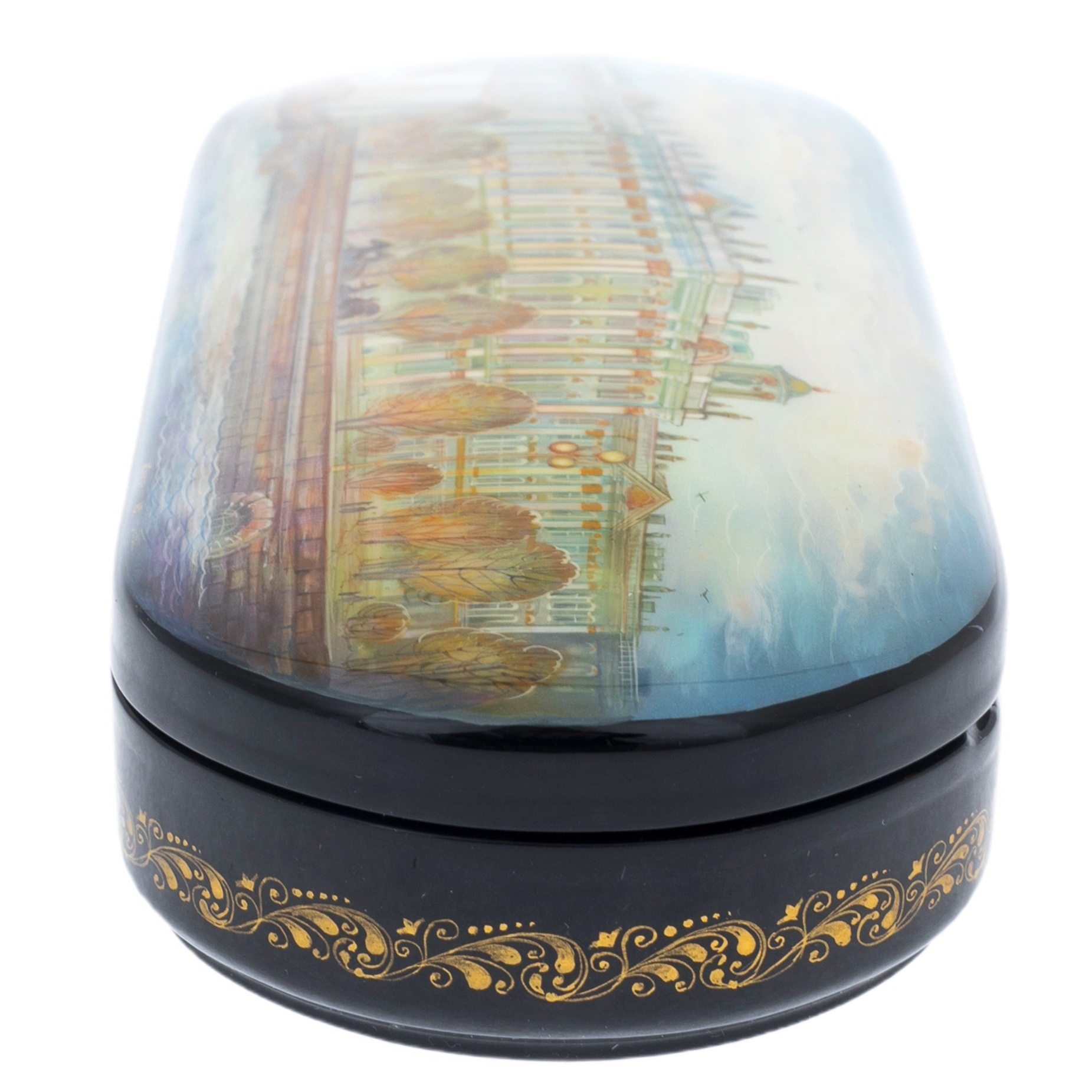 Корпус шкатулки украшен тонким золотым орнаментом, который словно перекликается с богатством и изяществом фасадов дворца. Каждый завиток, каждый штрих — это эхо древнего искусства, воплощенное в современном изделии. Лаковая поверхность, отполированная до блеска, притягивает взгляд и обещает тайны, заключенные внутри, храня подлинный дух города, ставшего символом культурного наследия и высокого искусства.