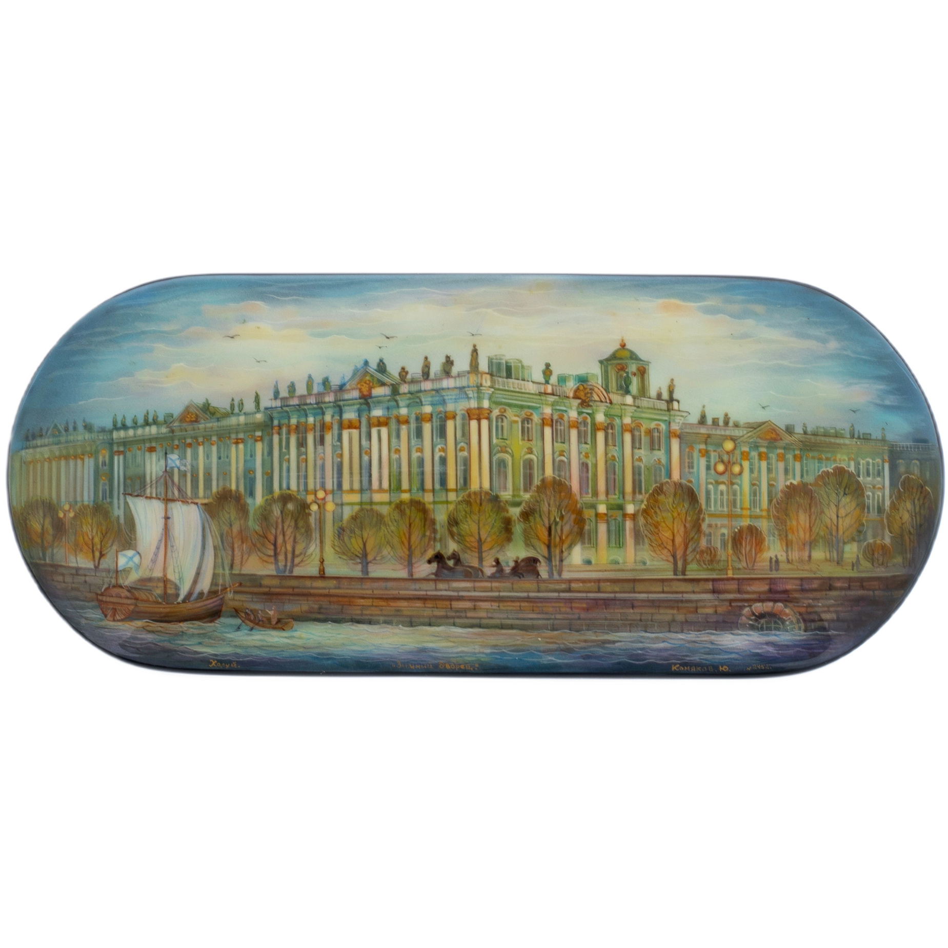 Шкатулка "Зимний дворец", созданная мастерами холуйской росписи, пленяет с первого взгляда. На её крышке изображен величественный фасад Зимнего дворца, окутанный легким осенним туманом, что придает композиции особую мягкость и глубину. Река, спокойная и строгая, отражает стройные линии дворцовых стен, а тихая гладь воды отзывается зеркальным отблеском строгой архитектуры и вечернего Петербурга. Мастеру удалось передать неуловимое очарование Зимнего дворца, его непоколебимую силу и сдержанную красоту, которая становится символом власти и величия.