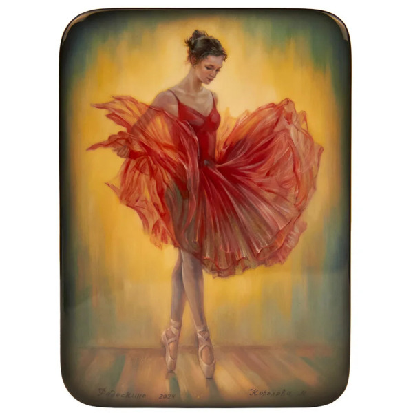 Отличительная черта Федоскинской миниатюры — реализм, достигнутый с помощью сложной многослойной масляной живописи. На эту живописную базу наносятся нежные отблески сусального золота, серебра, перламутра, создавая эффект свечения и глубины. Каждый штрих становится частью величественной композиции, оживающей в плавных переходах света и тени, подчеркивающих тончайшие детали.