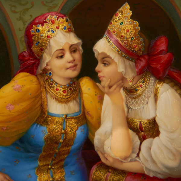 Отличительная черта Федоскинской миниатюры — реализм, достигнутый с помощью сложной многослойной масляной живописи. На эту живописную базу наносятся нежные отблески сусального золота, серебра, перламутра, создавая эффект свечения и глубины. Каждый штрих становится частью величественной композиции, оживающей в плавных переходах света и тени, подчеркивающих тончайшие детали.