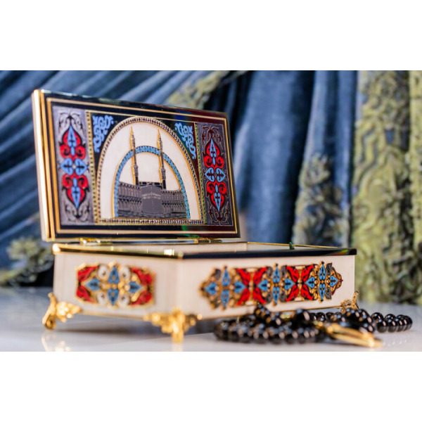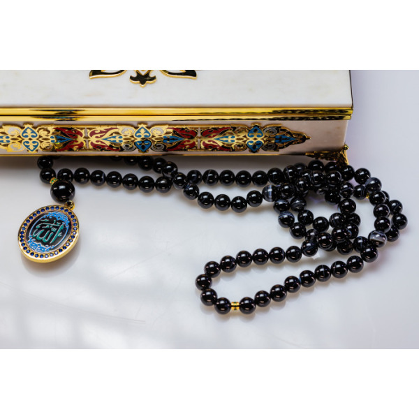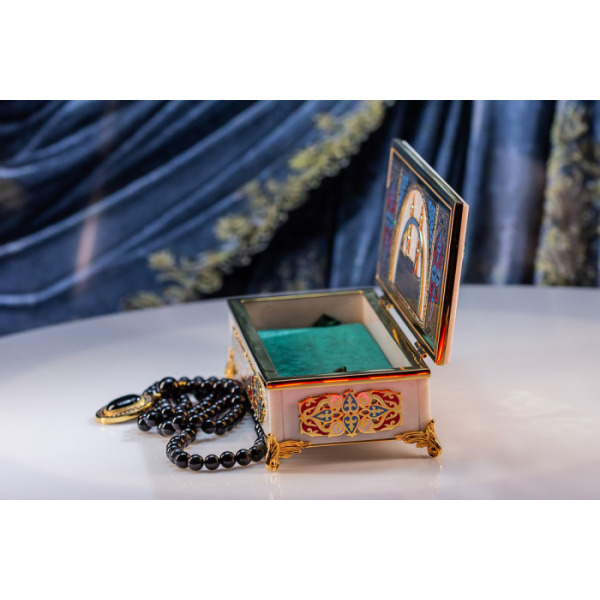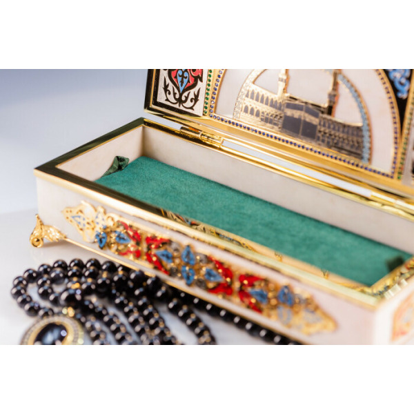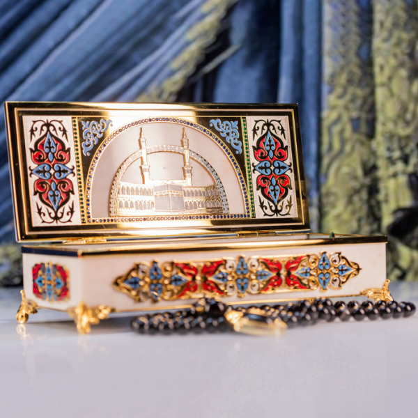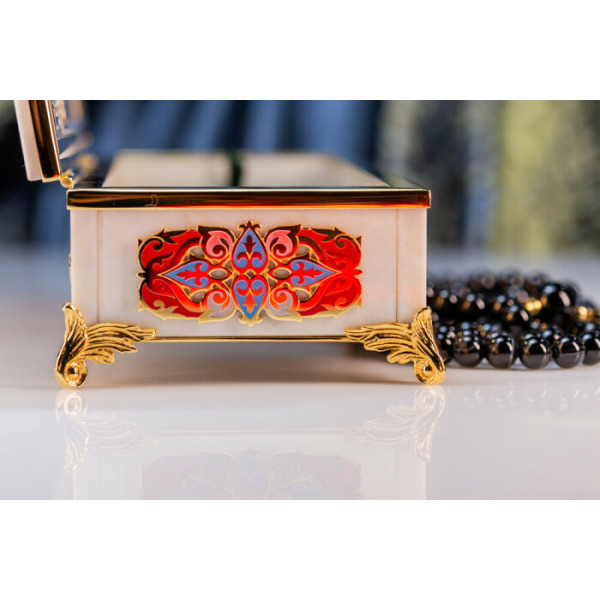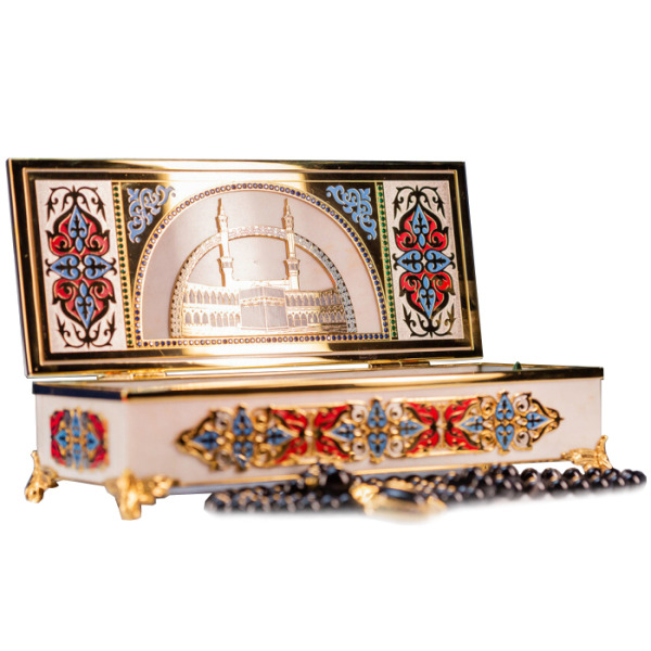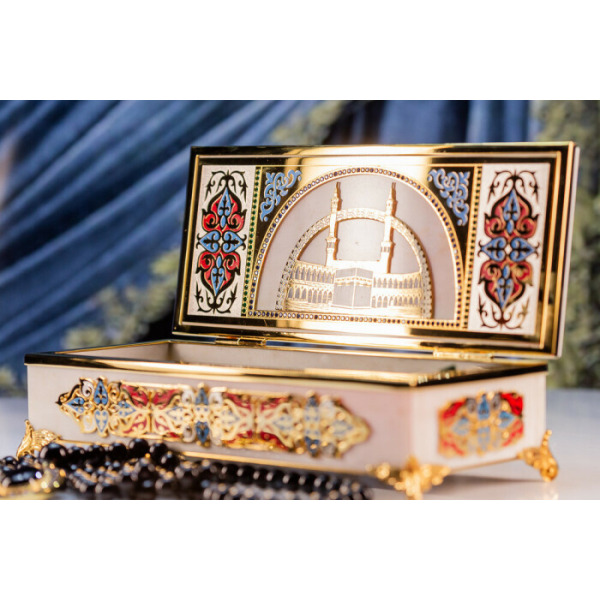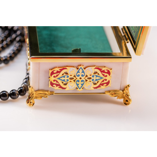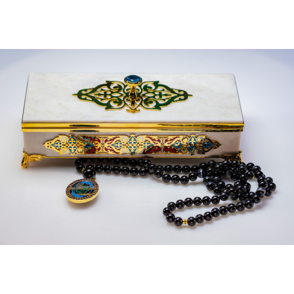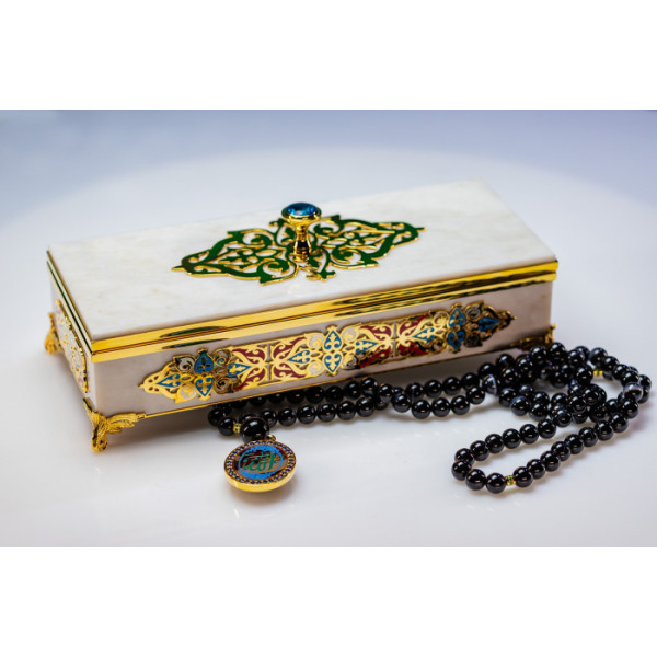 В комплект входят четки с 99 бусинами из благородного камня. Место соединения нити украшено объемным с цветной гравировкой символа Аллаха. Такая шкатулка придется по вкусу ценителям благородной роскоши и глубоких смыслов в деталях.