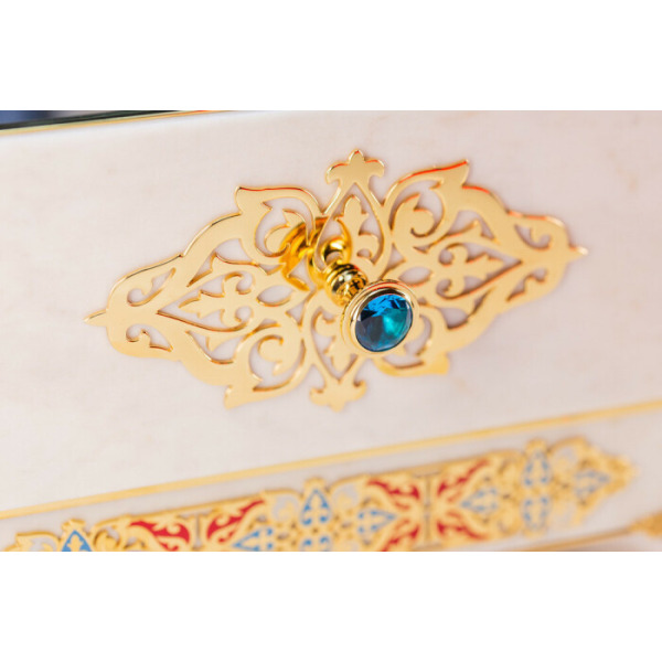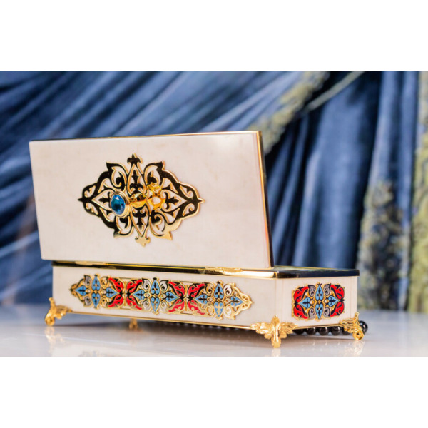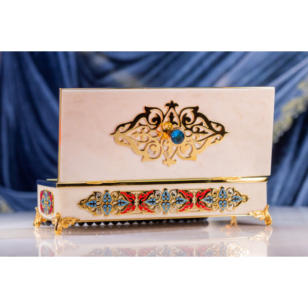 Мраморная шкатулка выполнена в символичных для Ислама цветах. Белый, который придает основанию изделия сама текстура благородного камня, считается цветом святости, достоинства, лучших качеств. Традиционные восточные орнаменты в красных, голубых и желтых тонах обрамляют фасад и внутреннюю сторону крышки шкатулки. Ее внешняя сторона дополнена позолоченной вставкой, увенчанной крупным агатом.