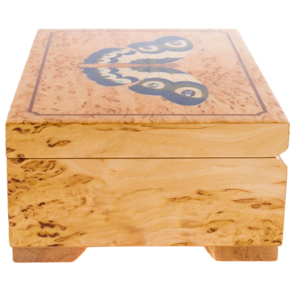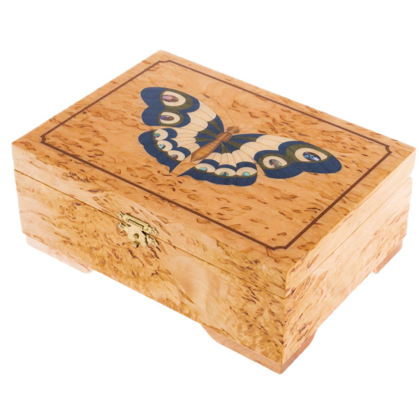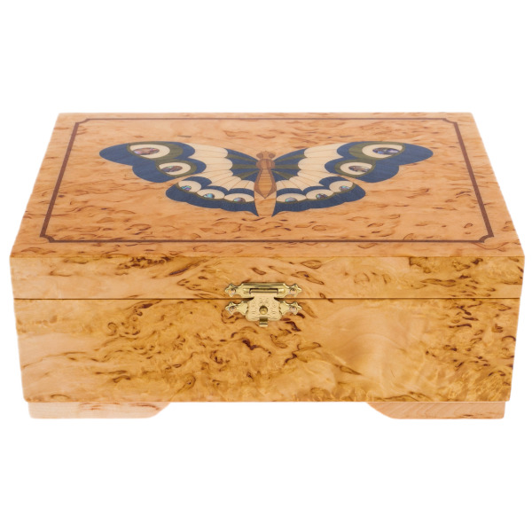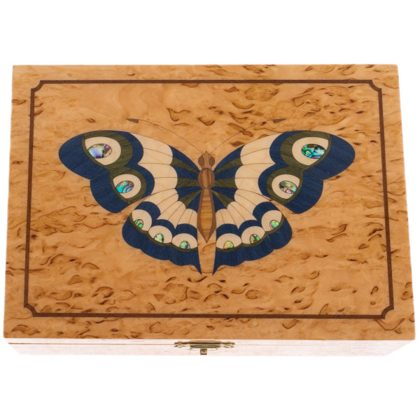 На крышке шкатулки, словно порхая на лёгком ветру, застыла бабочка — аллегория души, свободы и возрождения. Инкрустация выполнена с филигранной точностью, каждый оттенок и линия гармонично вплетаются в общий рисунок. Сияние полировки древесины подчеркивает контраст цветов, создавая ощущение живого дыхания природы.