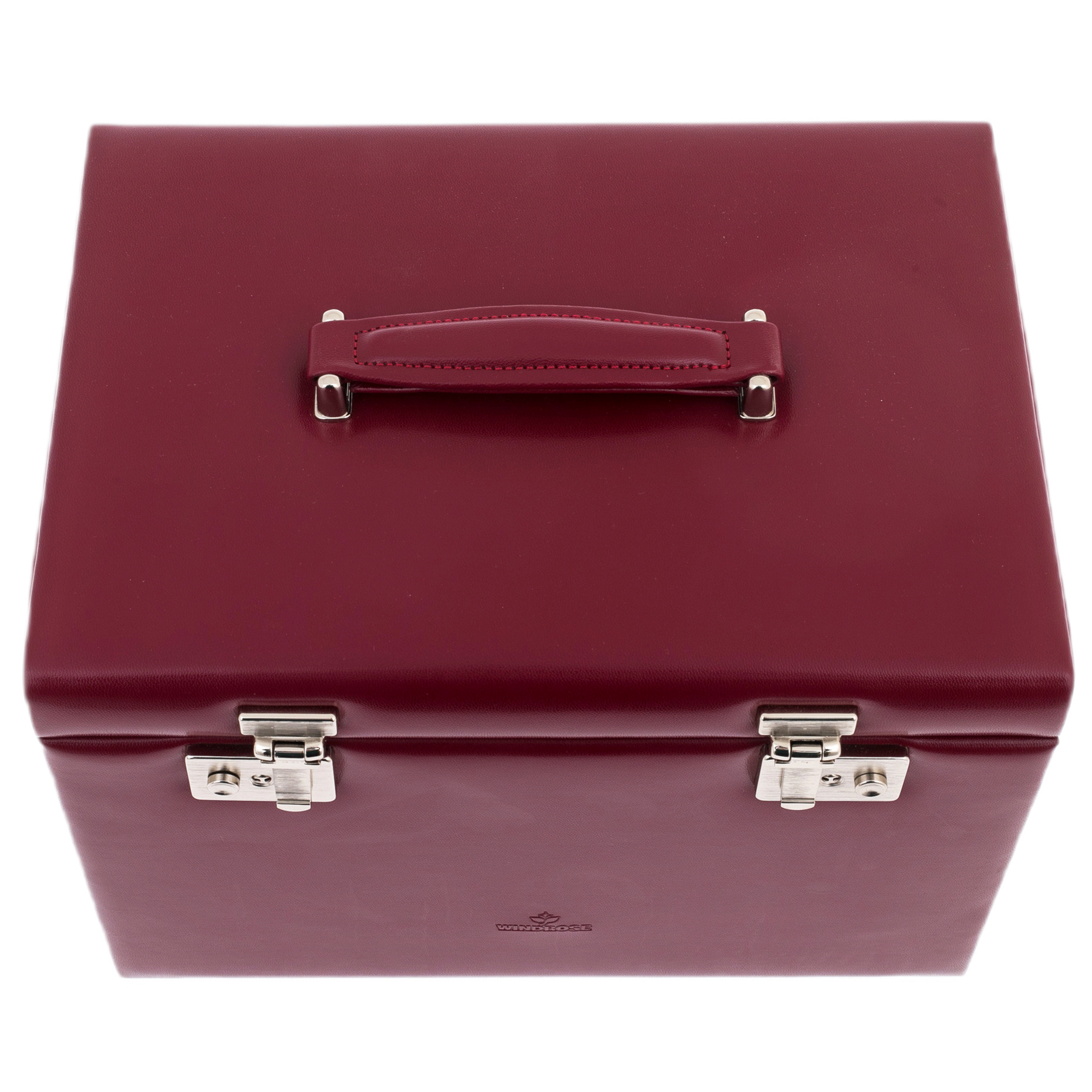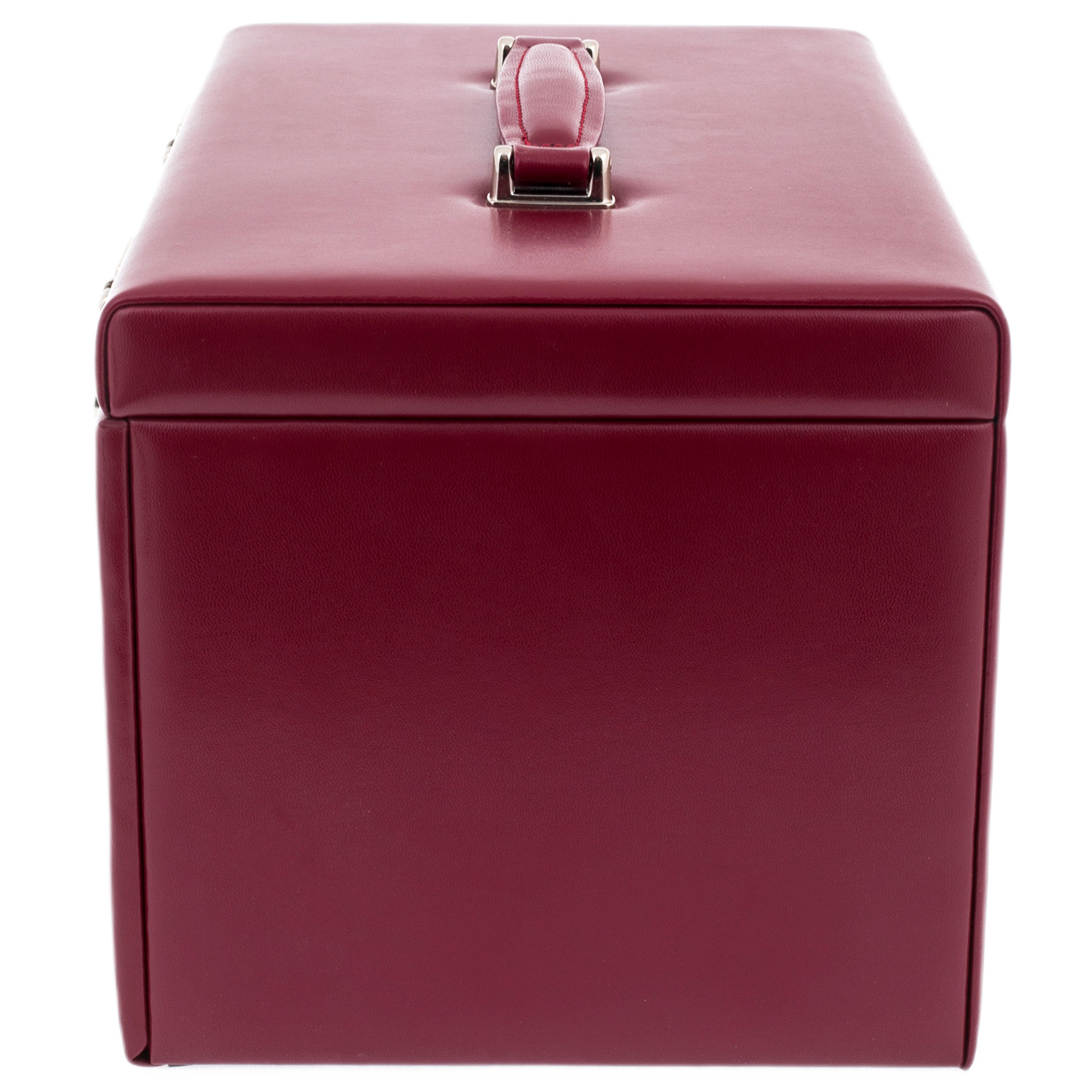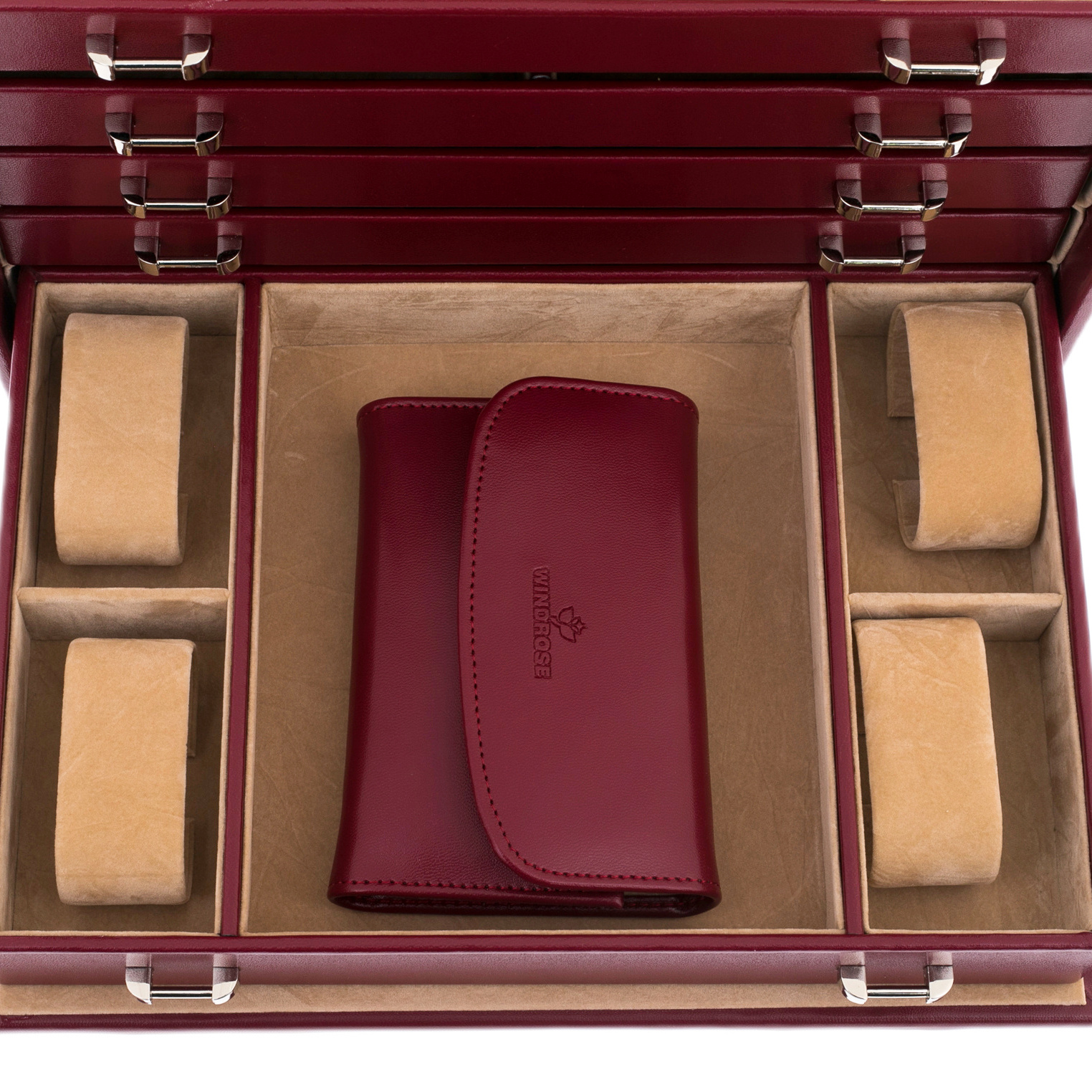 Внутреннее пространство продумано до мелочей: пять выдвижных ярусов открывают обширные отсеки, предназначенные для колец, серёг, часов и цепочек. Центральное отделение включает миниатюрную дорожную шкатулку, вложенную в углубление нижнего яруса — решение, уместное в путешествиях и командировках. Верхняя крышка, дополненная овальным зеркалом и кожаными держателями для цепочек, создаёт атмосферу личного будуара, где каждая деталь подчинена эстетике и удобству. Обивка из замши оттенка топлёного молока не только подчёркивает контраст с бордовым внешним слоем, но и бережно защищает содержимое от царапин и пыли.