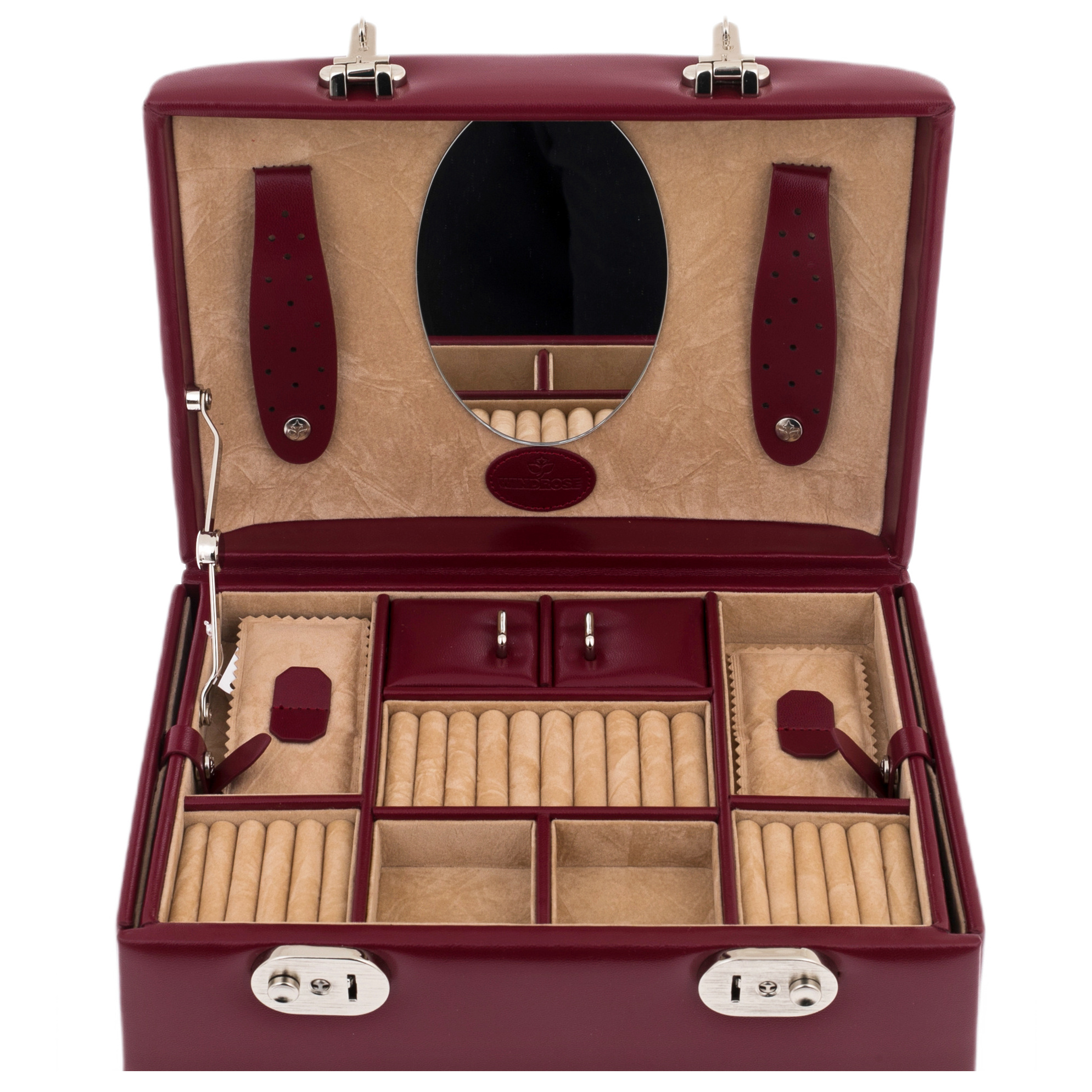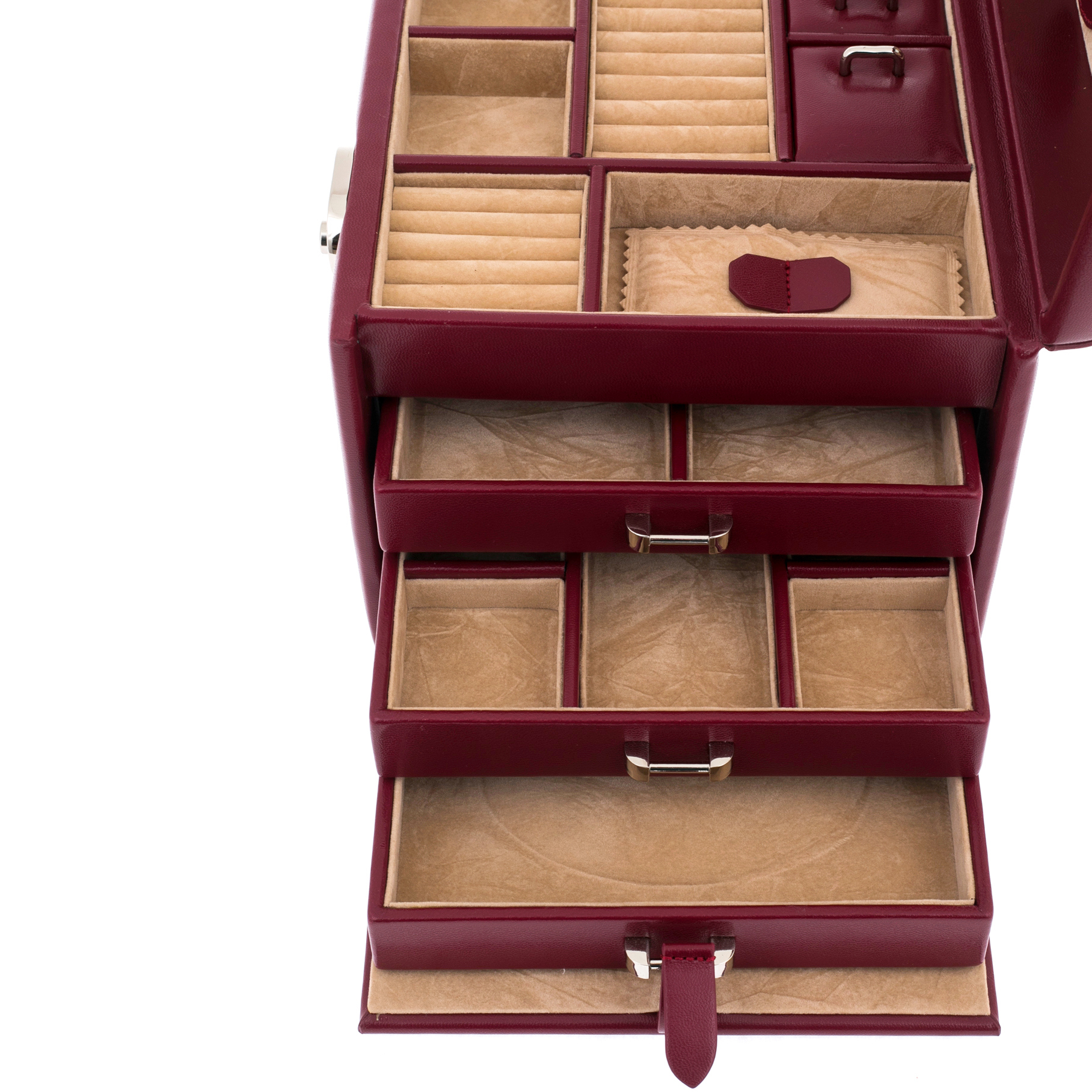 Под крышкой скрыт овал зеркала в раме, обрамлённой двумя ремешками для подвесок и серёг. Центральный отсек, разделённый множеством секций, предназначен для колец, брошей и мелких аксессуаров. Четыре выдвижных яруса включают в себя разнообразные отделения: глубокие секции для крупных украшений, ячейки для цепочек, мягкие валики для браслетов, а также специальные ремешки с кнопками для серёжек. Каждое отделение подогнано с точностью и продуманностью, достойной истинного ювелирного мастера. Металлическая фурнитура с зеркальным блеском подчёркивает статус изделия и гарантирует надёжность в повседневном использовании.