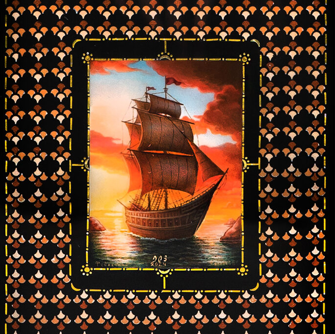 Отличительная черта Федоскинской миниатюры — реализм, достигнутый с помощью сложной многослойной масляной живописи. На эту живописную базу наносятся нежные отблески сусального золота, серебра, перламутра, создавая эффект свечения и глубины. Каждый штрих становится частью величественной композиции, оживающей в плавных переходах света и тени, подчеркивающих тончайшие детали.