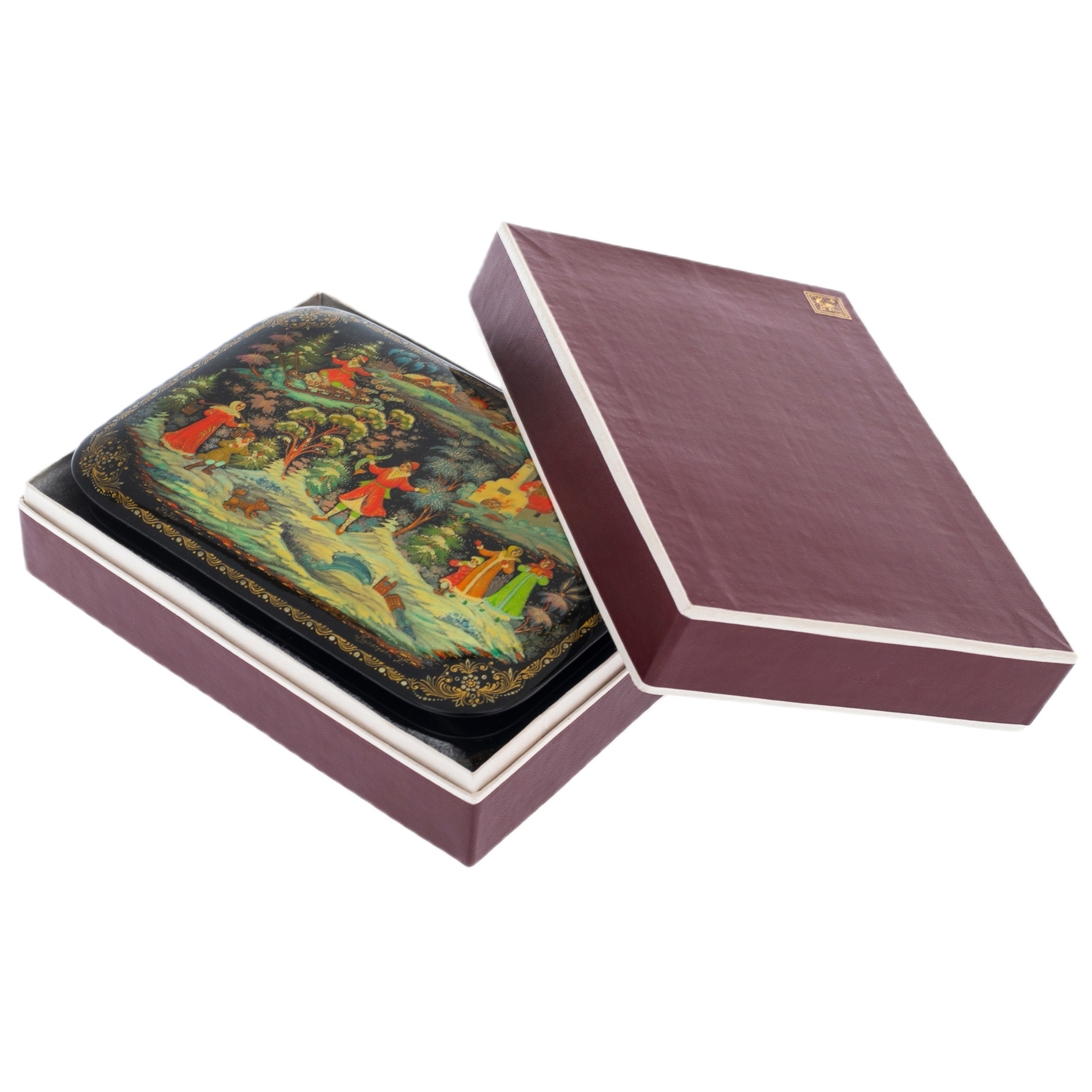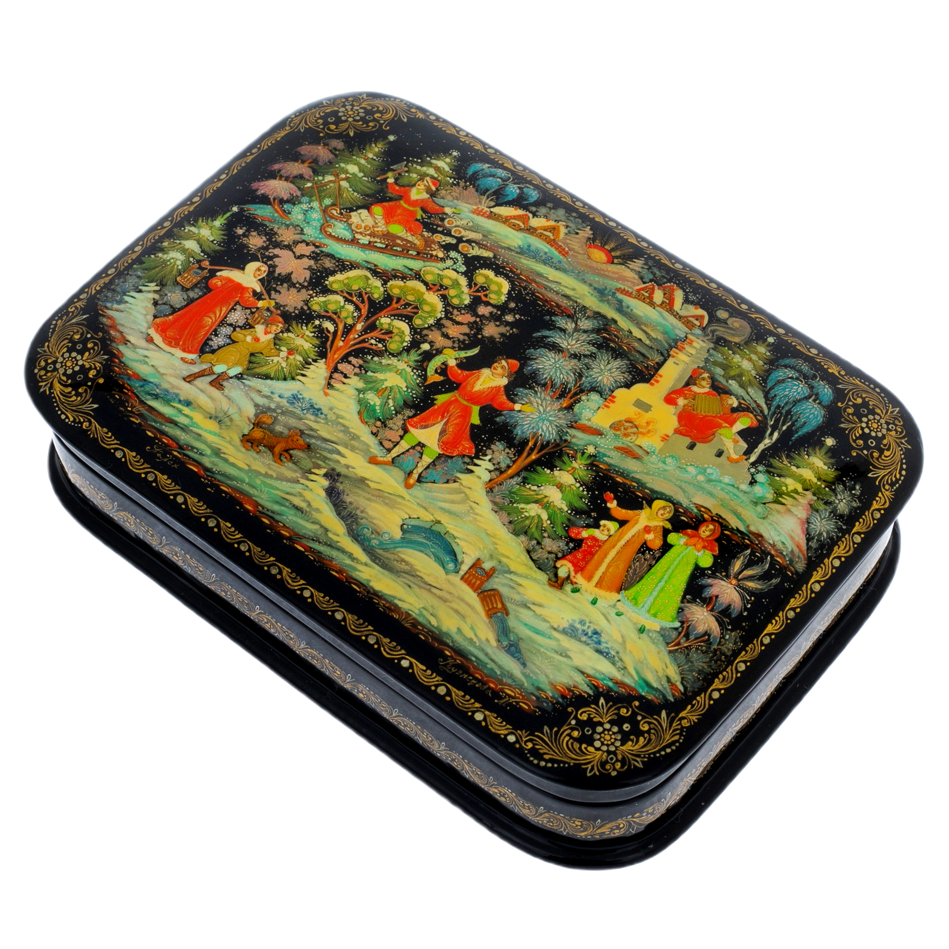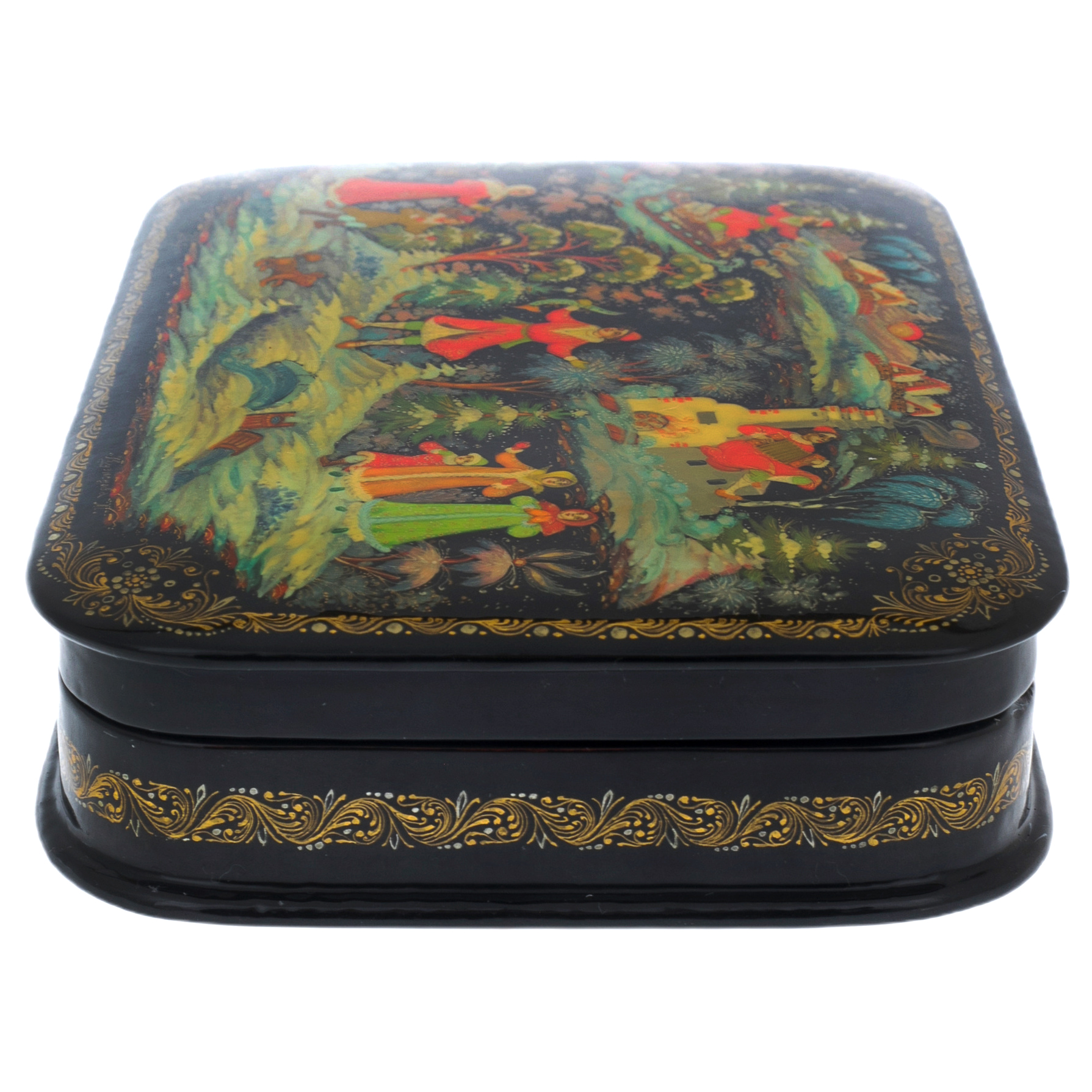 Главная сцена на крышке погружает в атмосферу русского волшебного леса: Емеля, с его добродушием и простой хитростью, идет навстречу своей судьбе. Здесь природа — не просто фон, но полноценный герой. Леса, пышные деревья и пылающий закат словно вырастают из сна, украшая собой древние предания. Каждая деталь — от изгибов речных потоков до мельчайших штрихов одежды персонажей — выполнена с филигранной точностью. Золотая роспись обрамляет композицию, напоминая древнерусский узорчатый шов, добавляя торжественности и изящества.