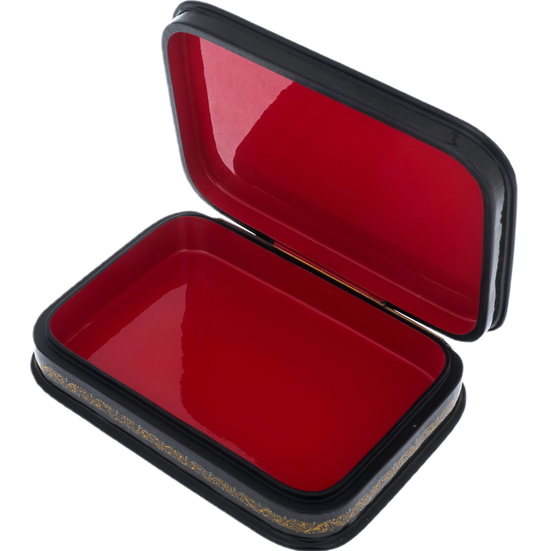 Внутри шкатулки скрывается алый простор, сияющий лаком, словно символизирующий сердце, полное страсти и эмоций. Этот насыщенный красный цвет усиливает ощущение роскоши, превращая каждый момент взаимодействия с изделием в истинное удовольствие. Гладкость внутренних стенок манит прикоснуться, а идеальная отделка говорит о мастерстве, переданном через поколения художников.