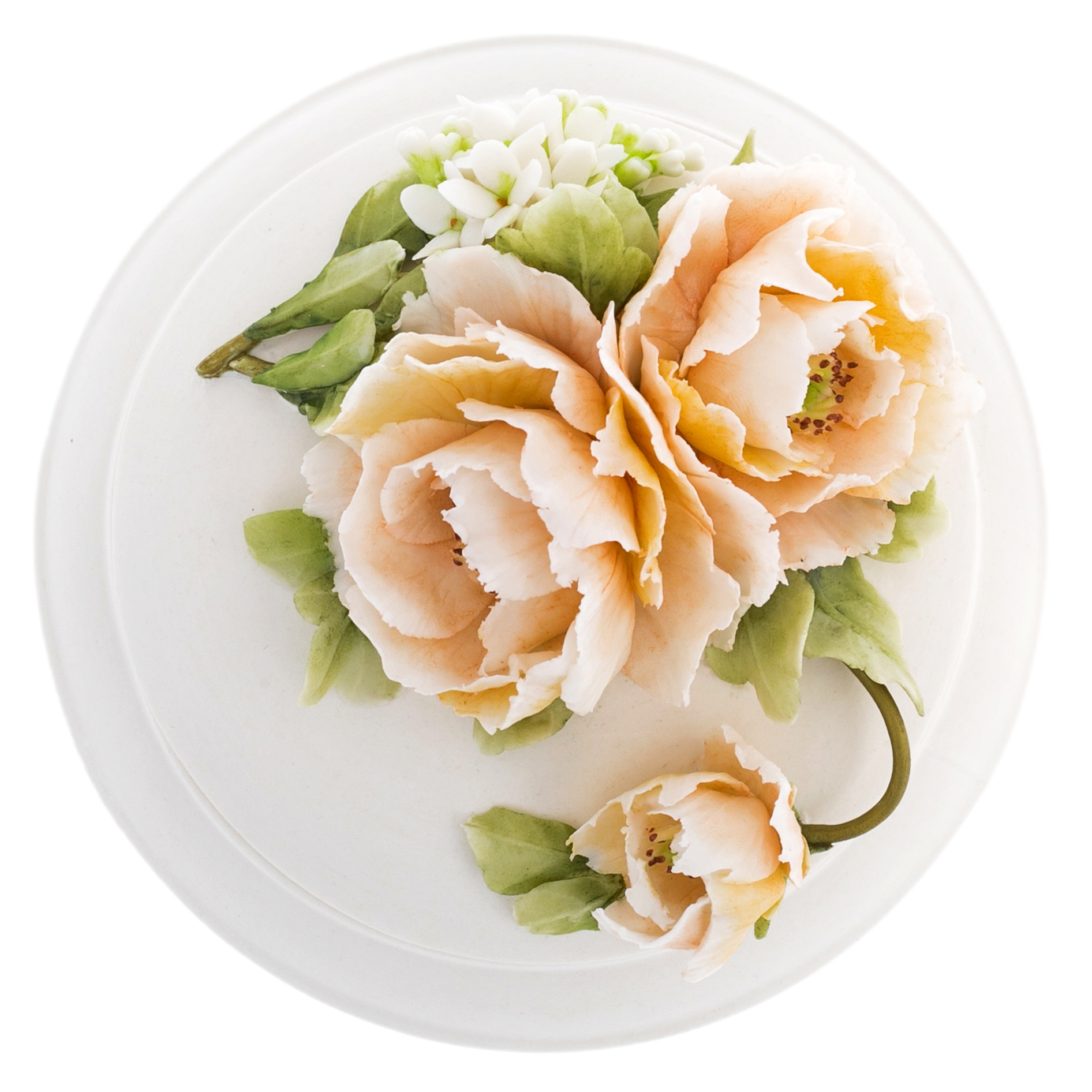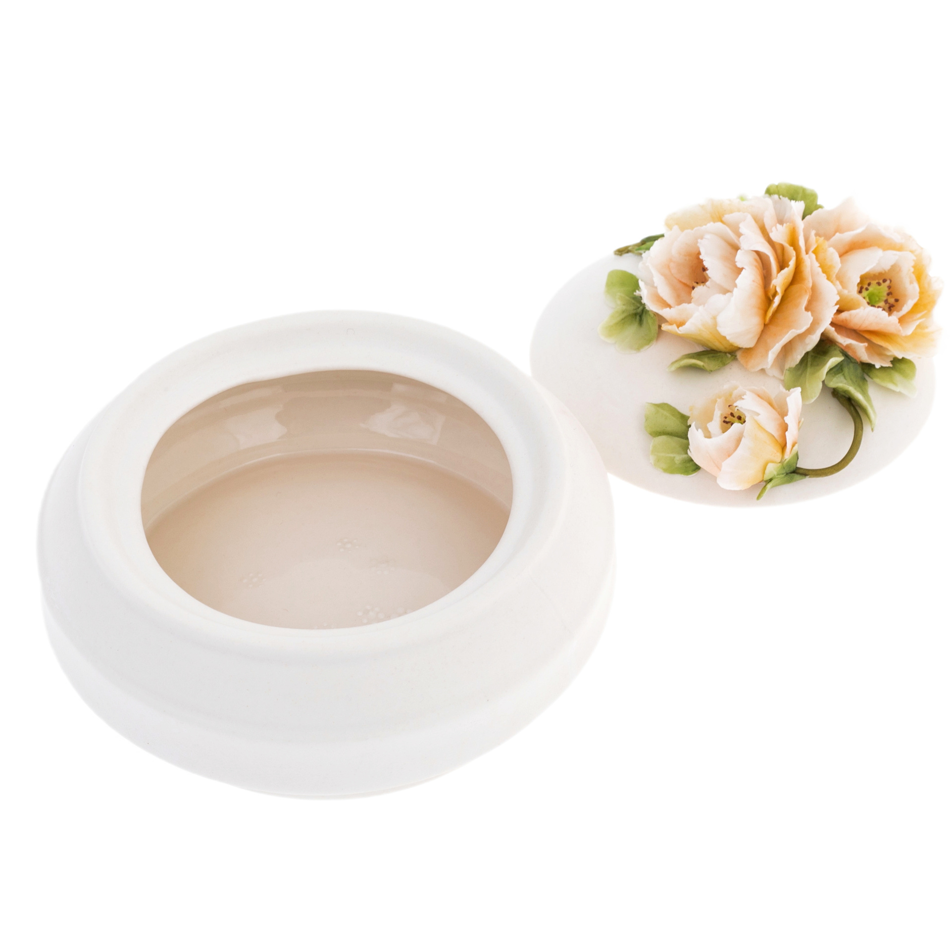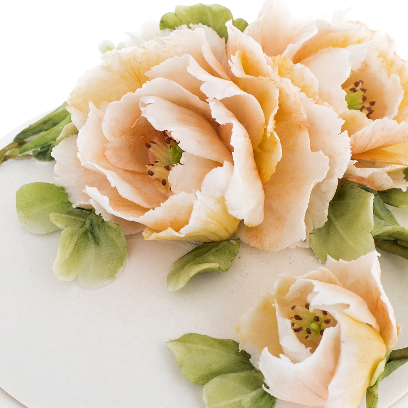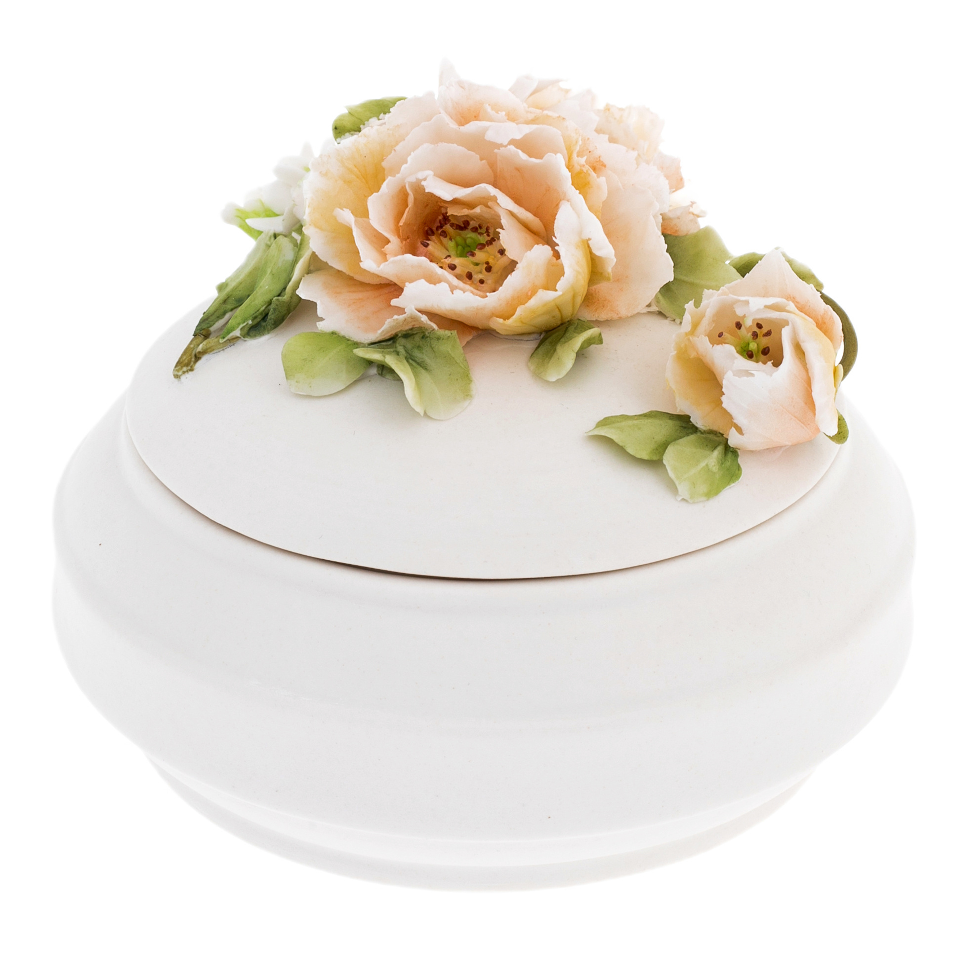 Над цветами работали мастера высокой фарфоровой лепки, филигранно вырезавшие каждый лепесток вручную. Полупрозрачные оттенки персика и зелени нанесены вручную, придавая цветам живость и хрупкость. Матовая поверхность корпуса контрастирует с глянцевой внутренней глазурью, создавая гармоничный диалог формы и текстуры. Подобное сочетание подчёркивает ручной характер изделия и превращает его в произведение декоративного искусства, достойное музейной полки или личной коллекции.