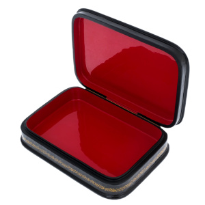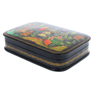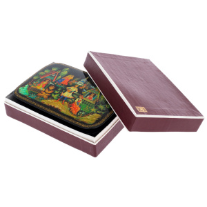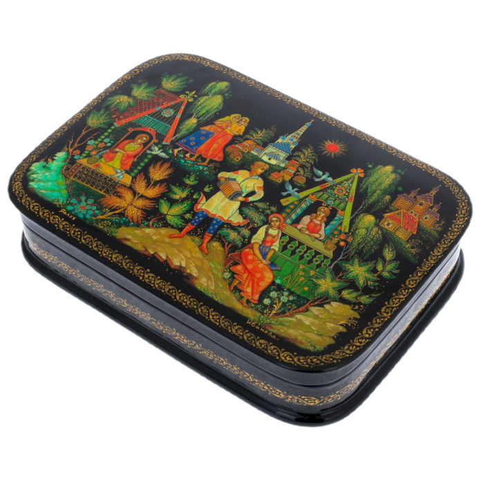 Это произведение палехских мастеров, выполненное в технике традиционной лаковой миниатюры, изначально создававшейся для самых взыскательных ценителей русского искусства. Корпус шкатулки формируется из прочной папье-маше, проходящего многоступенчатую сушку и покрываемого глубоким чёрным лаком, создающим эффект бездонной глянцевой поверхности. Внутреннее пространство выстлано густым красным лаком, контрастирующим с тёмным внешним блеском и подчёркивающим ощущение камерной драгоценности.