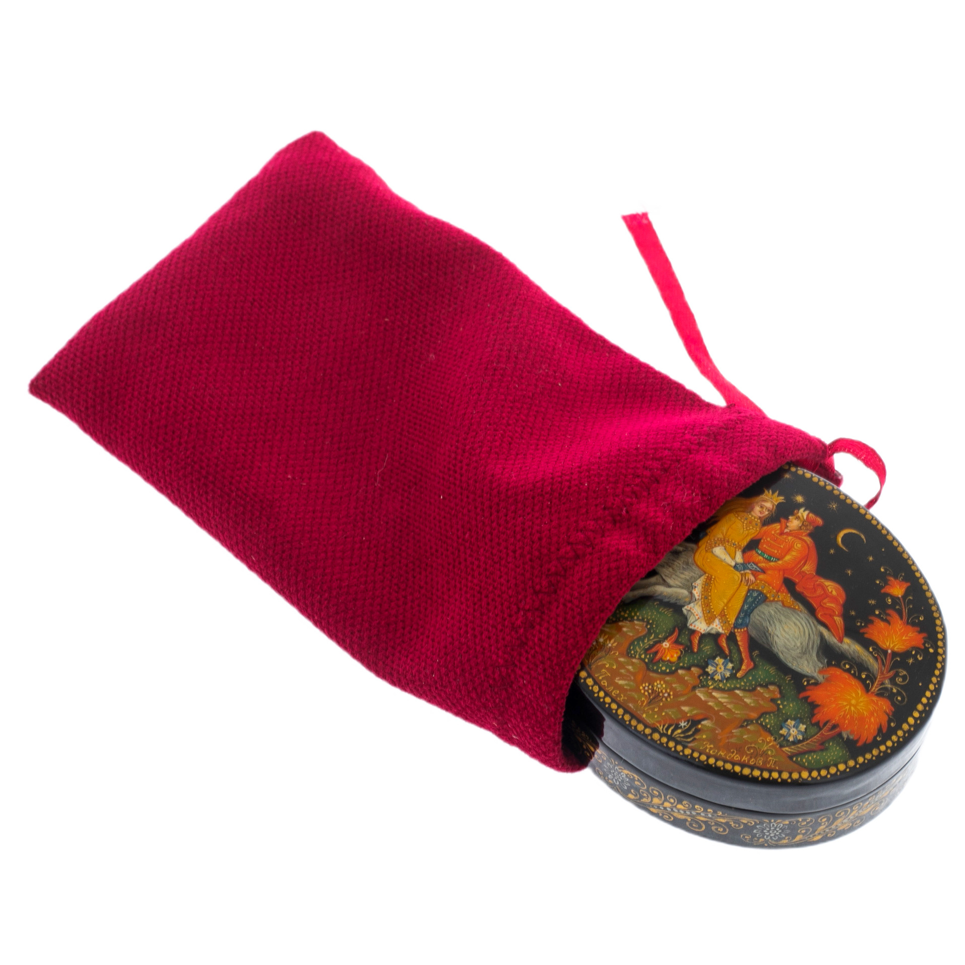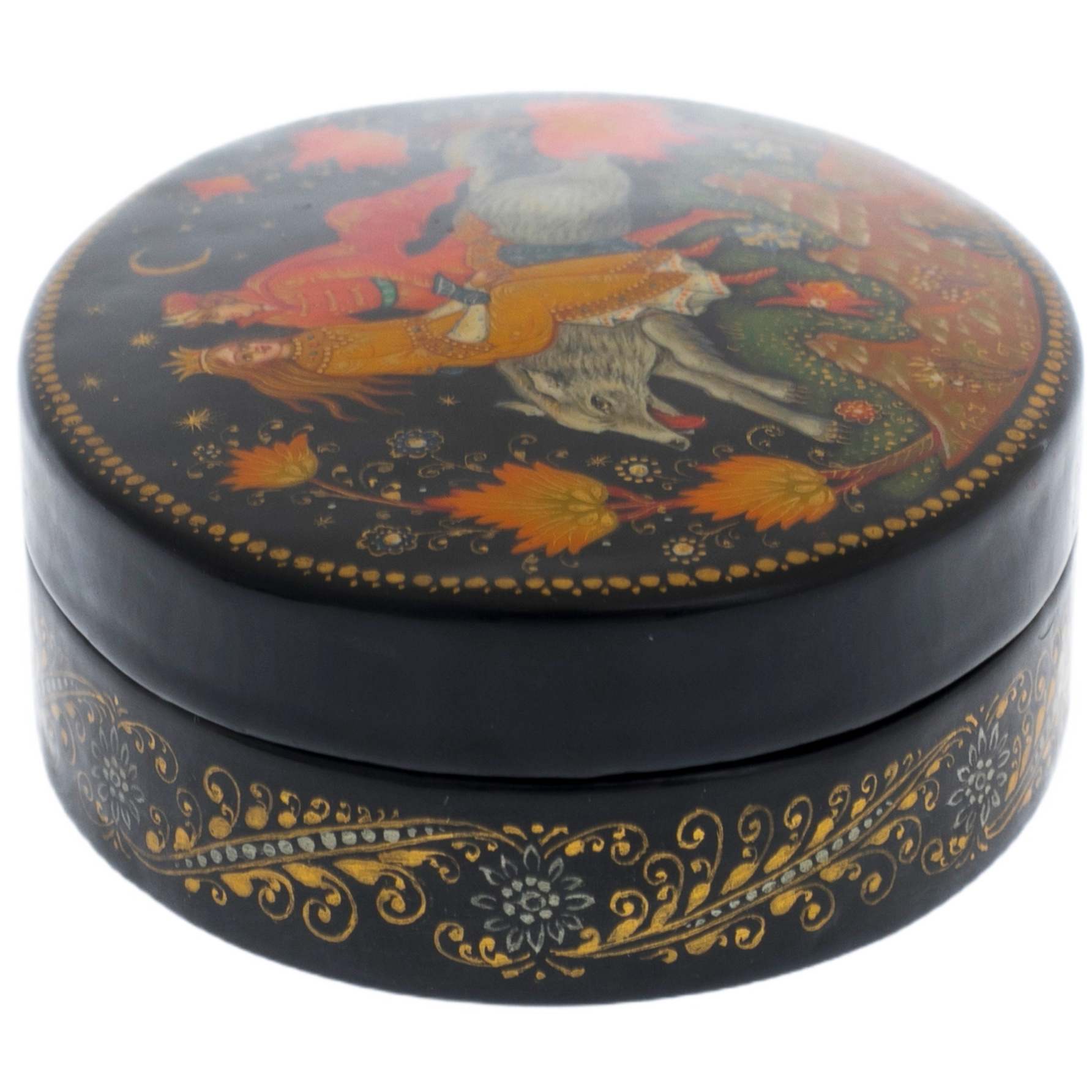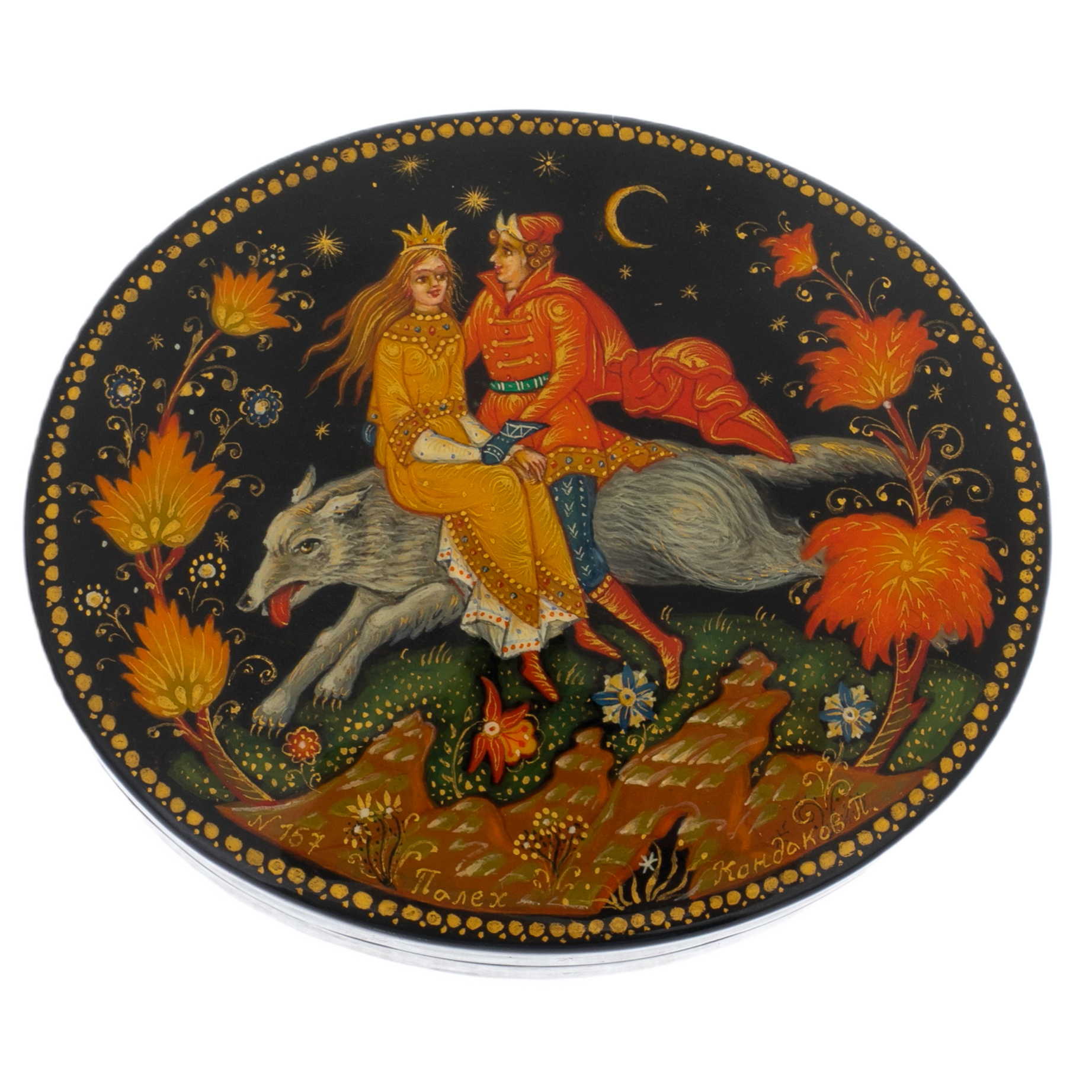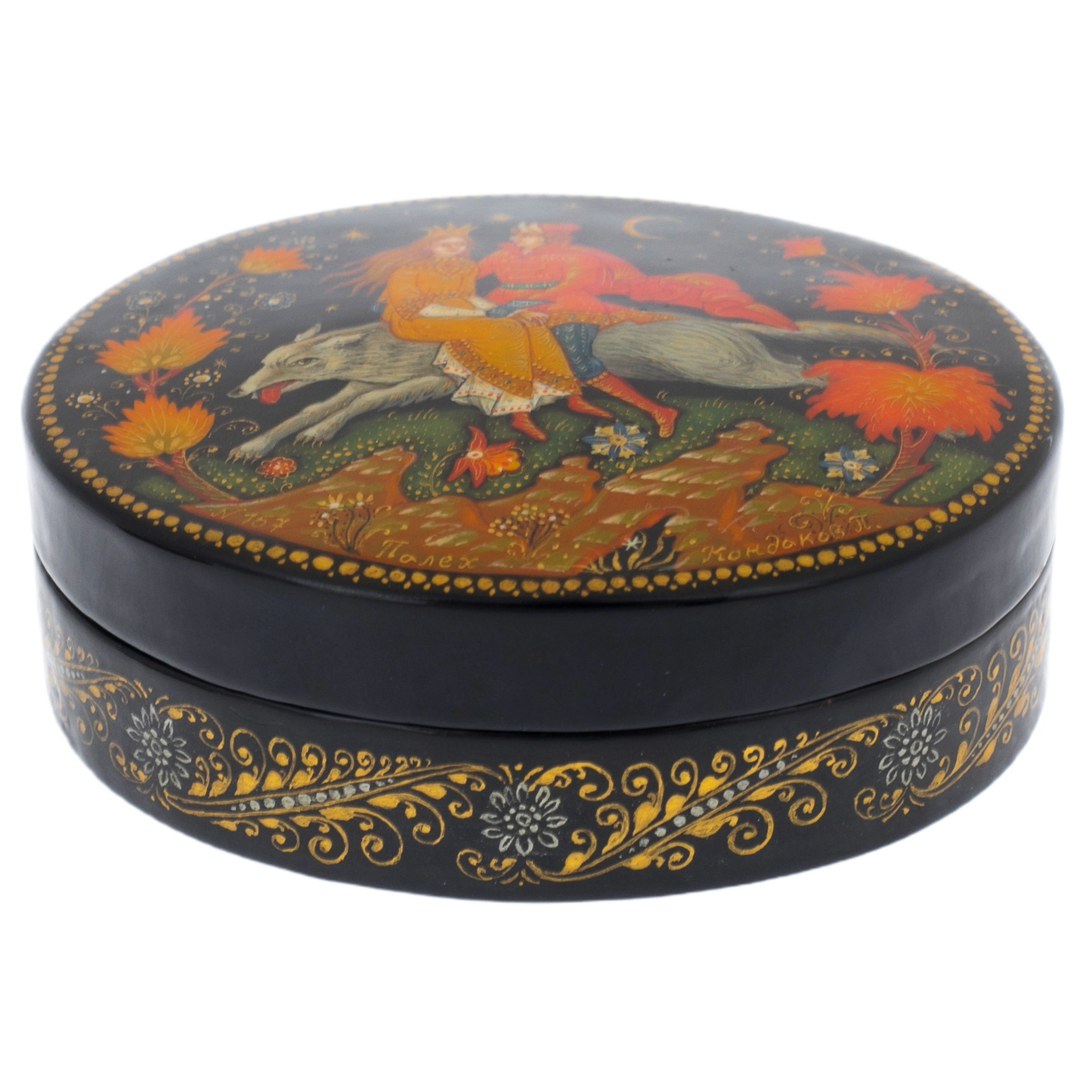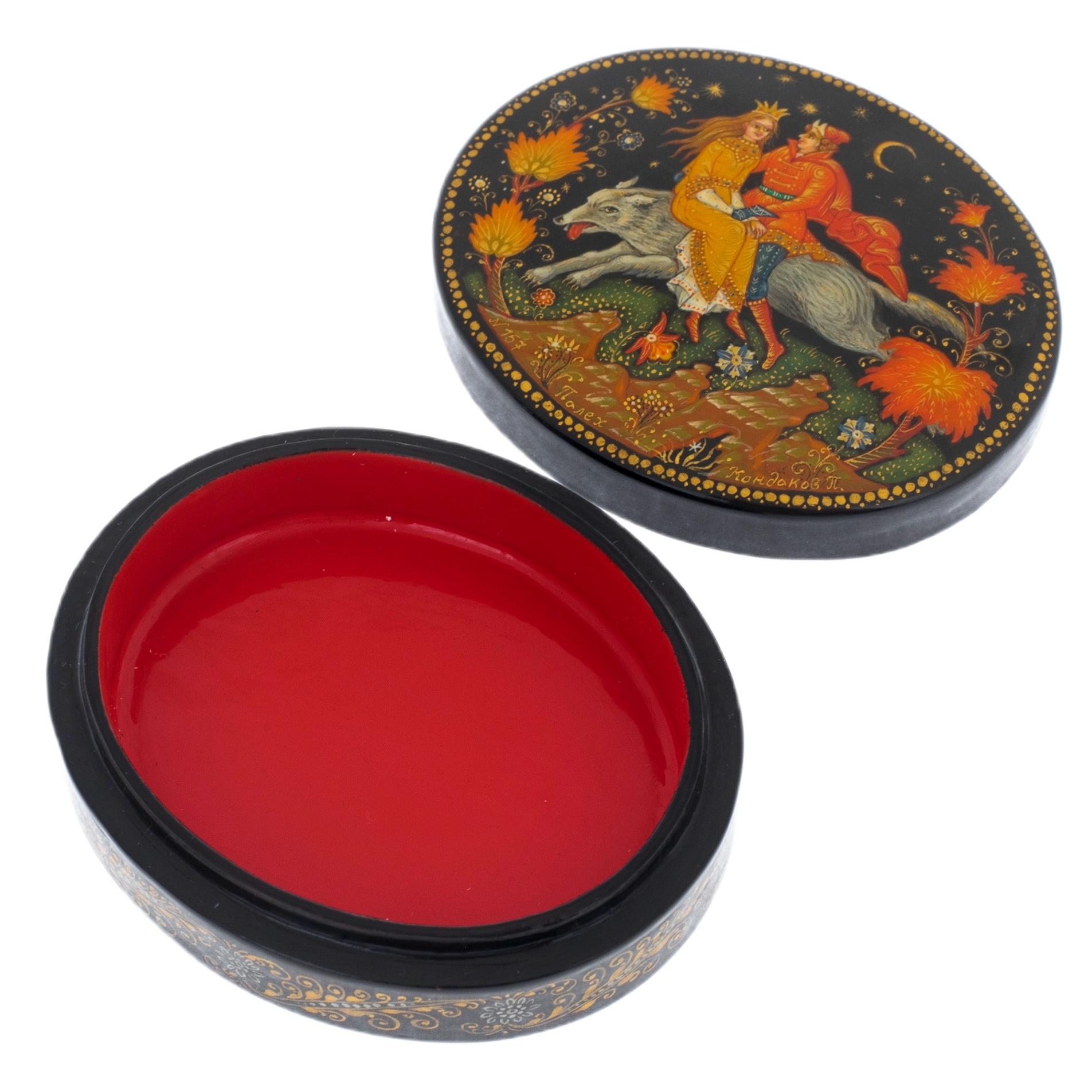 На крышке шкатулки изображены Иван Царевич с Василисой Прекрасной и Серый Волк, олицетворяющие храбрость, любовь и верность. Их динамичные позы, полные жизни и эмоций, словно приглашают вас в мир чудес и волшебства. Иван, с решимостью на лице, и Василиса, излучающая красоту и грацию, вместе с Серым Волком, символизирующим верность и защиту, создают гармоничную композицию, которая пробуждает в душе ощущение сказки. Каждый штрих художника, каждое движение персонажей, пронизанное духом древних легенд, оживает на глазах, создавая атмосферу, полную надежды и вдохновения. Эта сцена напоминает о том, что настоящая сила заключается в единстве, а любовь и дружба способны преодолеть любые преграды.