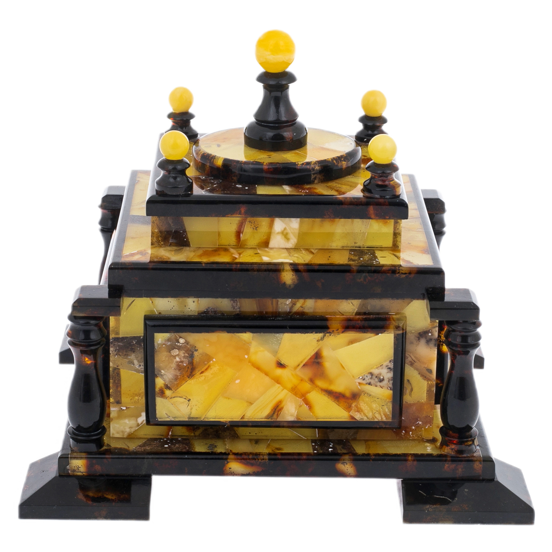 Шкатулка из янтаря «Лувр» — это архитектурное произведение в миниатюре, созданное руками мастера с глубоким уважением к формам европейской классики. Сложносочинённая композиция, напоминающая очертания дворца эпохи Людовика XIV, построена из полированных янтарных пластин, вручную собранных в мозаичный узор. Поверхность играет всеми оттенками солнечного камня — от светлого лимонного до густо-коньячного, с включениями, создающими эффект глубины и драгоценного свечения. Каждая грань выверена до совершенства, каждый элемент — от ступенчатого постамента до миниатюрных колонн — отсылает к образам антикварной роскоши.