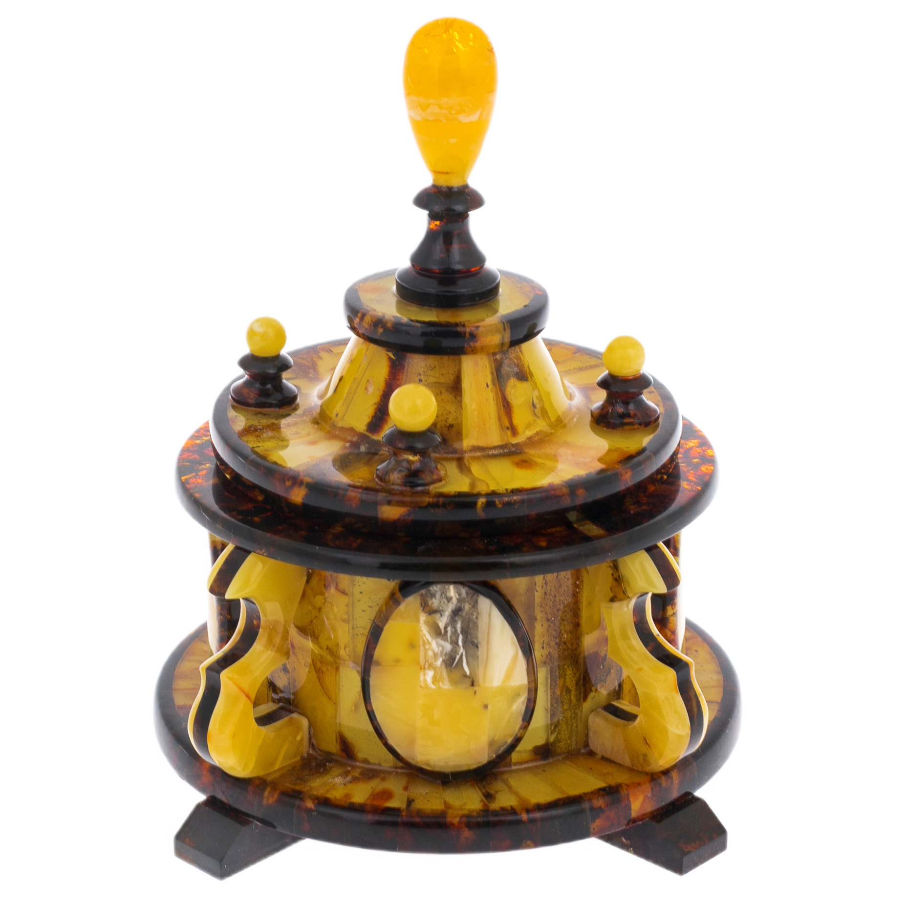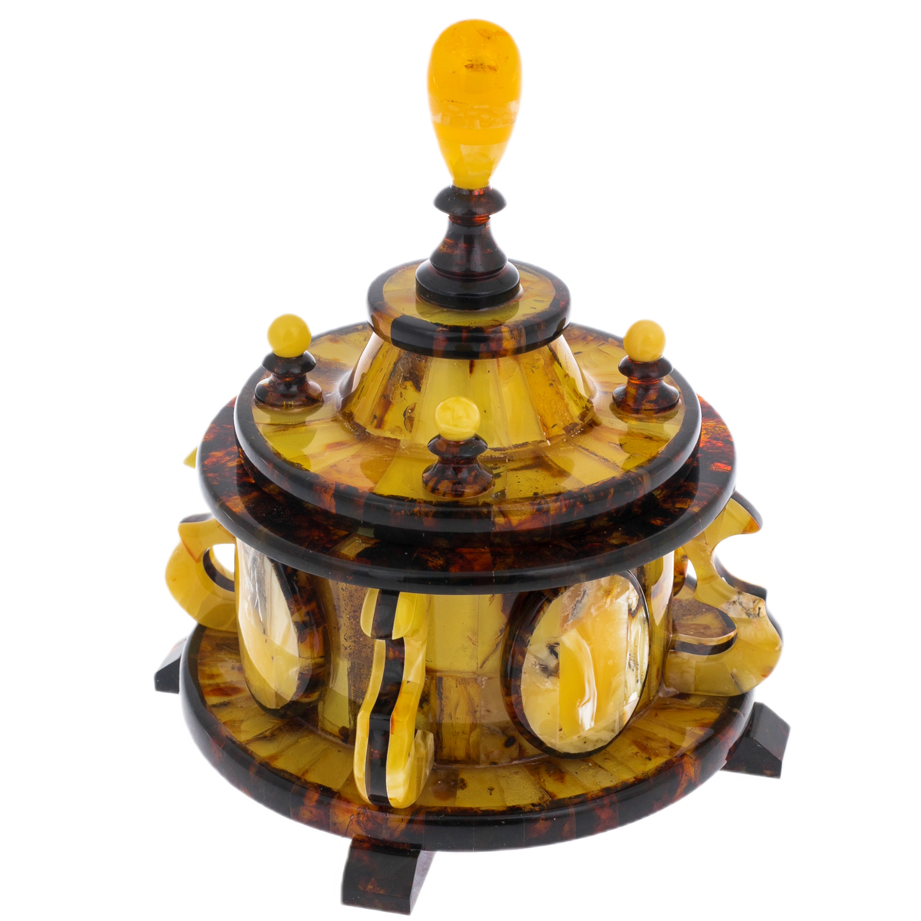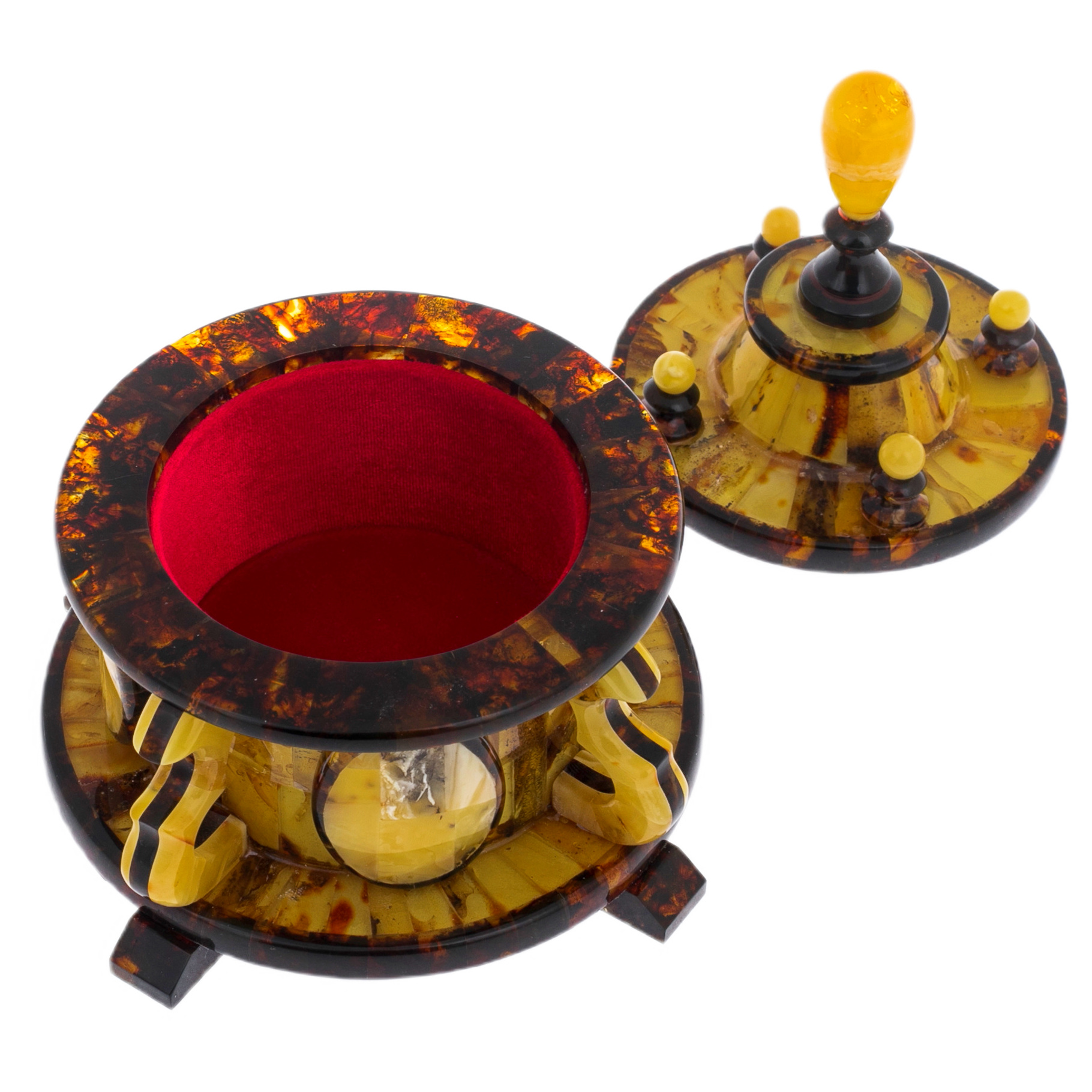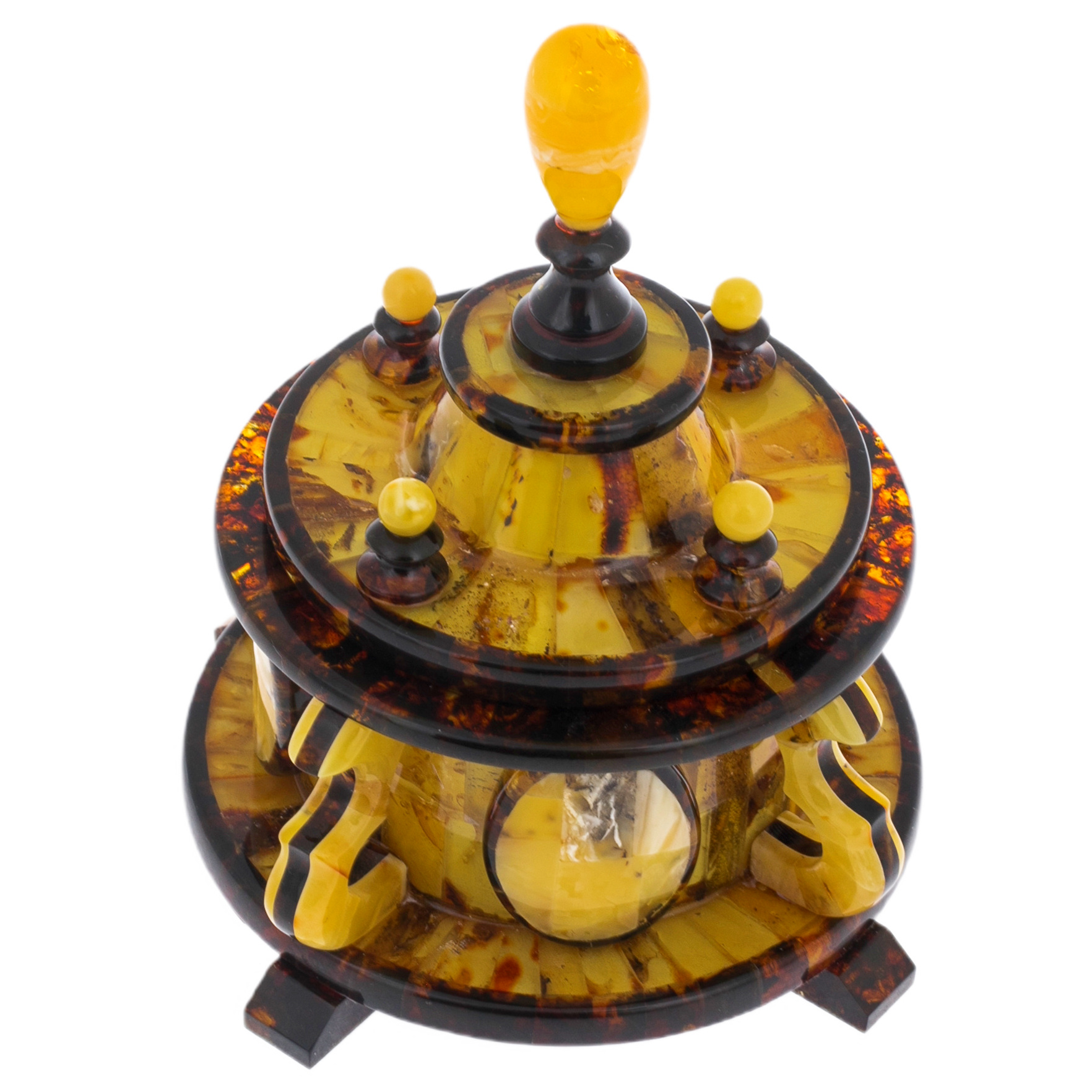 Куполообразная крышка увенчана янтарным шпилем, словно солнце, поднимающееся над восточным городом. Величественная форма, усиленная игрой полутонов и текстур, создаёт ощущение, будто перед вами настоящий древний артефакт, пропитанный историей. Вставки из янтаря разных оттенков формируют сложную мозаичную композицию, перетекающую от тёплого золотистого сияния к глубокому медово-каштановому оттенку. Каждый элемент конструкции отточен до совершенства, подчёркивая высокое мастерство резчиков.