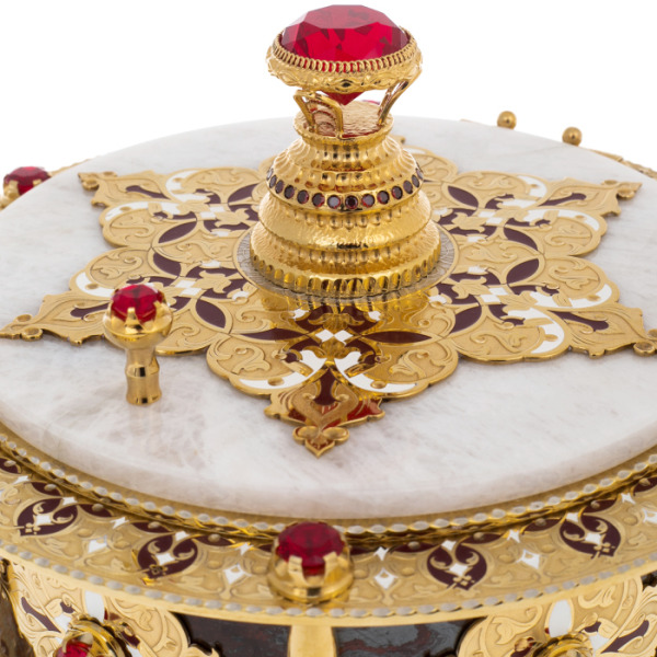 Металл, щедро покрытый позолотой, дополнен тончайшей гравировкой, в которую вплетены эмалевые вставки, сияющие в сочетании с рубиновыми кристаллами. Каждая грань, каждая деталь — от колонн, поддерживающих корпус, до миниатюрных розеток по ободу — создает ощущение совершенного ритуального предмета, рожденного на стыке искусства, символизма и ювелирной точности. Внутреннее пространство украшено повторяющимся узором в золотых и красных оттенках, что делает даже скрытую часть изделия произведением высокой декоративной культуры.