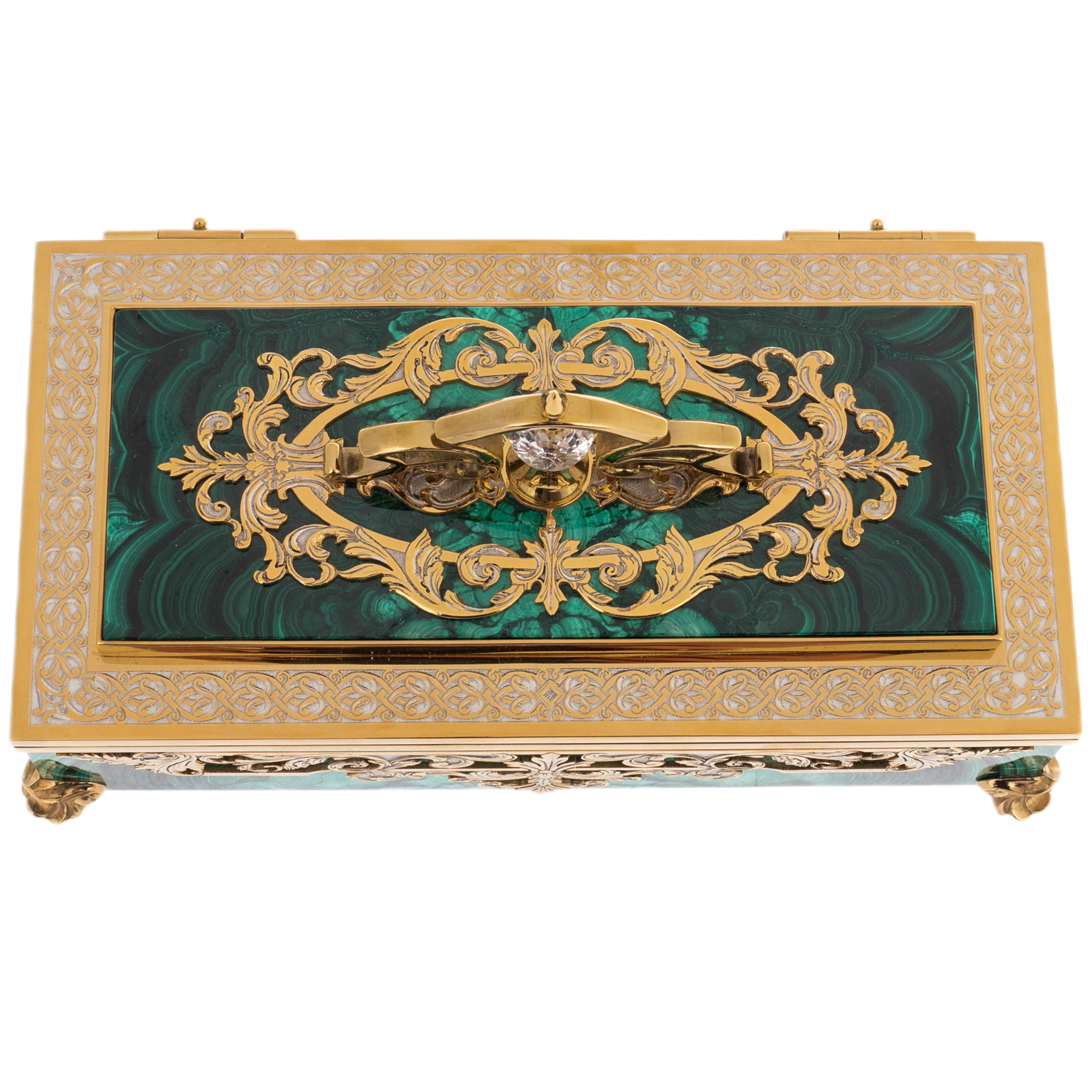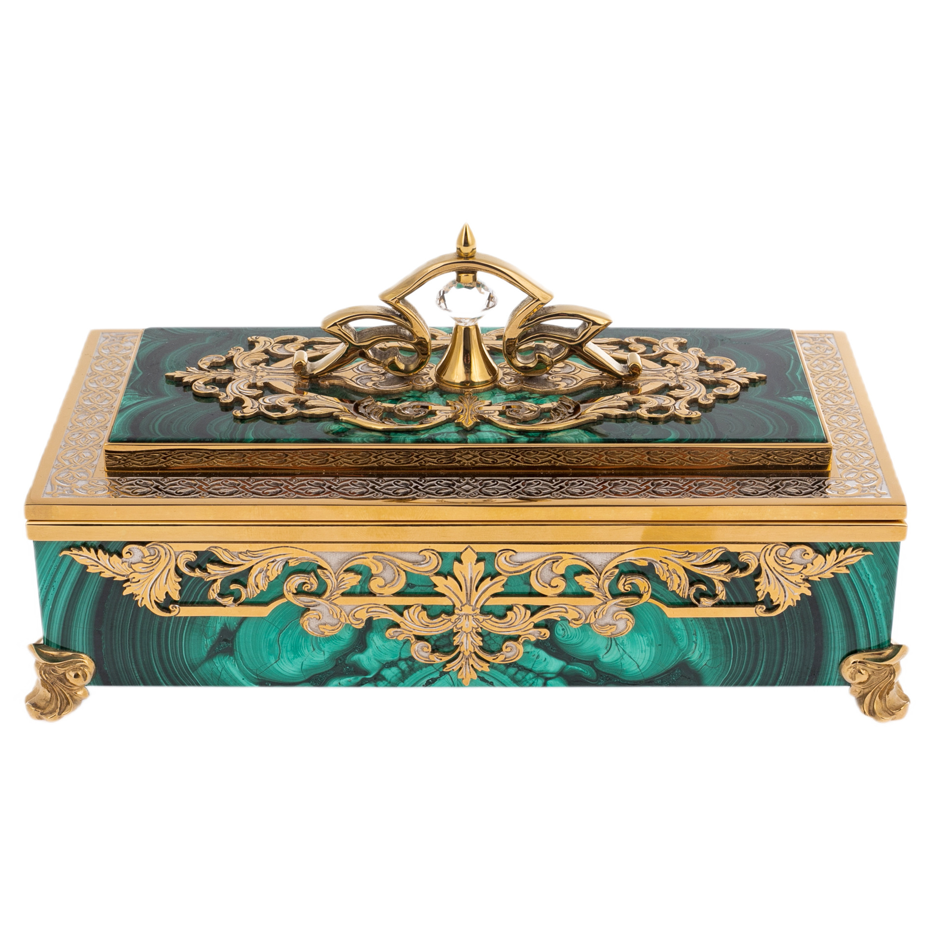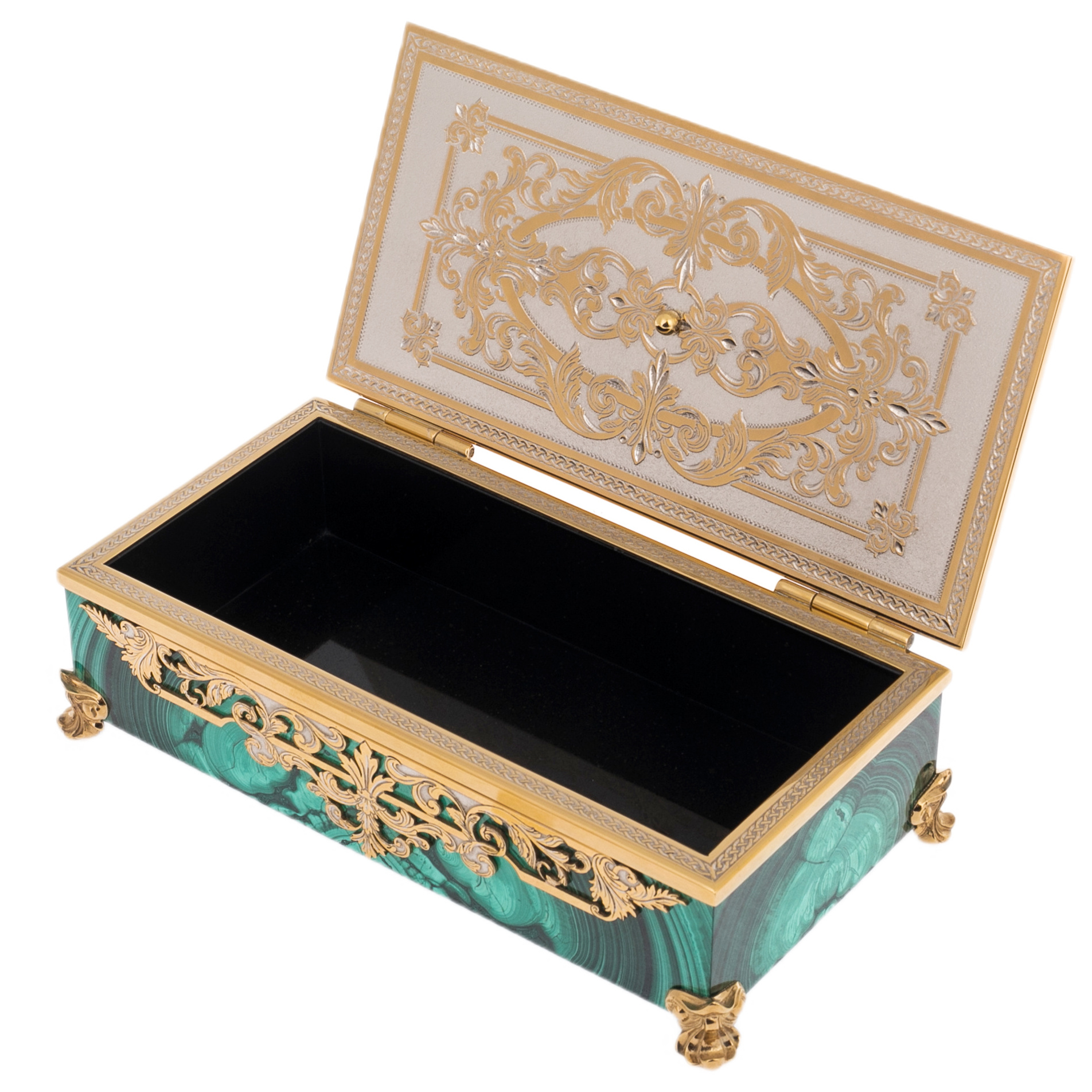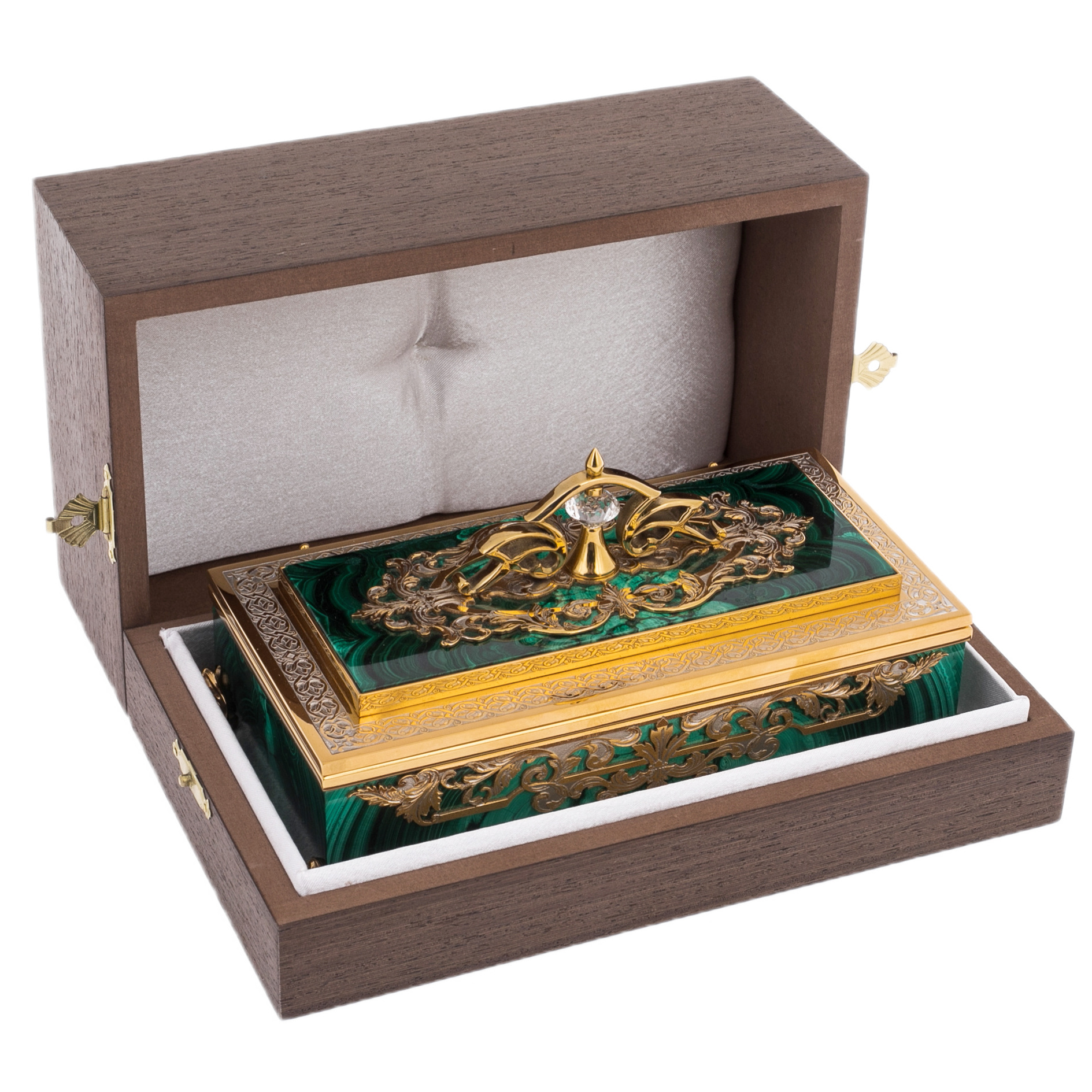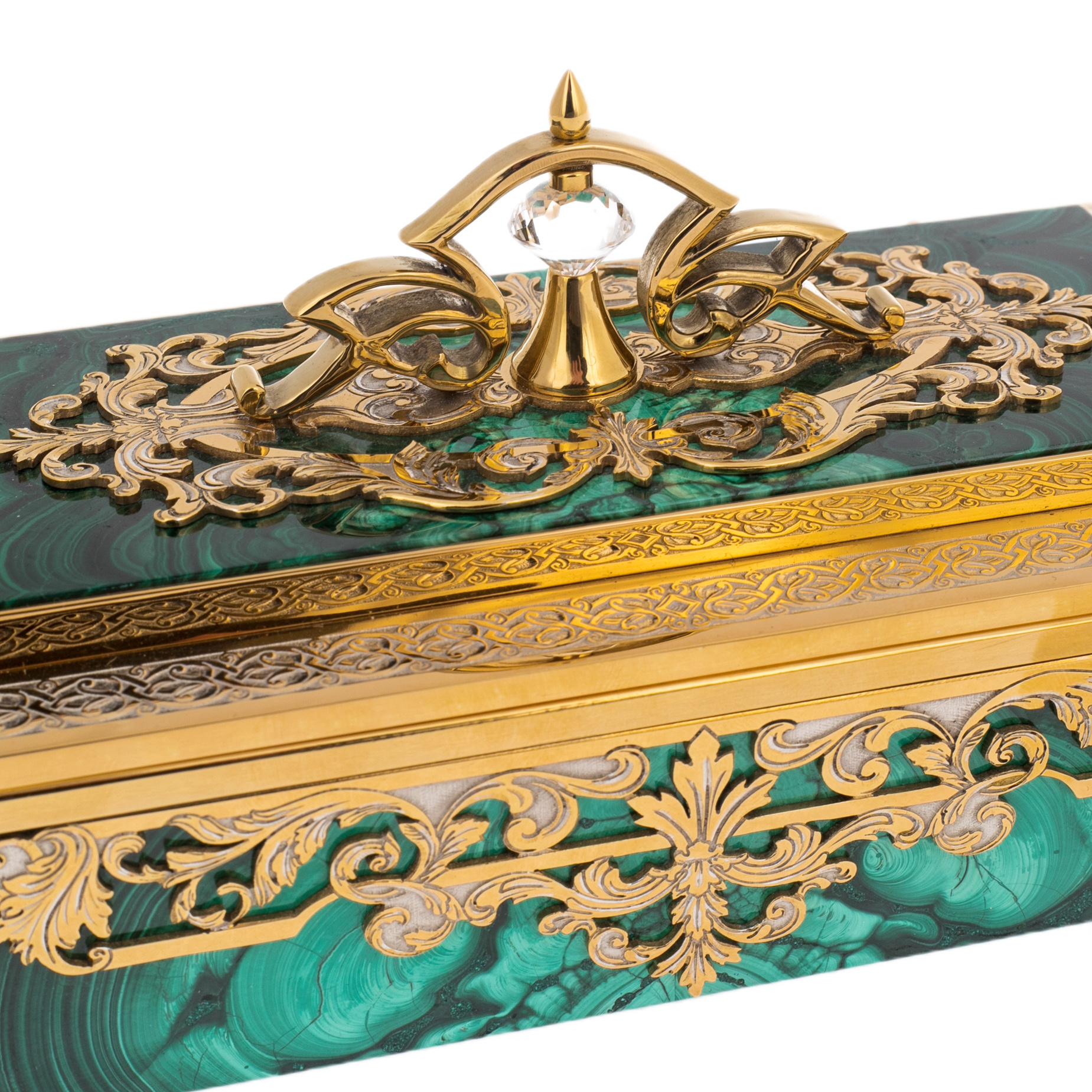 Малахит, выбранный для основы шкатулки, словно застывшая игра зелёных волн, завораживает своей глубиной и разнообразием оттенков. Каждый изгиб природного рисунка напоминает о вечности горных пород, сокрытых в недрах земли. Этот камень, символизирующий гармонию и процветание, в руках мастеров Златоуста обретает новое дыхание. Его природная текстура идеально сочетается с золотым орнаментом, украшенным тончайшей гравировкой.