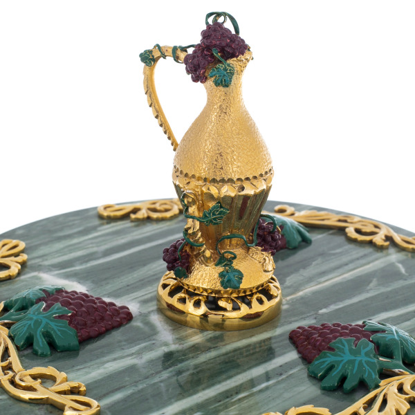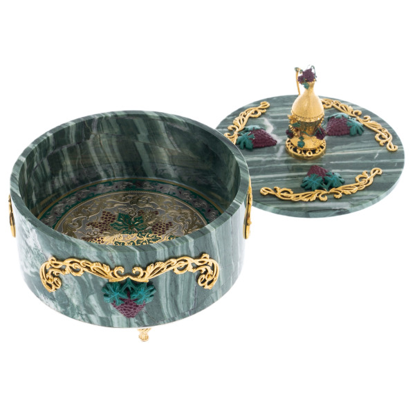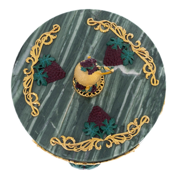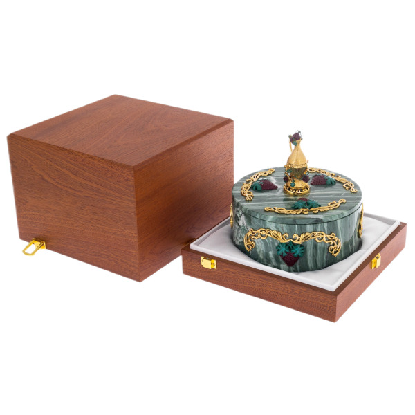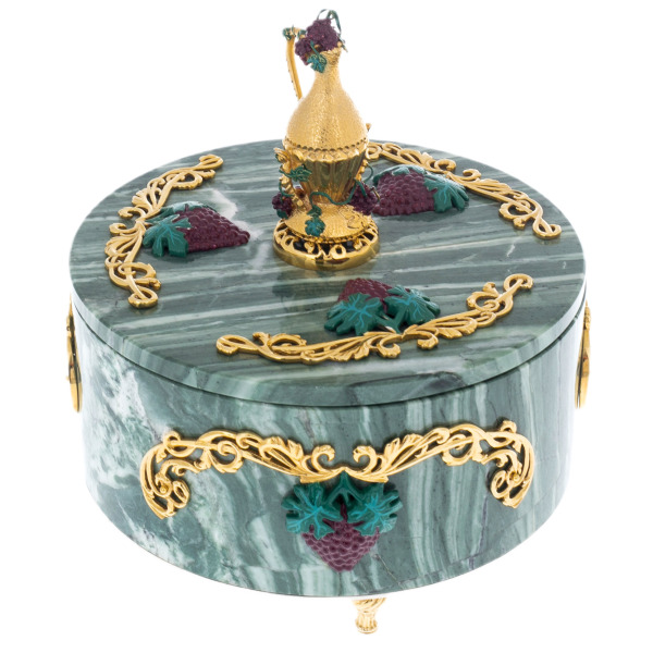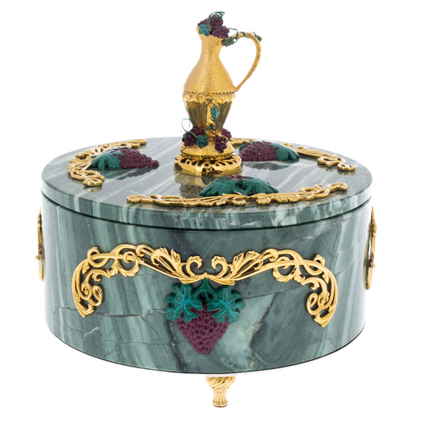 Шкатулка "Виноградная лоза" — это не просто место для хранения украшений, а истинное воплощение роскоши и власти, достойное самых взыскательных коллекционеров. Этот шедевр златоустовских мастеров сочетает в себе величественную красоту натурального камня и утонченную изысканность ювелирного искусства. Каждый элемент этой шкатулки создан для того, чтобы подчеркивать ваши статус, стремление к совершенству и превосходству.