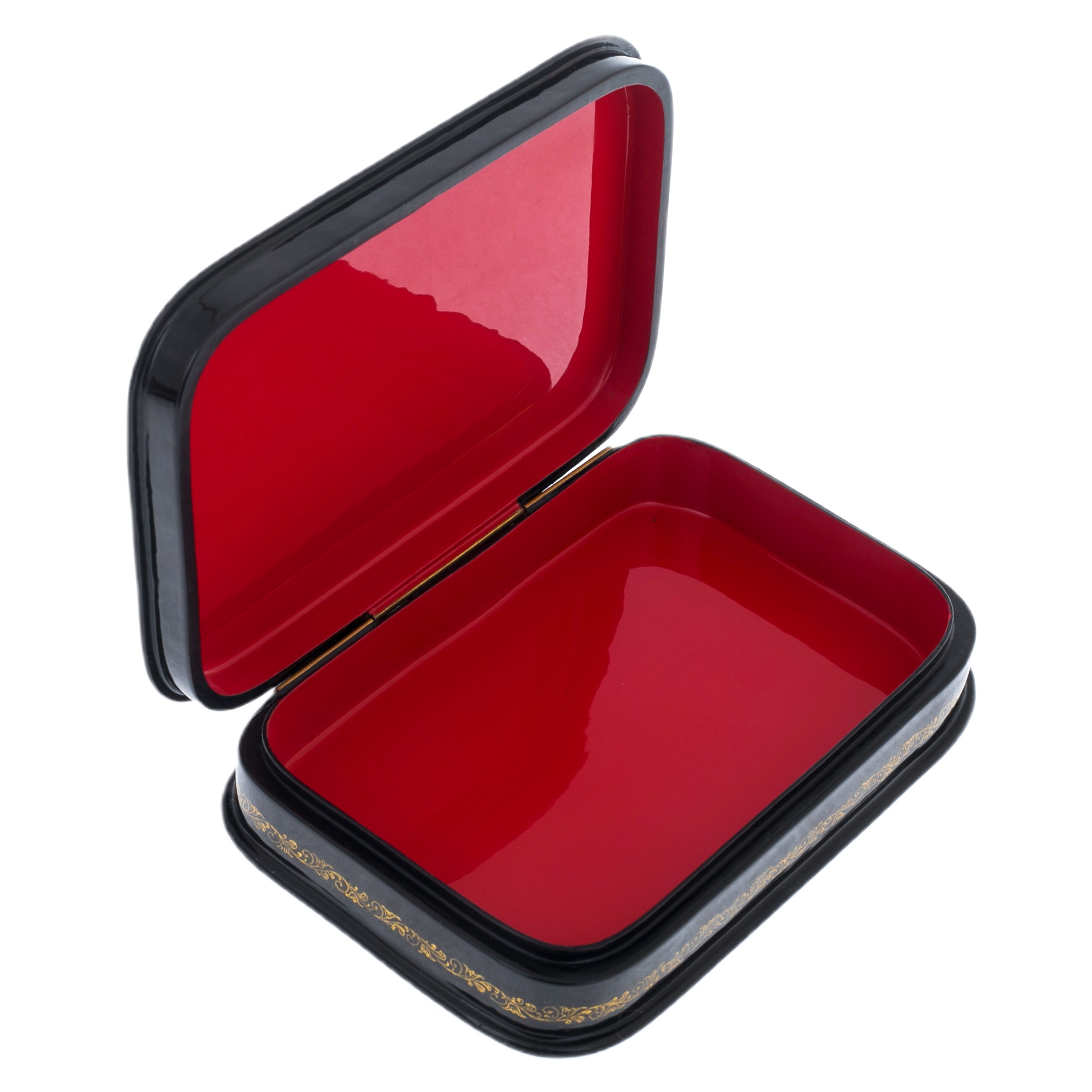 На крышке шкатулки расцветает изысканный цветок, олицетворяющий красоту и силу. Его лепестки, словно одеяние из драгоценных камней, переливаются под светом, создавая ощущение живого дыхания. Каждая деталь, каждая линия передает мастерство и страсть, вложенные в этот шедевр. Черный лак, как бездонное небо, обрамляет яркие сцены, создавая контраст, который захватывает дух и притягивает взгляд.