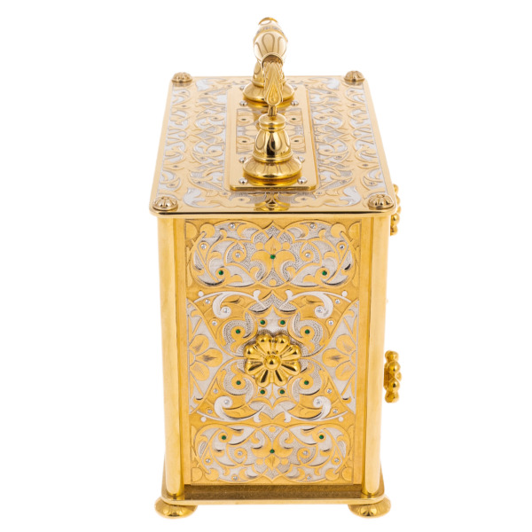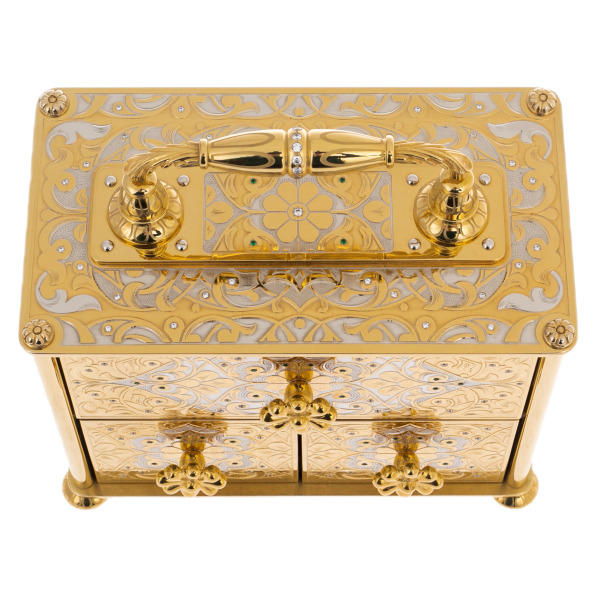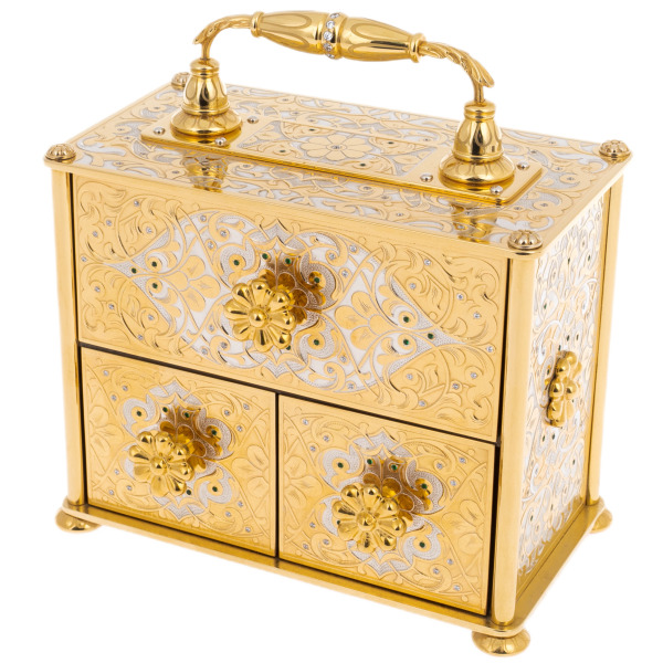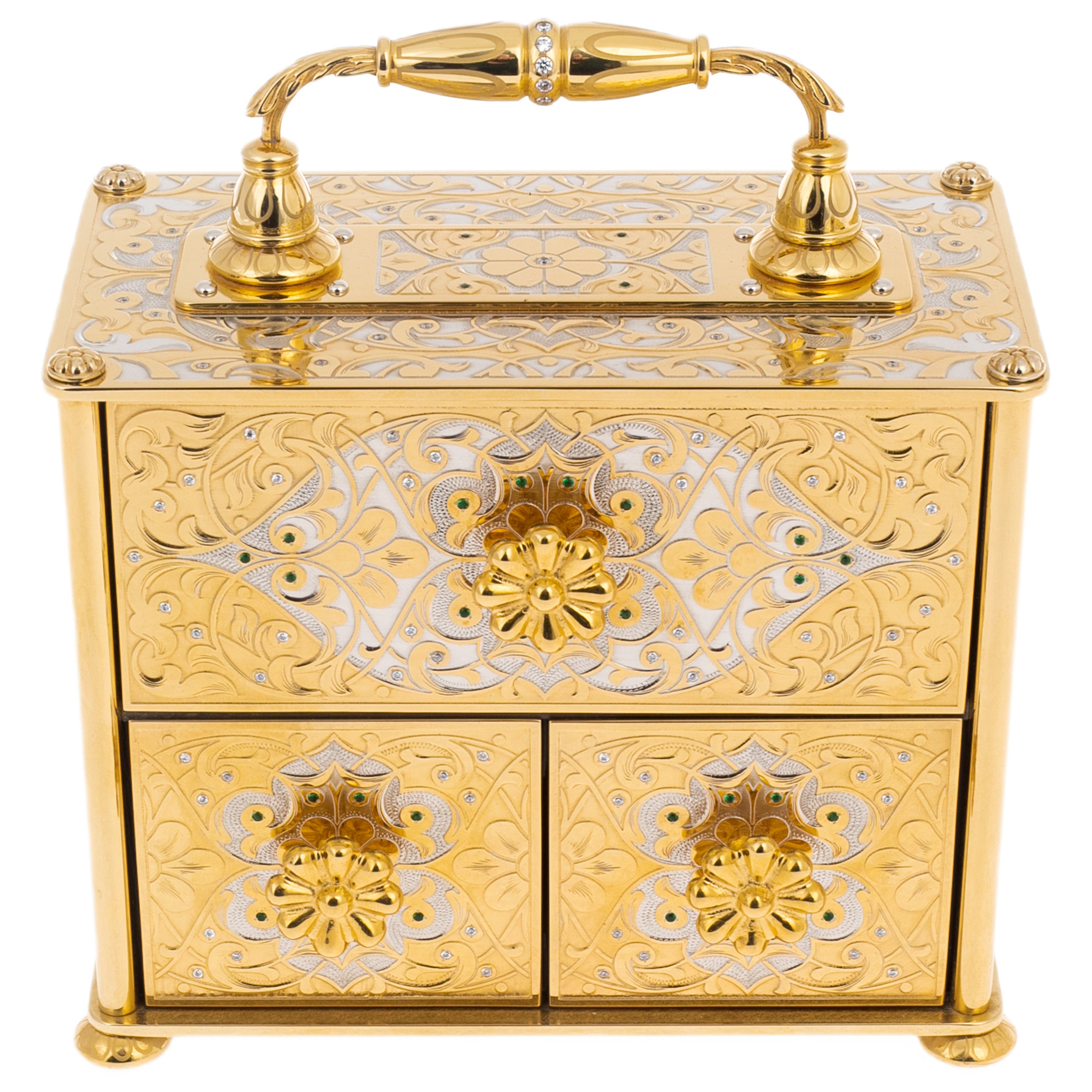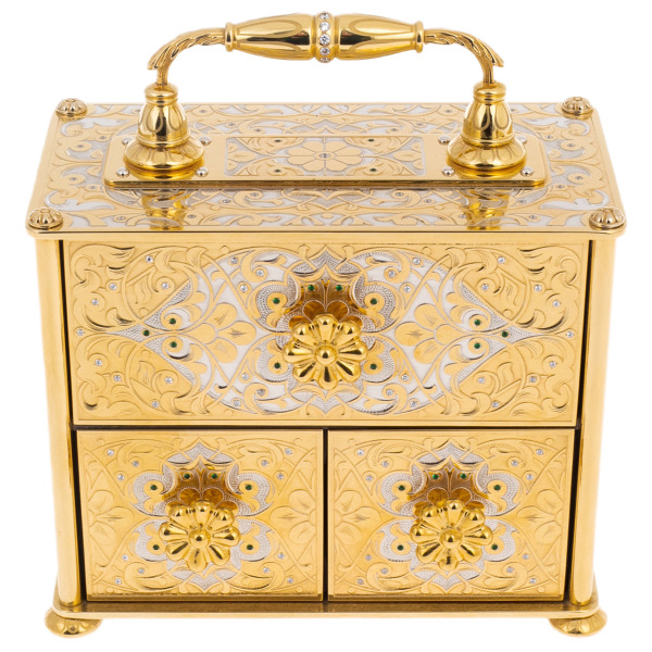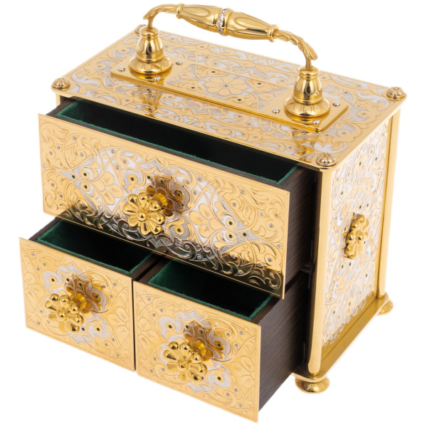 Искусство владения роскошью обретает новое прочтение в этом изысканном ювелирном сундуке, заключающем в себе не только бесценные украшения, но и саму идею вечной красоты. Каждая грань этого произведения искусства дышит утонченностью и величием, напоминая о дворцовых реликвиях, созданных для коронованных особ.