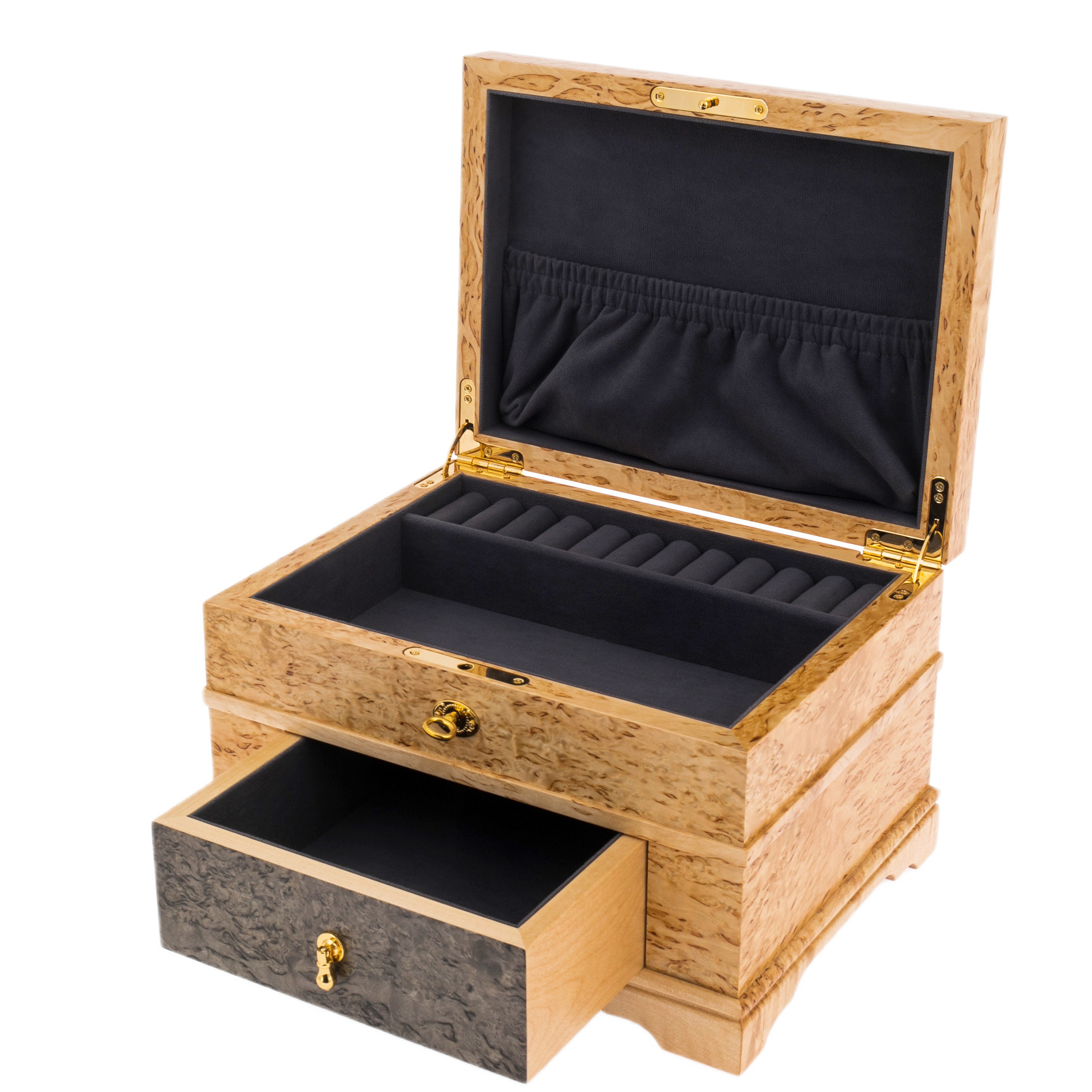 Внутреннее пространство скрыто под бархатной тенью. Здесь каждая драгоценность найдет свое идеальное место – кольца, браслеты, часы или семейные реликвии. Умелая организация отделений превращает хранение ценностей в ритуал, подчеркивая уважение к каждой детали. Золотая фурнитура дополняет ансамбль – это не просто украшение, а завершающий штрих, словно корона, венчающая царственный замысел.