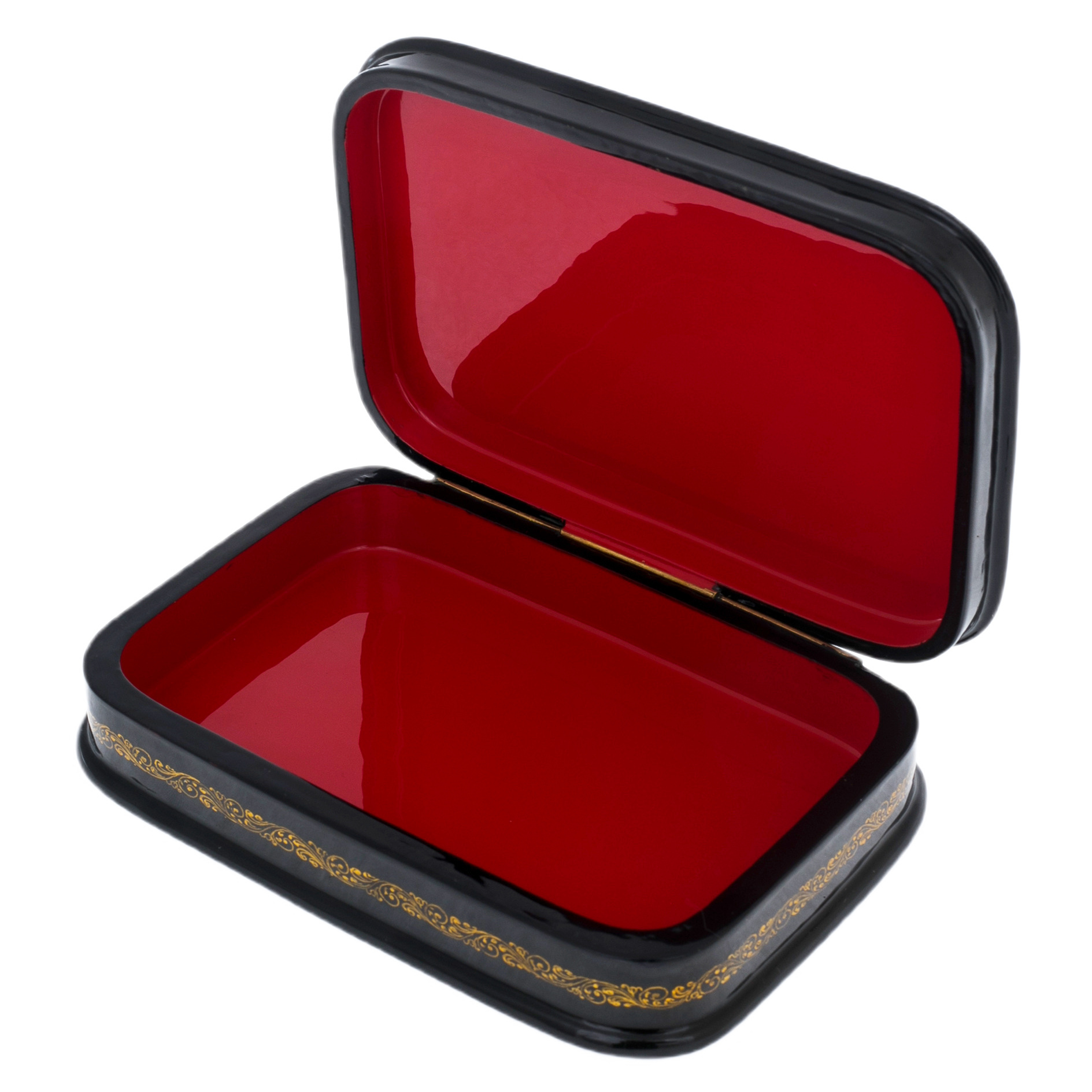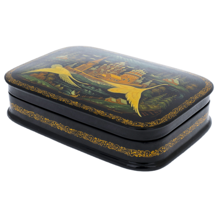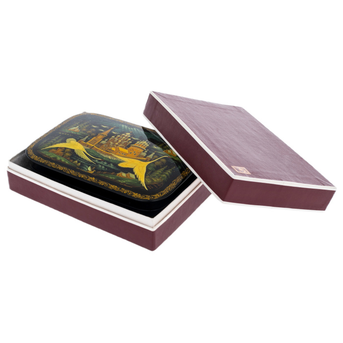 Это произведение палехских мастеров, выполненное в технике традиционной лаковой миниатюры, изначально создававшейся для самых взыскательных ценителей русского искусства. Корпус шкатулки формируется из прочной папье-маше, проходящего многоступенчатую сушку и покрываемого глубоким чёрным лаком, создающим эффект бездонной глянцевой поверхности. Внутреннее пространство выстлано густым красным лаком, контрастирующим с тёмным внешним блеском и подчёркивающим ощущение камерной драгоценности.