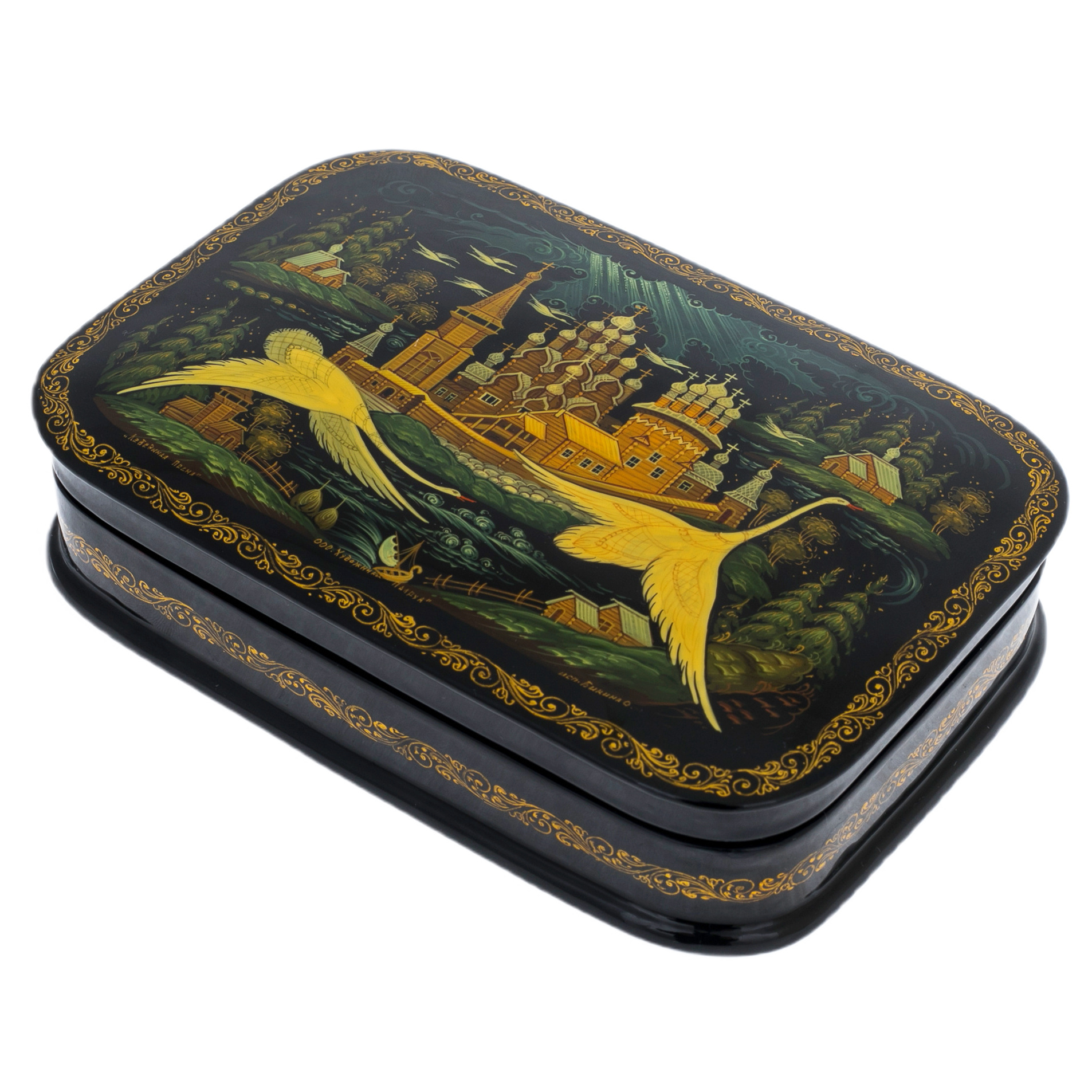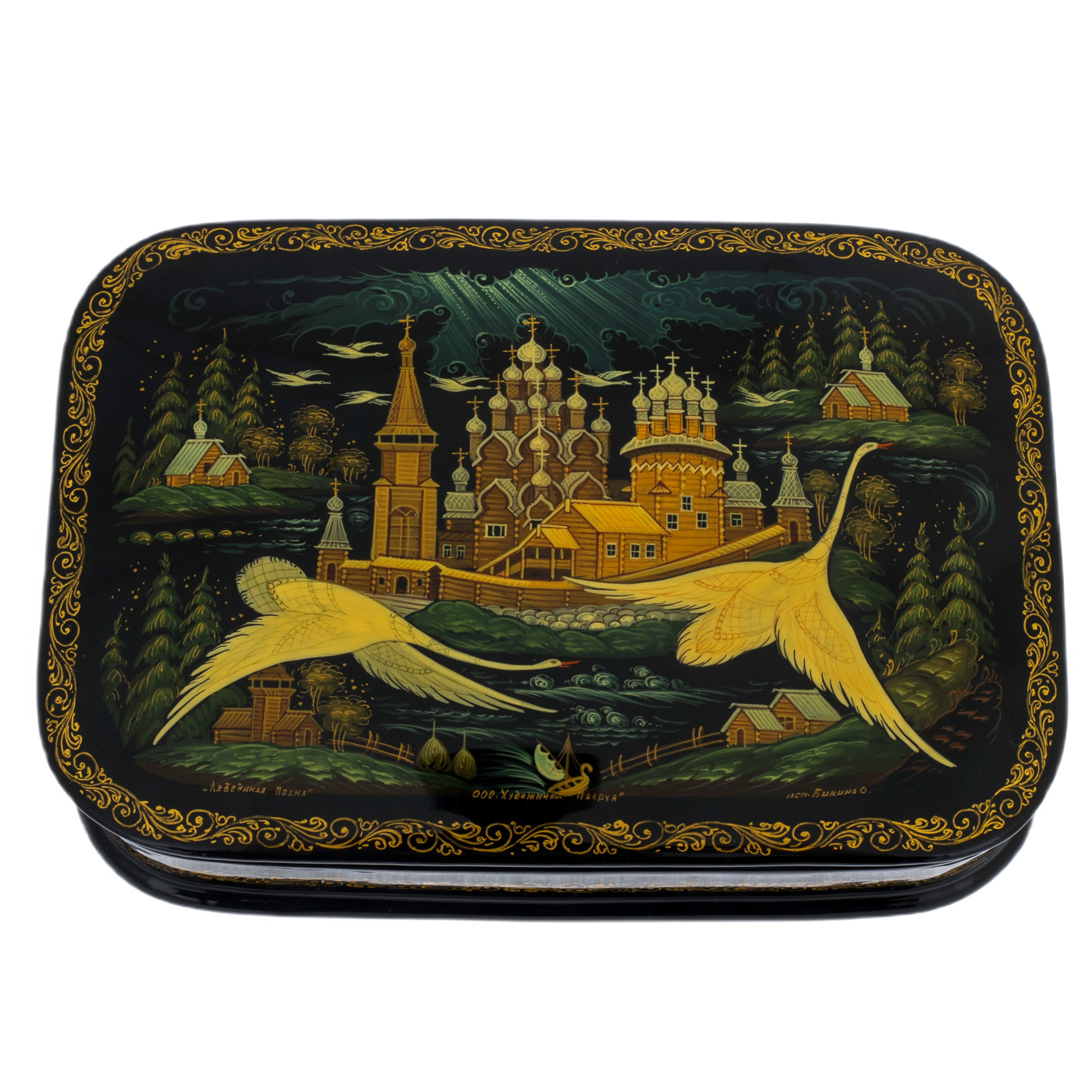 Вся поверхность украшена тончайшей ручной росписью, выполненной натуральными пигментами и золотом, растёртым до состояния мягкой светящейся пыли. Мастера, работающие над такими вещами, используют традиционные приёмы палехской школы — миниатюрные мазки, крошечные штрихи, многослойные прозрачные лессировки. Благодаря этому изображения приобретают характерную воздушность, глубину и узнаваемую по всему миру изящную декоративность. Золотой орнамент, обрамляющий композицию, создаётся особо тонкими кистями и требует безукоризненной точности движений.
