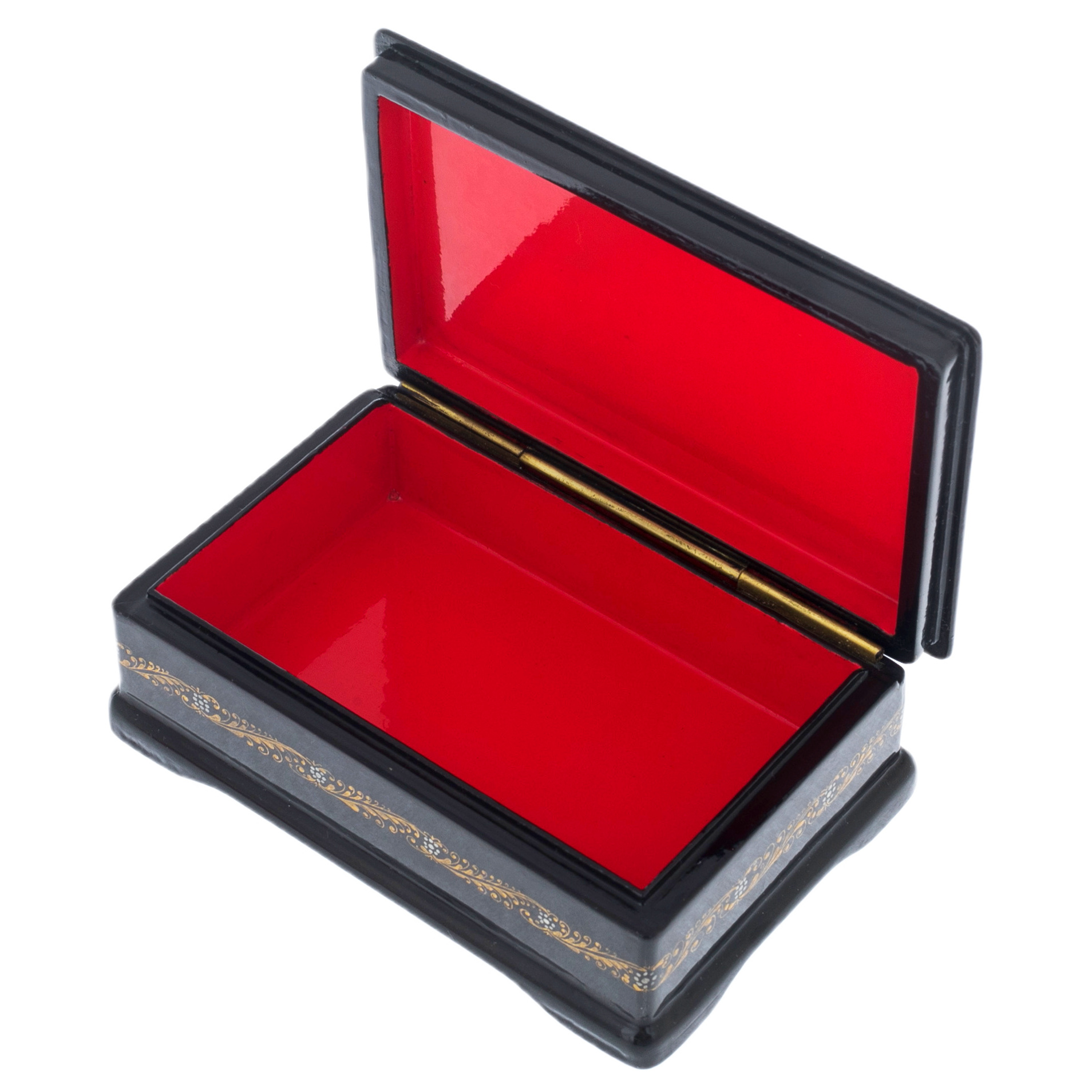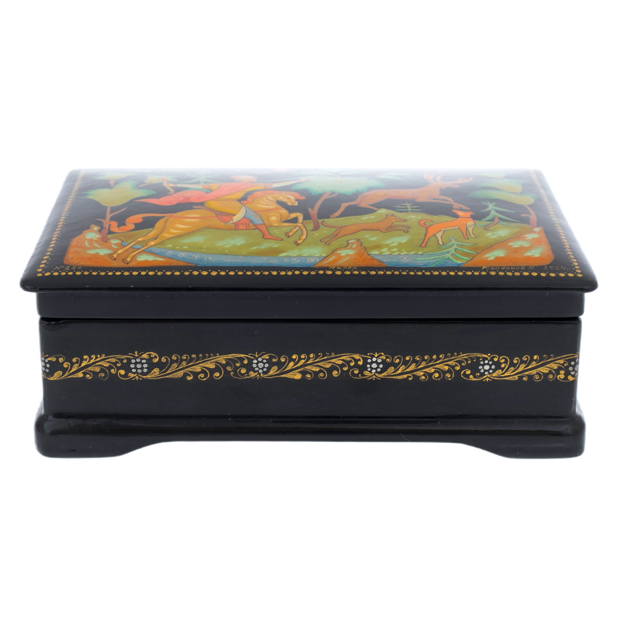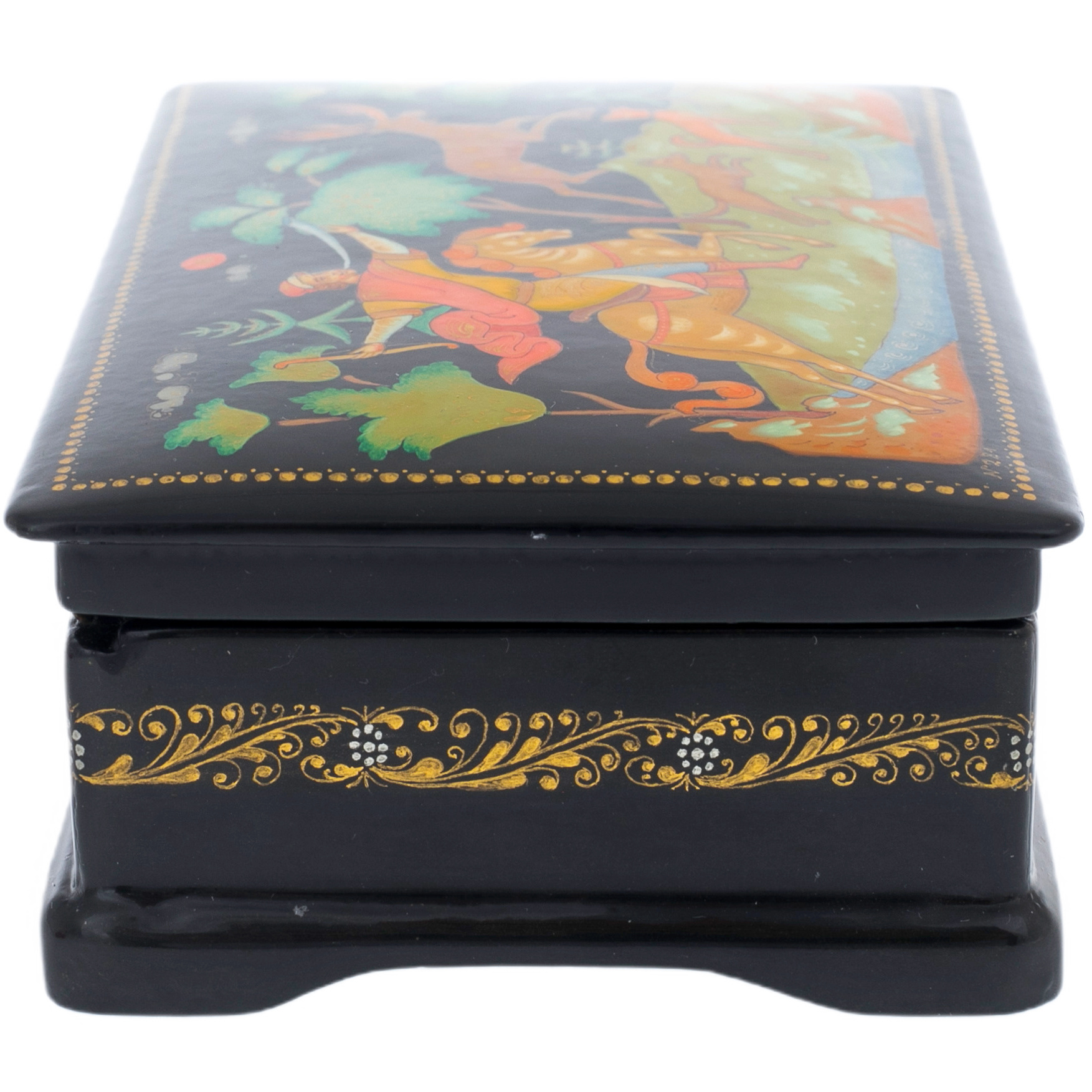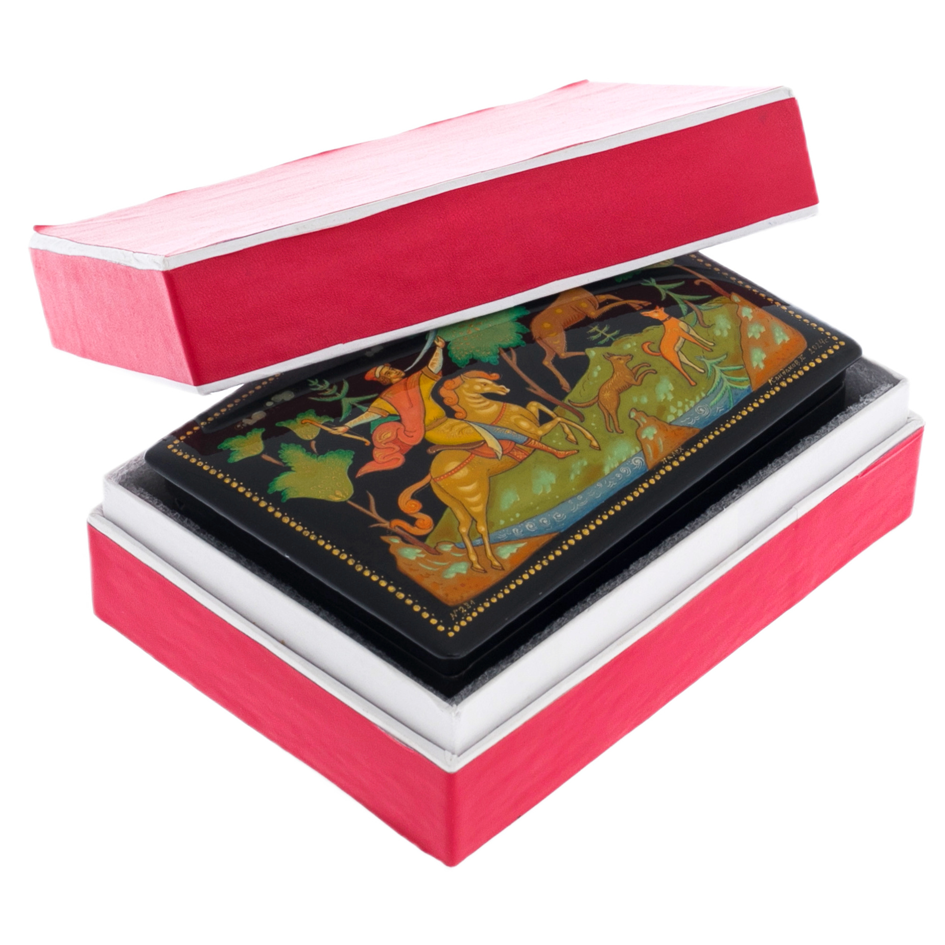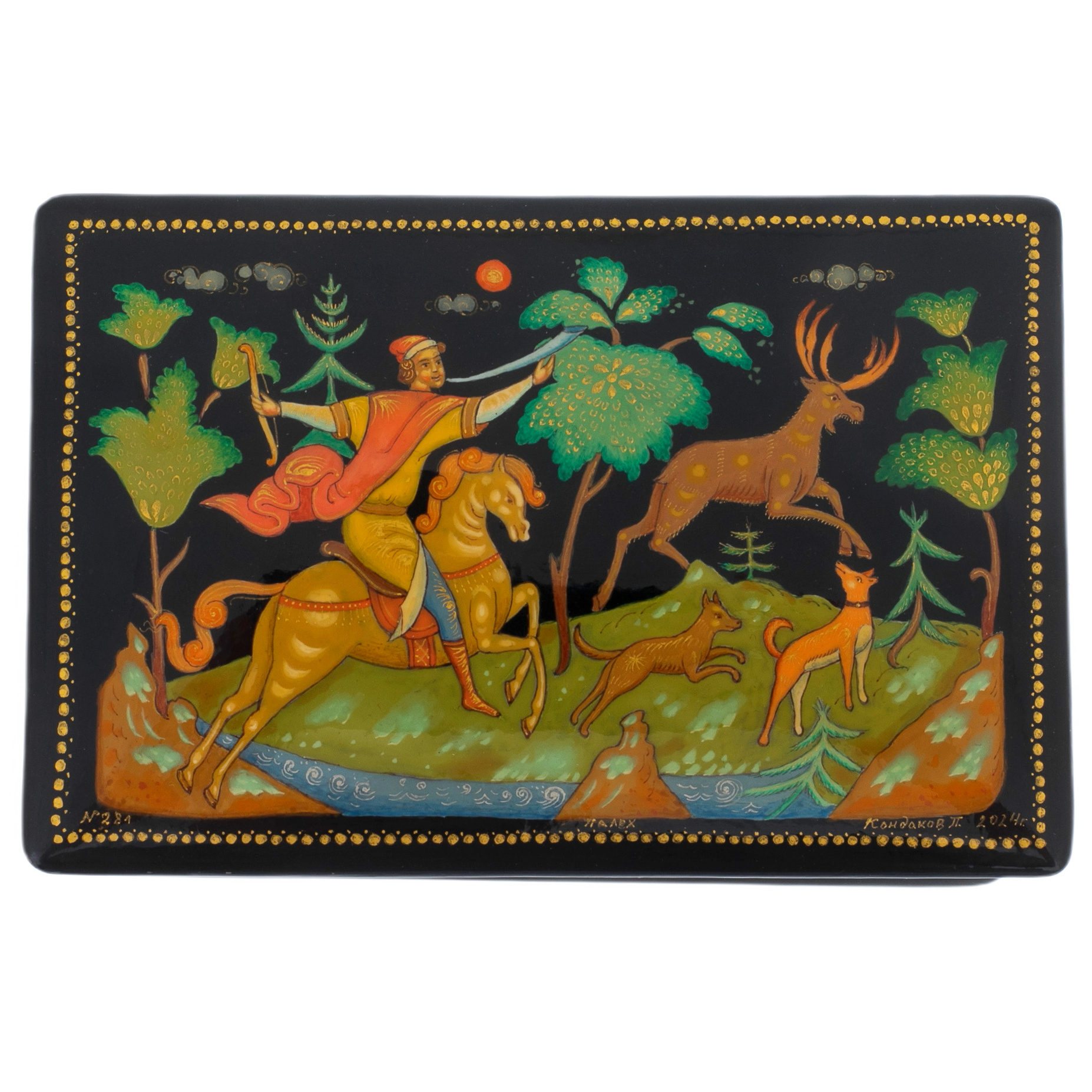 Миниатюрная живопись, выполненная темперными яичными красками, словно оживляет поверхность, а орнамент, выполненный из сусального золота, добавляет нотку роскоши и изысканности. Каждый мазок, каждая деталь, отполированная до совершенства, рассказывают о мастерстве, передавая дух охотничьей романтики и величия природы. Внутреннее пространство шкатулки, также покрытое лаком, оберегает ваши сокровища, создавая атмосферу уюта и защищённости.