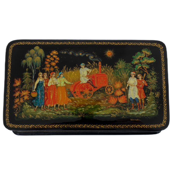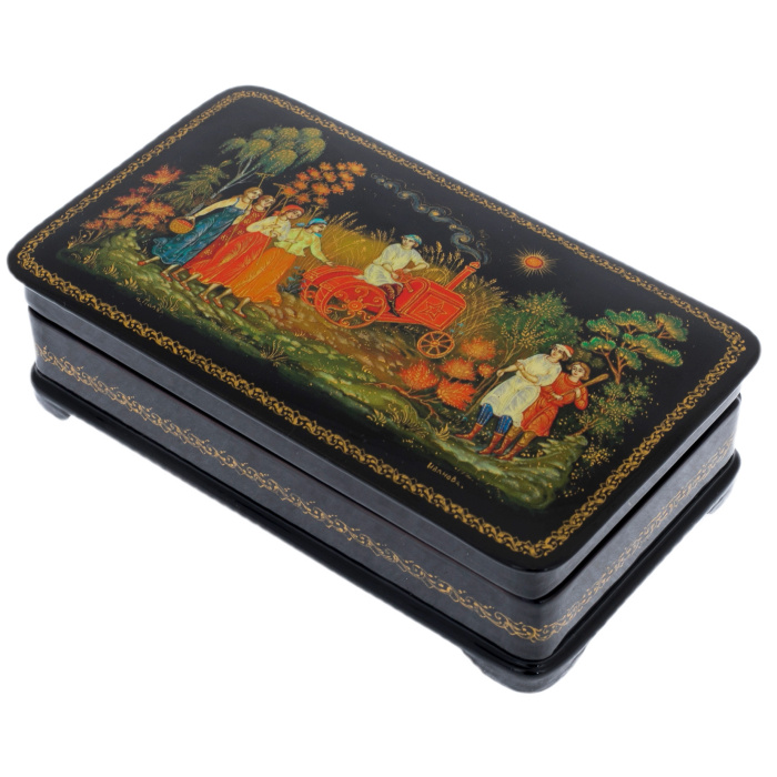 Вся поверхность украшена тончайшей ручной росписью, выполненной натуральными пигментами и золотом, растёртым до состояния мягкой светящейся пыли. Мастера, работающие над такими вещами, используют традиционные приёмы палехской школы — миниатюрные мазки, крошечные штрихи, многослойные прозрачные лессировки. Благодаря этому изображения приобретают характерную воздушность, глубину и узнаваемую по всему миру изящную декоративность. Золотой орнамент, обрамляющий композицию, создаётся особо тонкими кистями и требует безукоризненной точности движений.