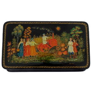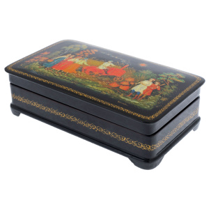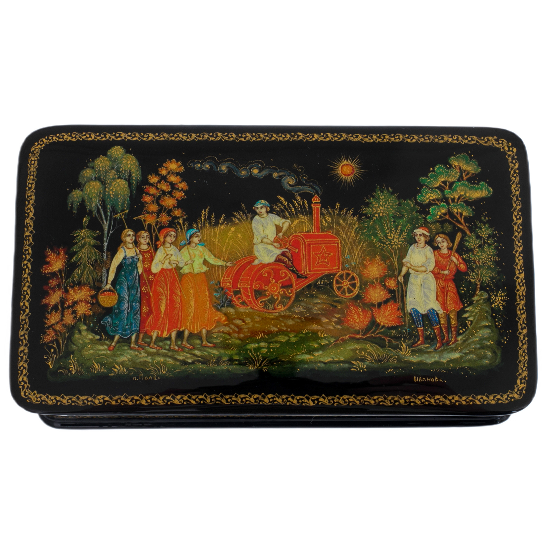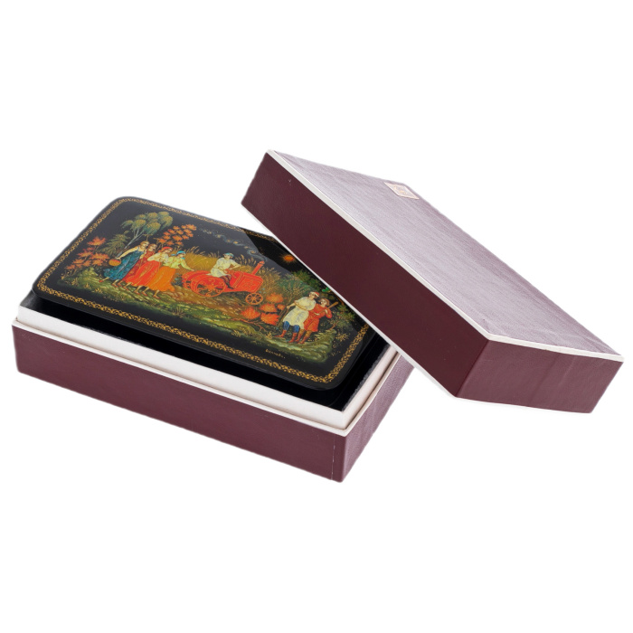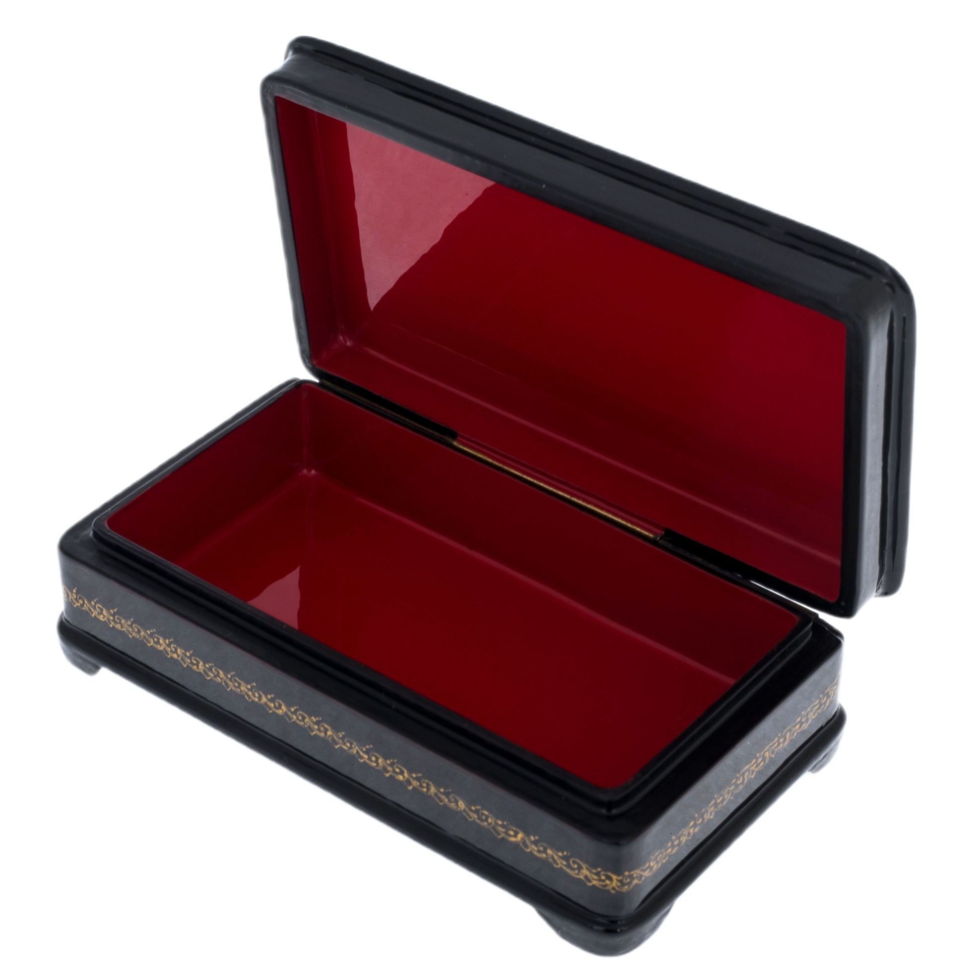 Это произведение палехских мастеров, выполненное в технике традиционной лаковой миниатюры, изначально создававшейся для самых взыскательных ценителей русского искусства. Корпус шкатулки формируется из прочной папье-маше, проходящего многоступенчатую сушку и покрываемого глубоким чёрным лаком, создающим эффект бездонной глянцевой поверхности. Внутреннее пространство выстлано густым красным лаком, контрастирующим с тёмным внешним блеском и подчёркивающим ощущение камерной драгоценности.