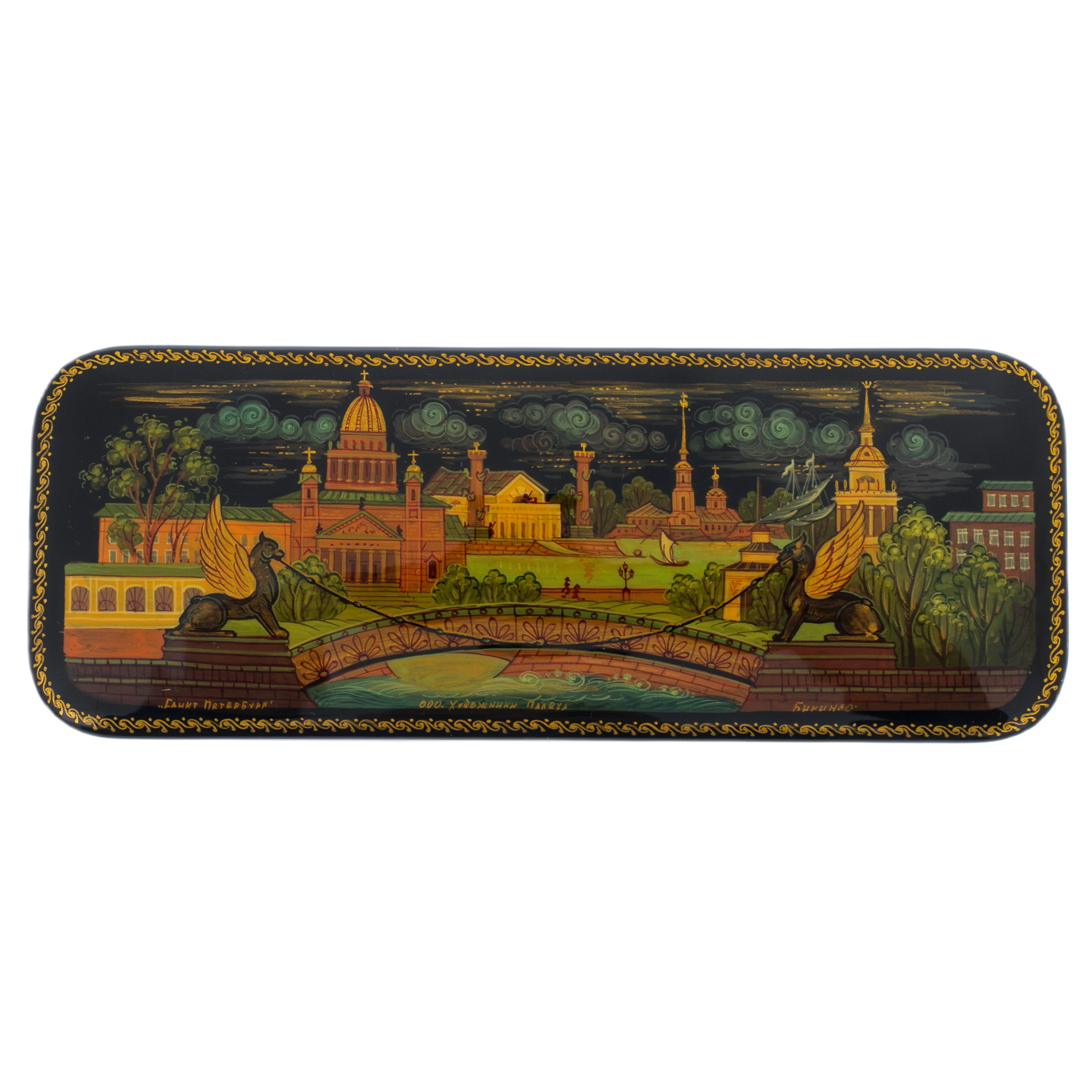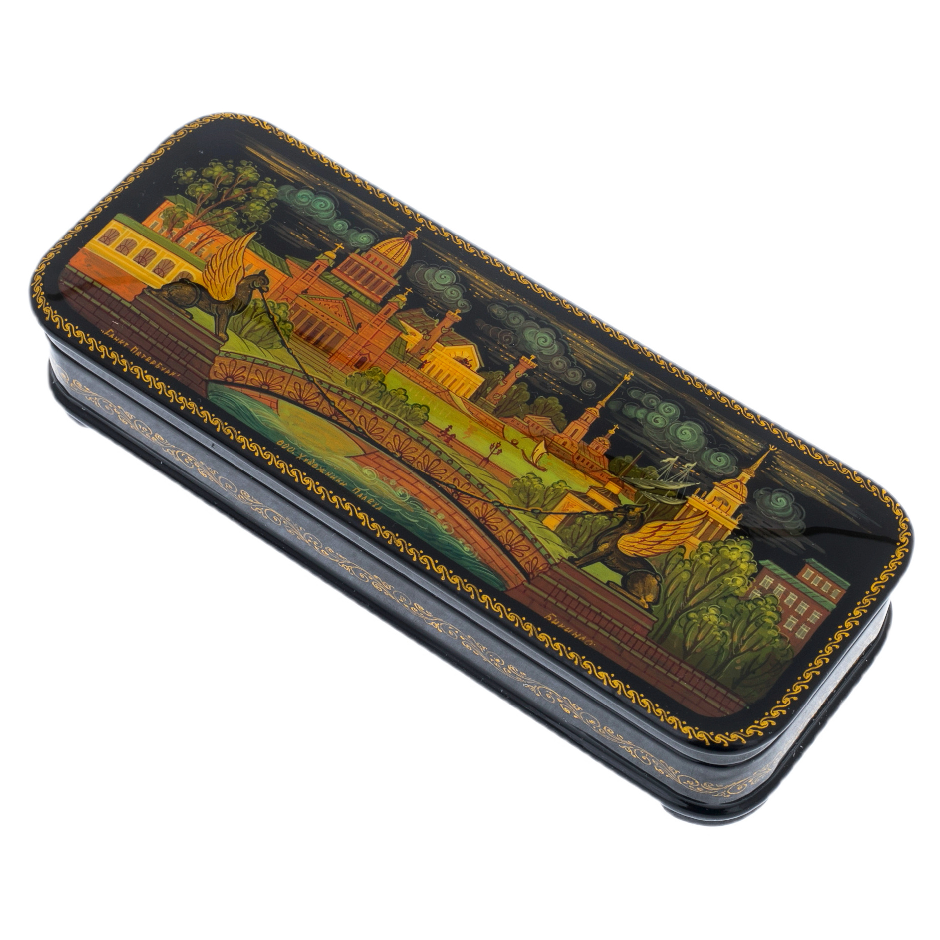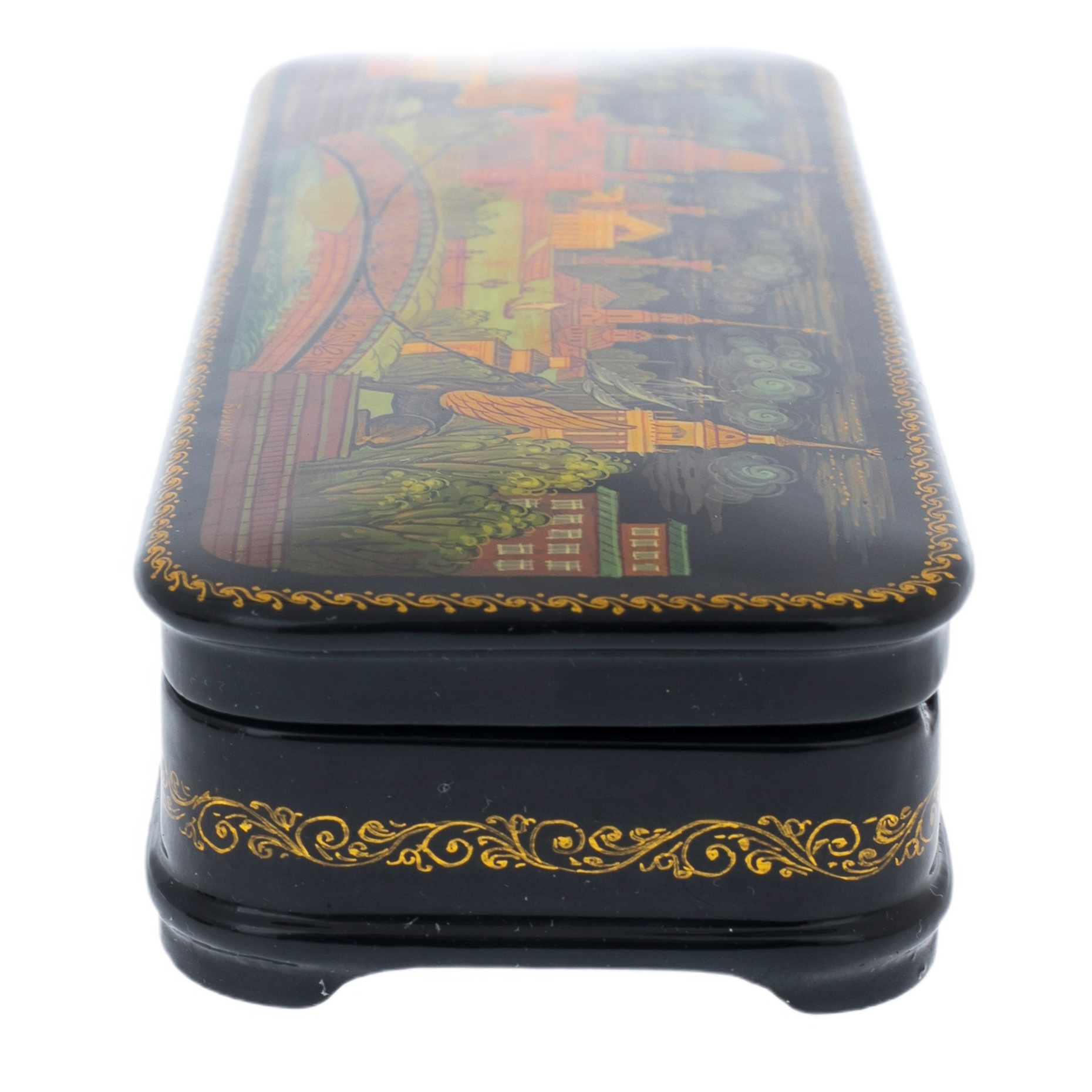 На крышке шкатулки разворачивается захватывающий пейзаж, где изящные линии и яркие цвета передают динамику жизни Санкт-Петербурга. Каждая деталь, от величественных зданий до плавных изгибов водных просторов, словно приглашает к путешествию по улицам, где каждый камень хранит тайны и воспоминания. Черный лак, как ночное небо, обрамляет эти сцены, создавая контраст, который усиливает ощущение глубины и загадочности.
