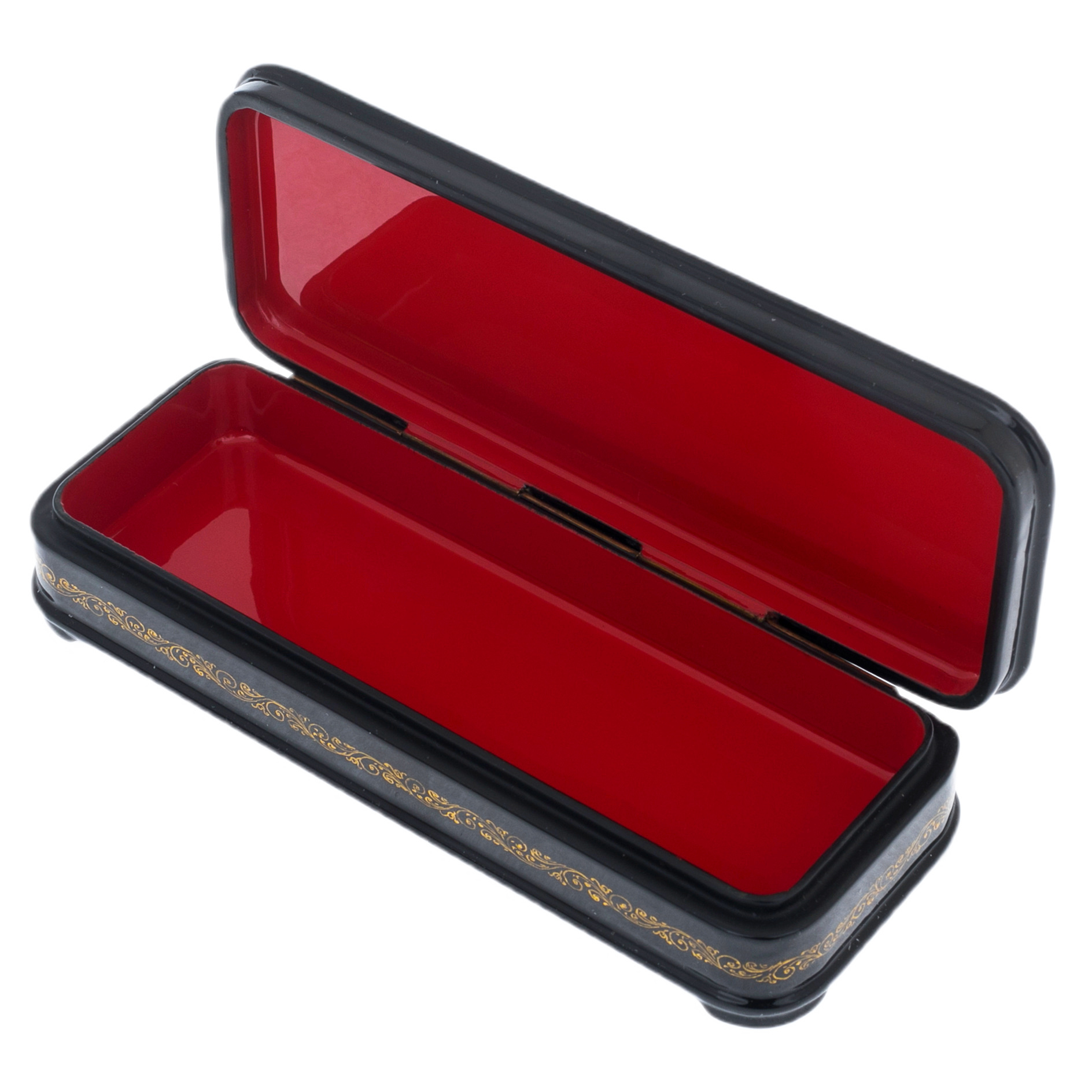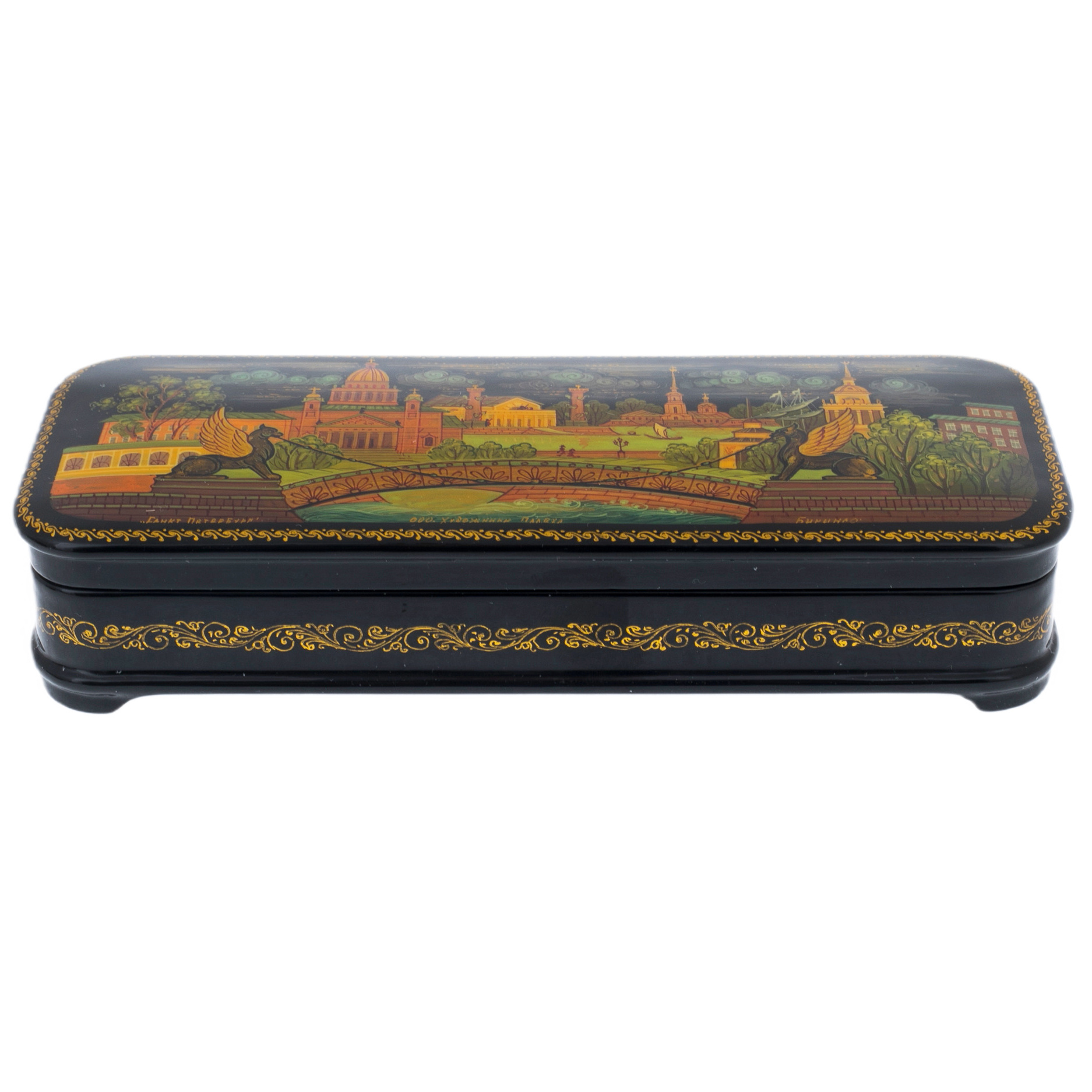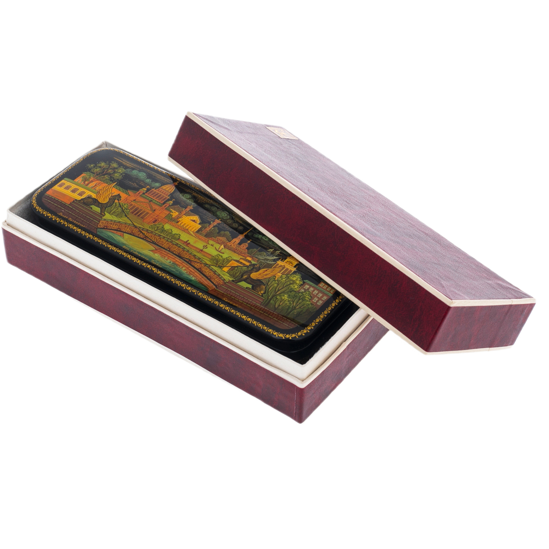 На крышке шкатулки разворачивается захватывающий пейзаж, где изящные линии и яркие цвета передают динамику жизни Санкт-Петербурга. Каждая деталь, от величественных зданий до плавных изгибов водных просторов, словно приглашает к путешествию по улицам, где каждый камень хранит тайны и воспоминания. Черный лак, как ночное небо, обрамляет эти сцены, создавая контраст, который усиливает ощущение глубины и загадочности.