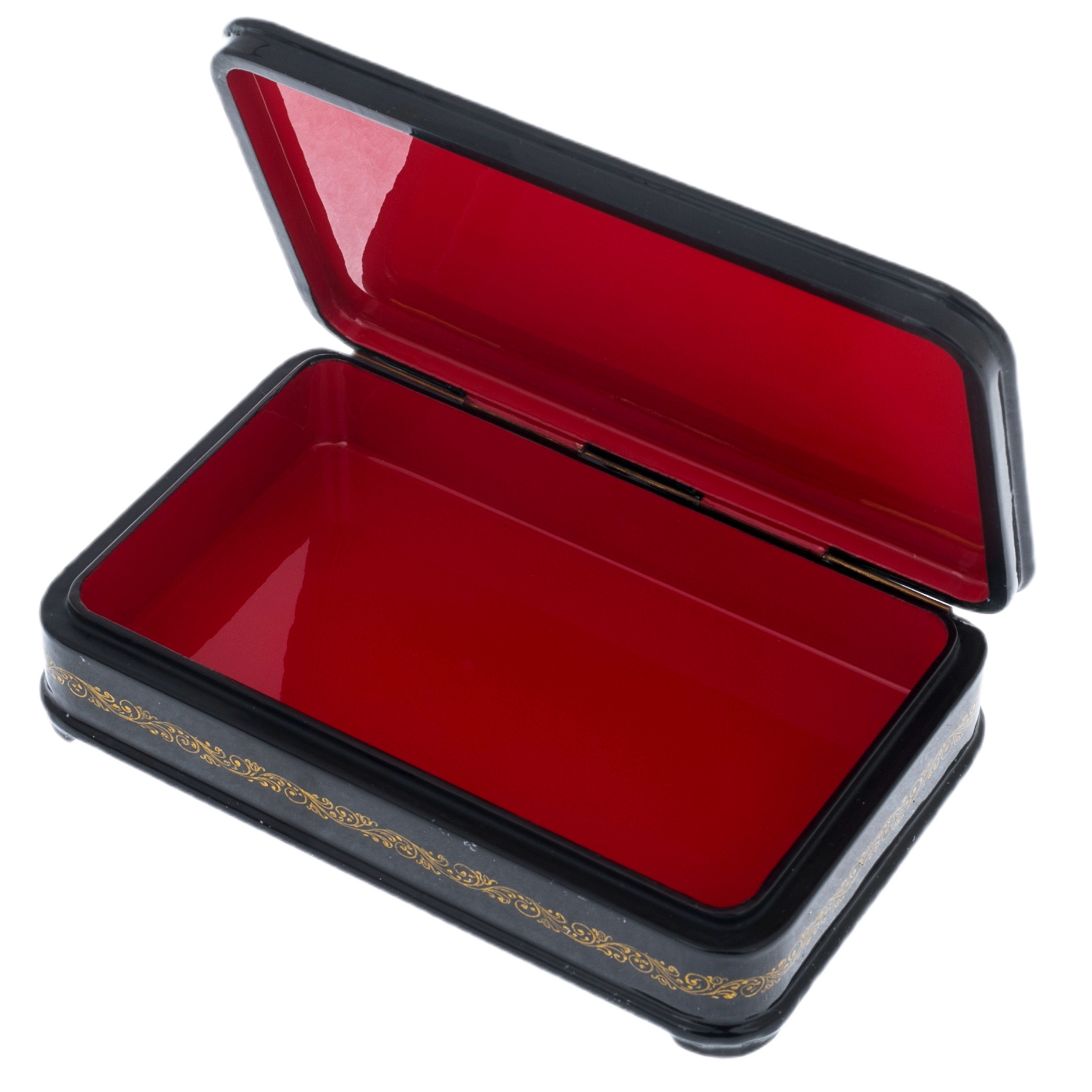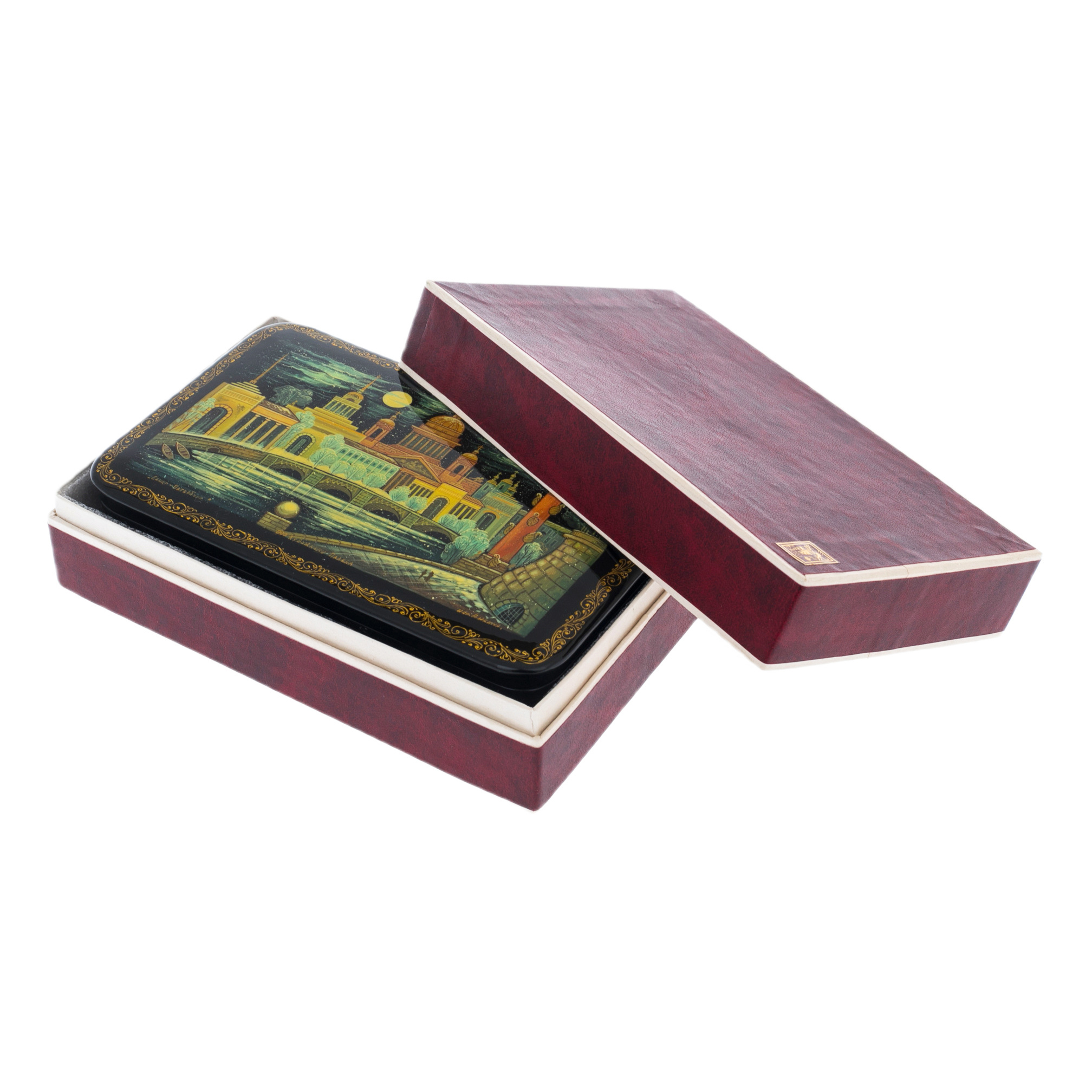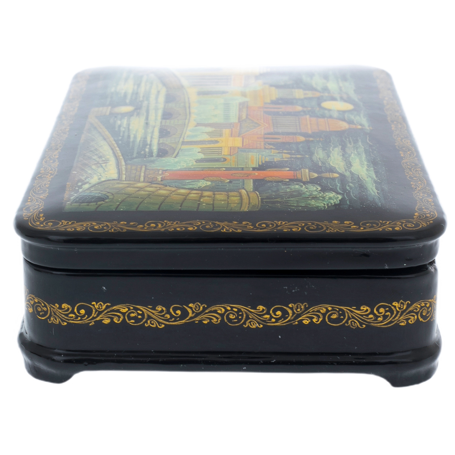 На крышке шкатулки разворачивается захватывающий пейзаж, где изящные линии и яркие цвета передают динамику жизни Санкт-Петербурга. Каждая деталь, от величественных зданий до плавных изгибов водных просторов, словно приглашает к путешествию по улицам, где каждый камень хранит тайны и воспоминания. Черный лак, как ночное небо, обрамляет эти сцены, создавая контраст, который усиливает ощущение глубины и загадочности.