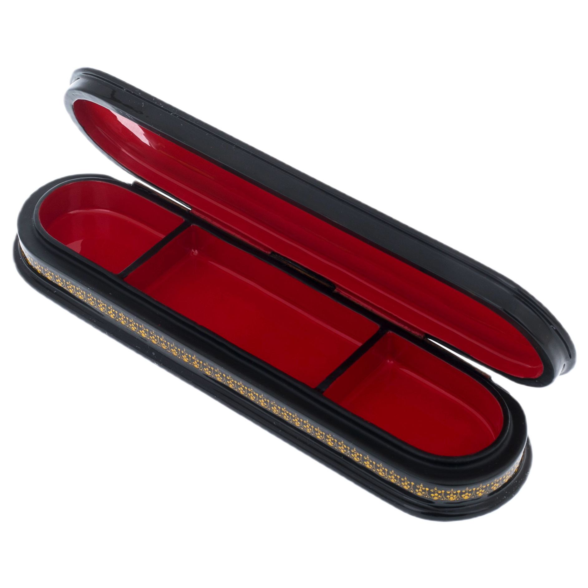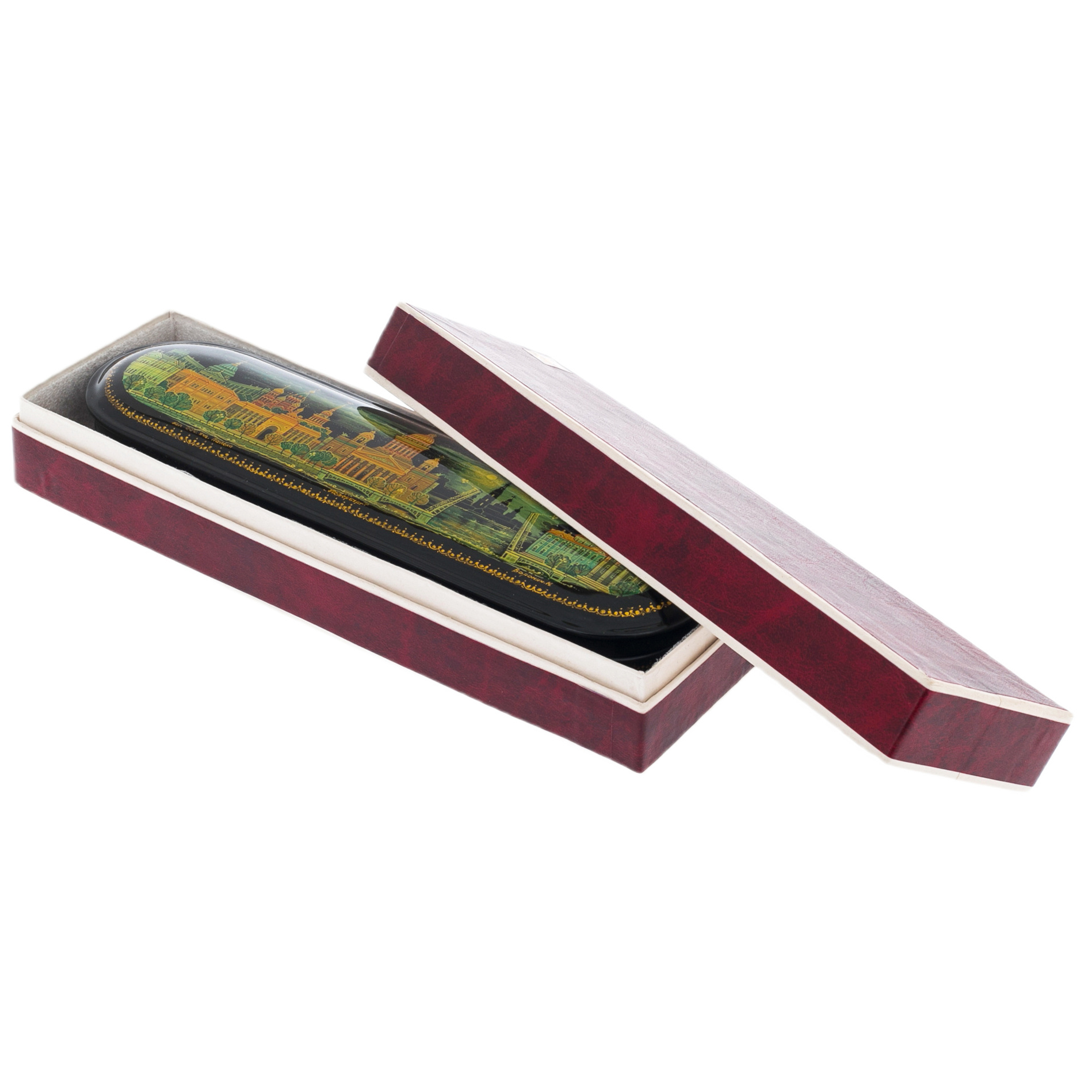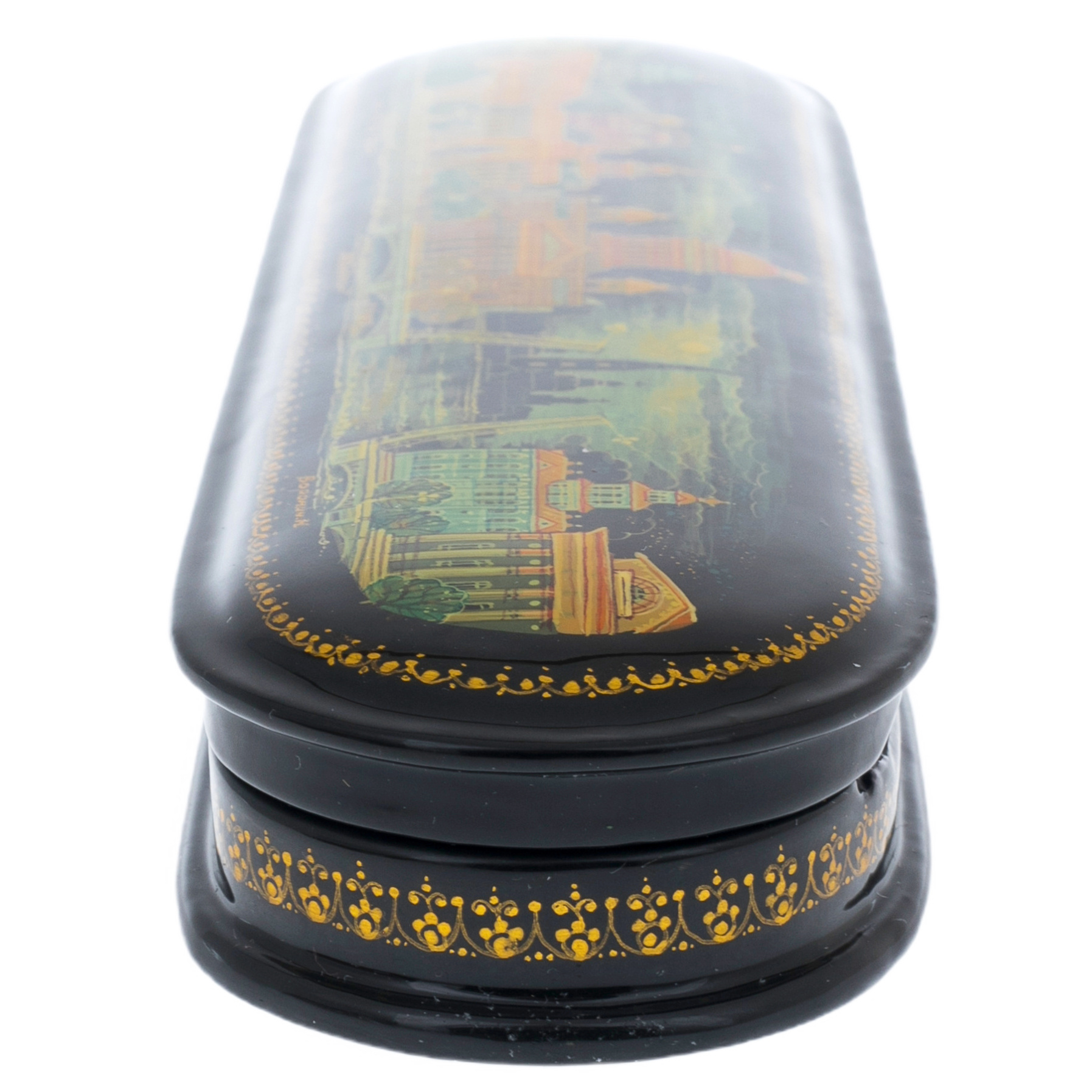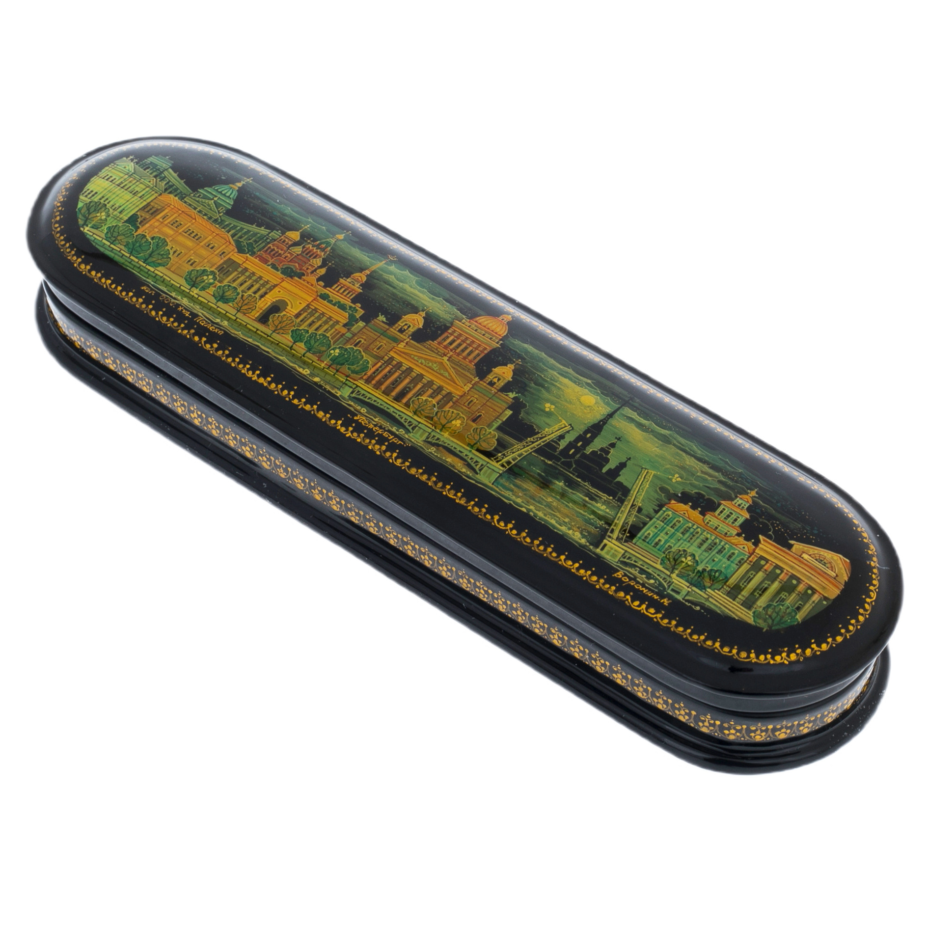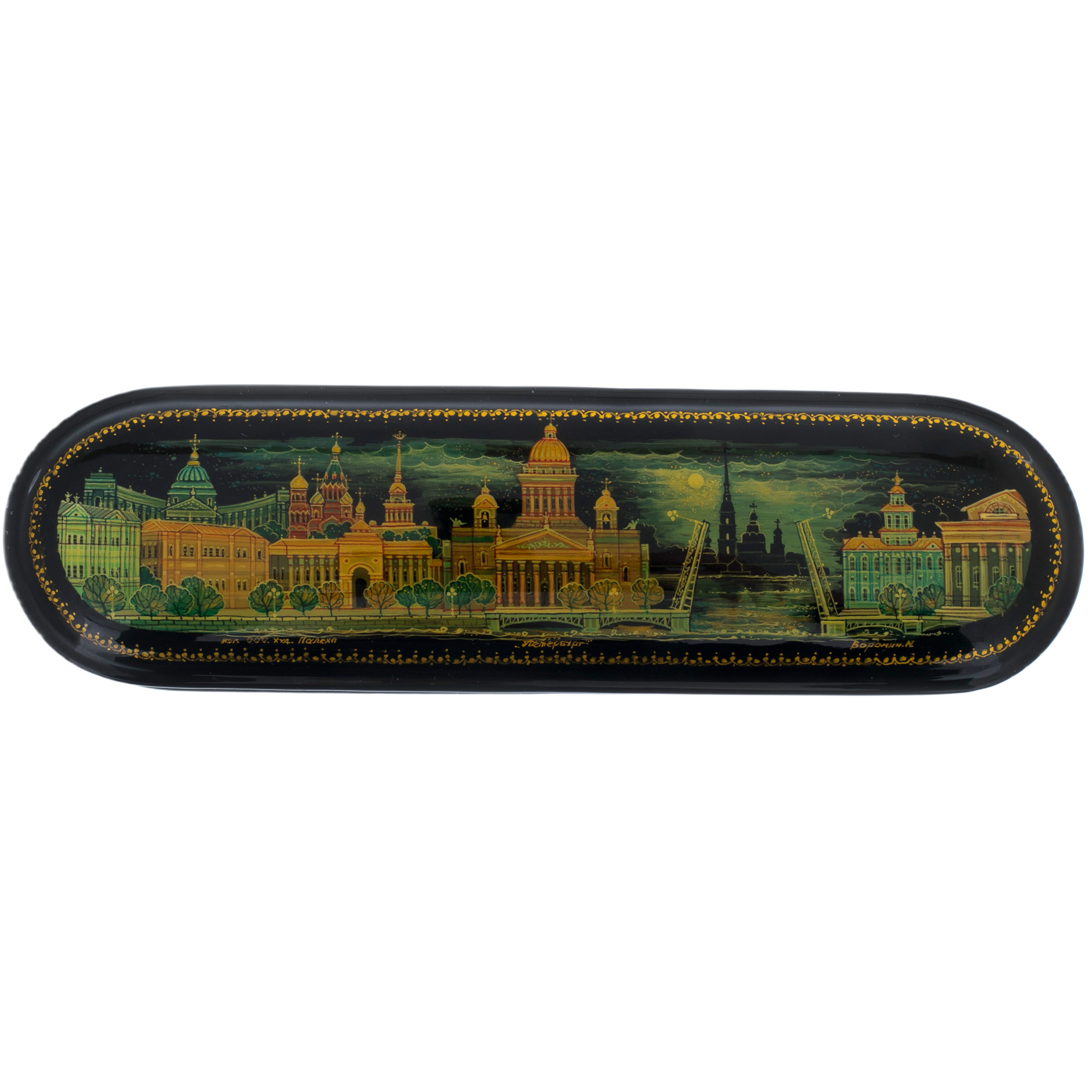 На крышке шкатулки разворачивается захватывающий пейзаж, где изящные линии и яркие цвета передают динамику жизни Санкт-Петербурга. Каждая деталь, от величественных зданий до плавных изгибов водных просторов, словно приглашает к путешествию по улицам, где каждый камень хранит тайны и воспоминания. Черный лак, как ночное небо, обрамляет эти сцены, создавая контраст, который усиливает ощущение глубины и загадочности.