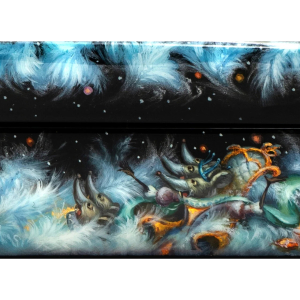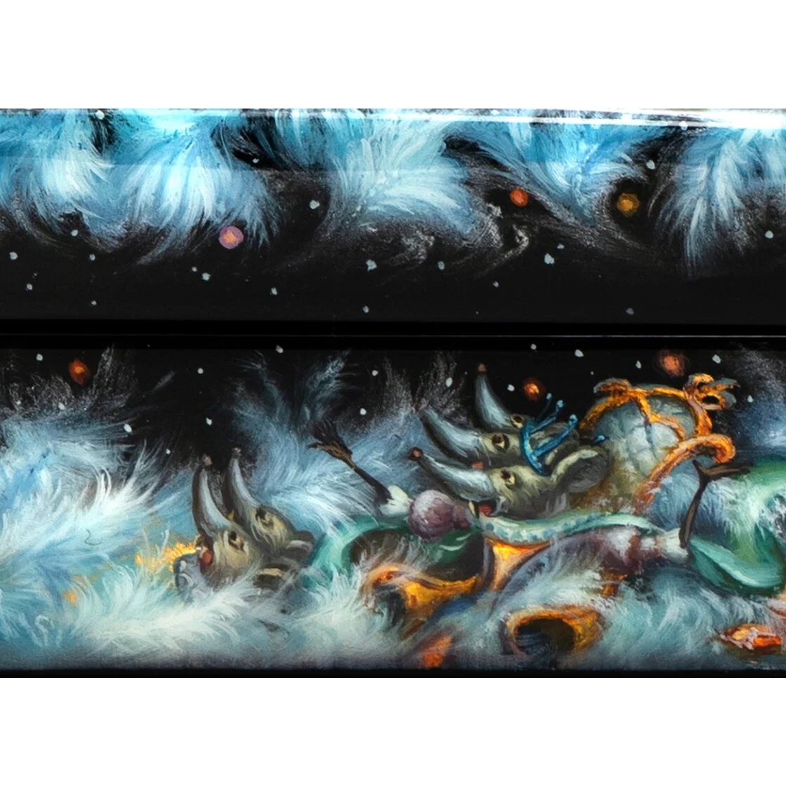 Отличительная черта Федоскинской миниатюры — реализм, достигнутый с помощью сложной многослойной масляной живописи. На эту живописную базу наносятся нежные отблески сусального золота, серебра, перламутра, создавая эффект свечения и глубины. Каждый штрих становится частью величественной композиции, оживающей в плавных переходах света и тени, подчеркивающих тончайшие детали.