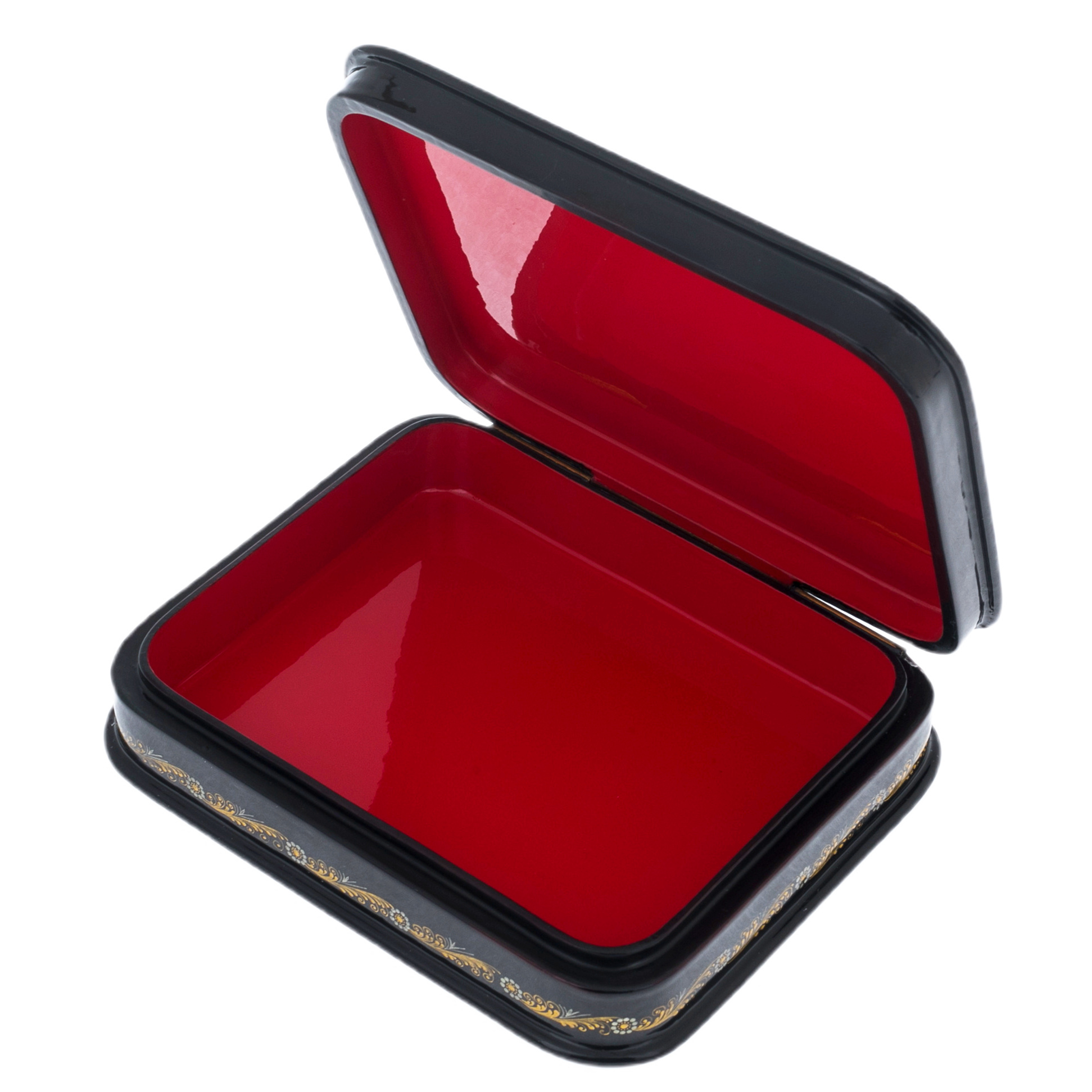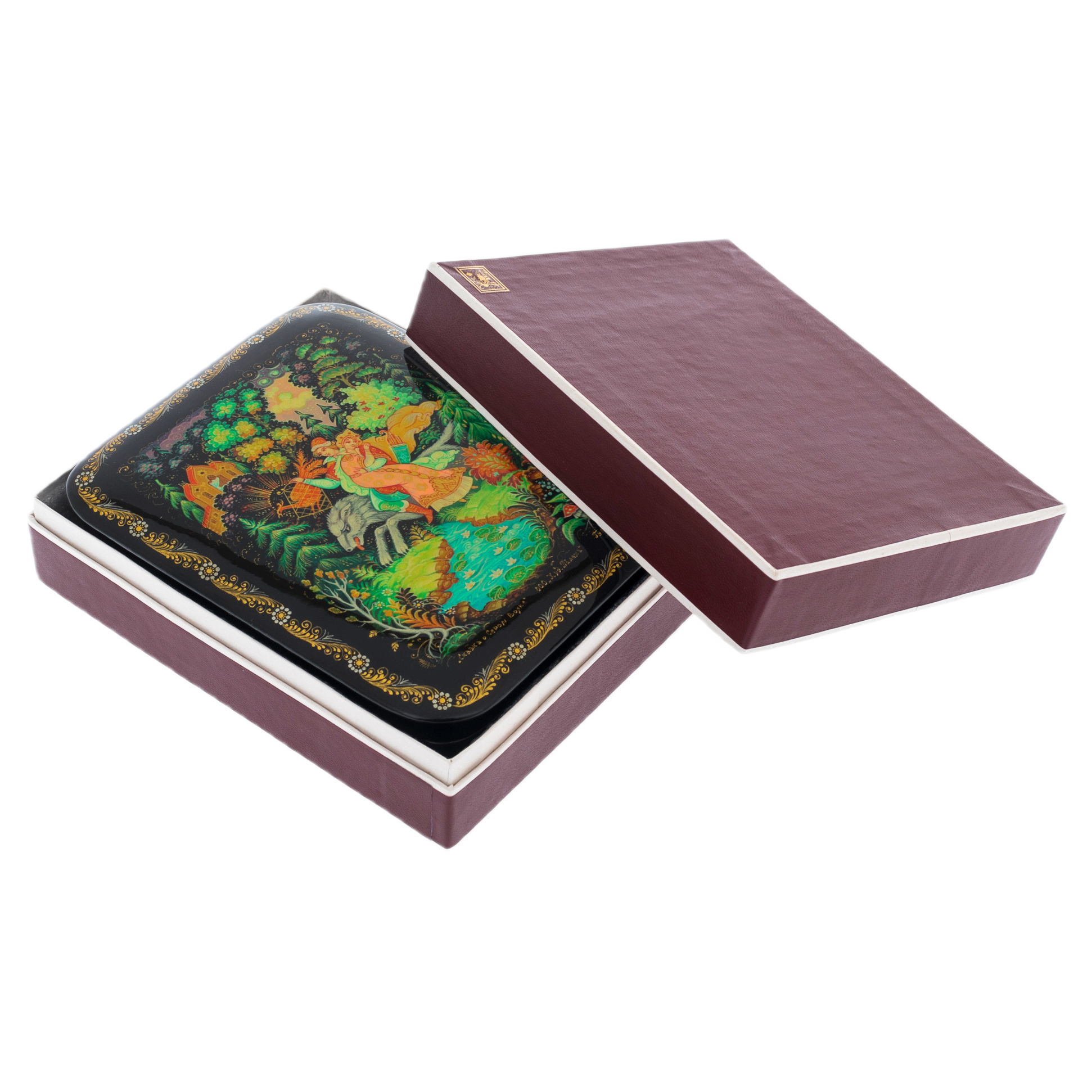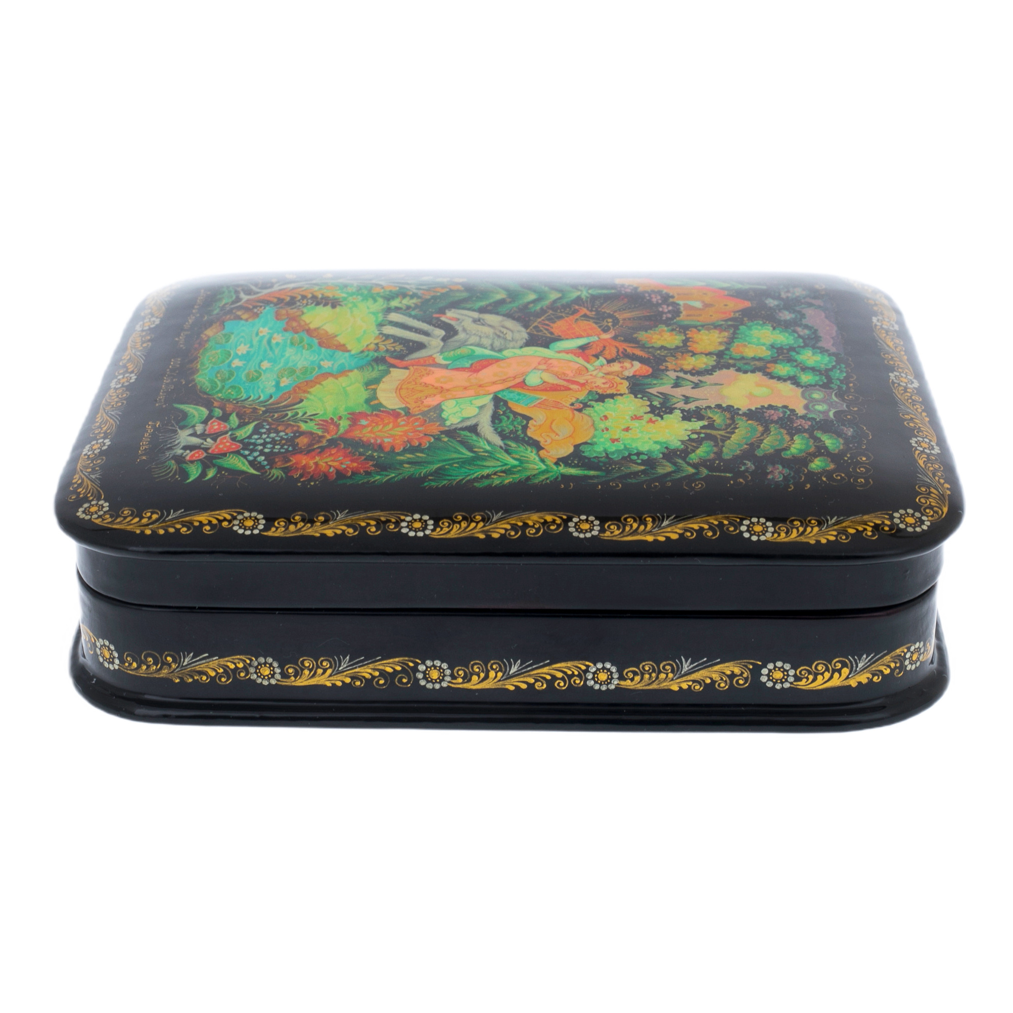 Эта изысканная шкатулка хранит в себе не просто драгоценности, но и сказочную историю, запечатленную на ее крышке. Мастер палехской миниатюры художница Елена Гурылева создала поистине чарующий образ, переносящий нас в мир волшебных лесов и чудесных приключений.