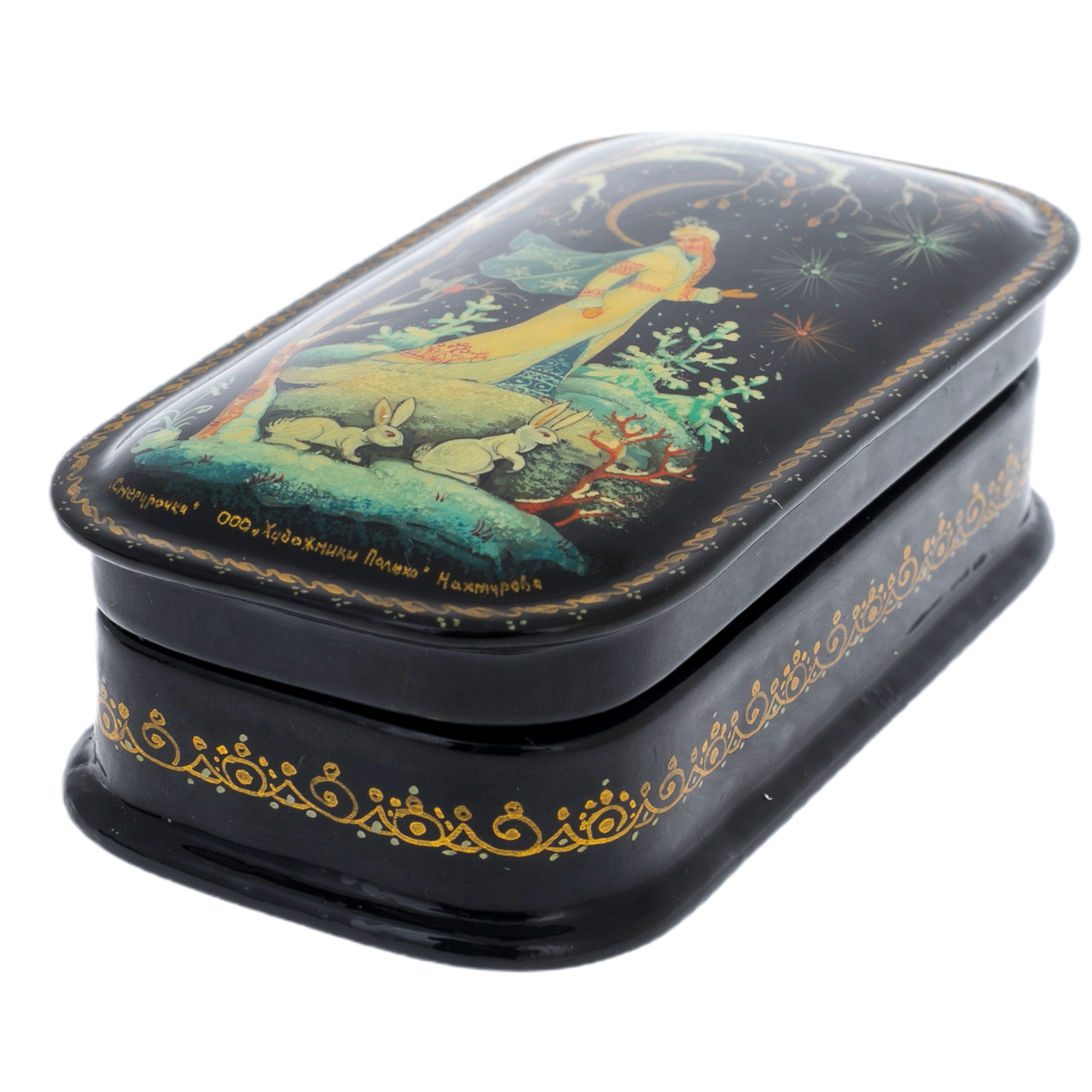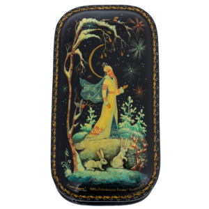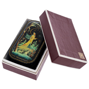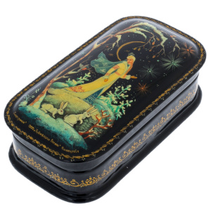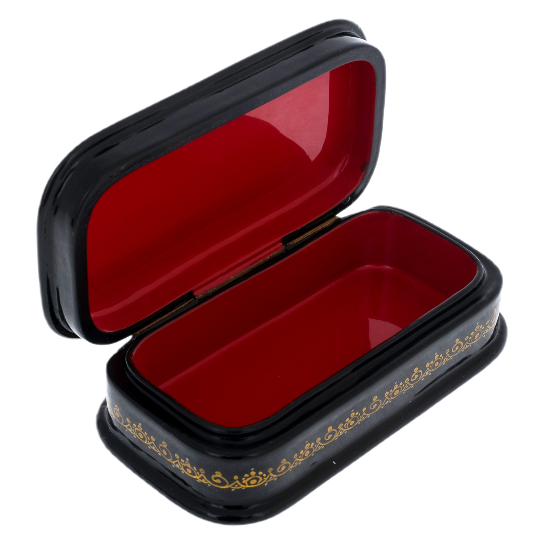 Это произведение палехских мастеров, выполненное в технике традиционной лаковой миниатюры, изначально создававшейся для самых взыскательных ценителей русского искусства. Корпус шкатулки формируется из прочной папье-маше, проходящего многоступенчатую сушку и покрываемого глубоким чёрным лаком, создающим эффект бездонной глянцевой поверхности. Внутреннее пространство выстлано густым красным лаком, контрастирующим с тёмным внешним блеском и подчёркивающим ощущение камерной драгоценности.