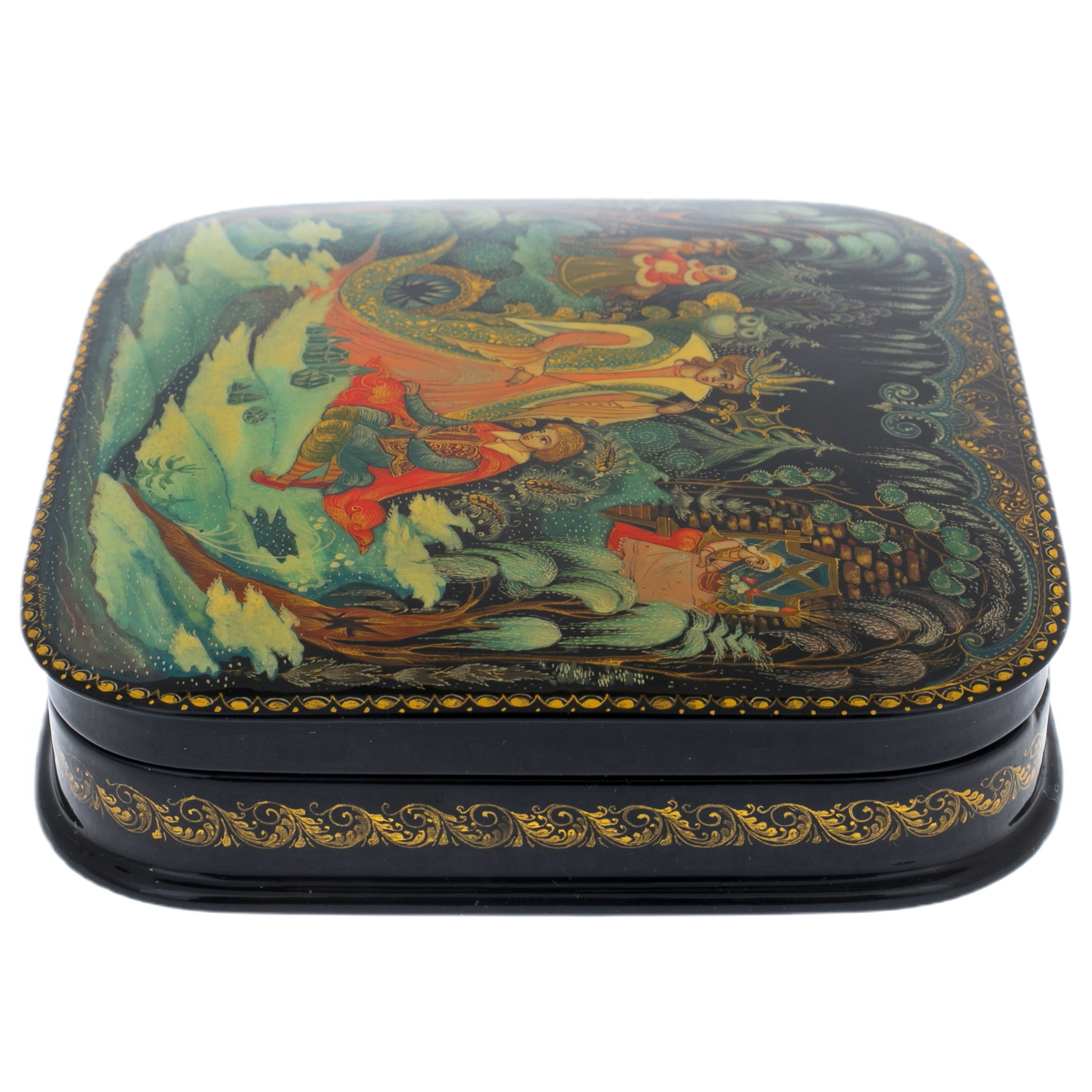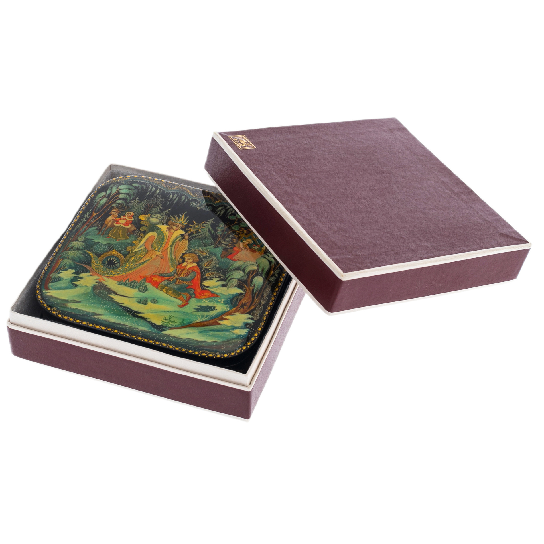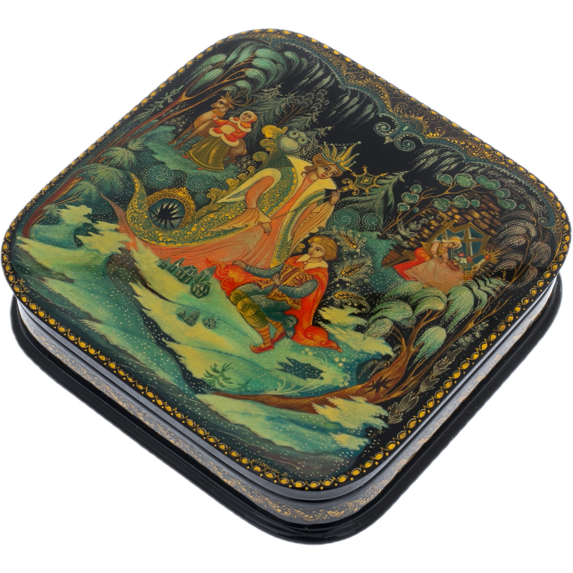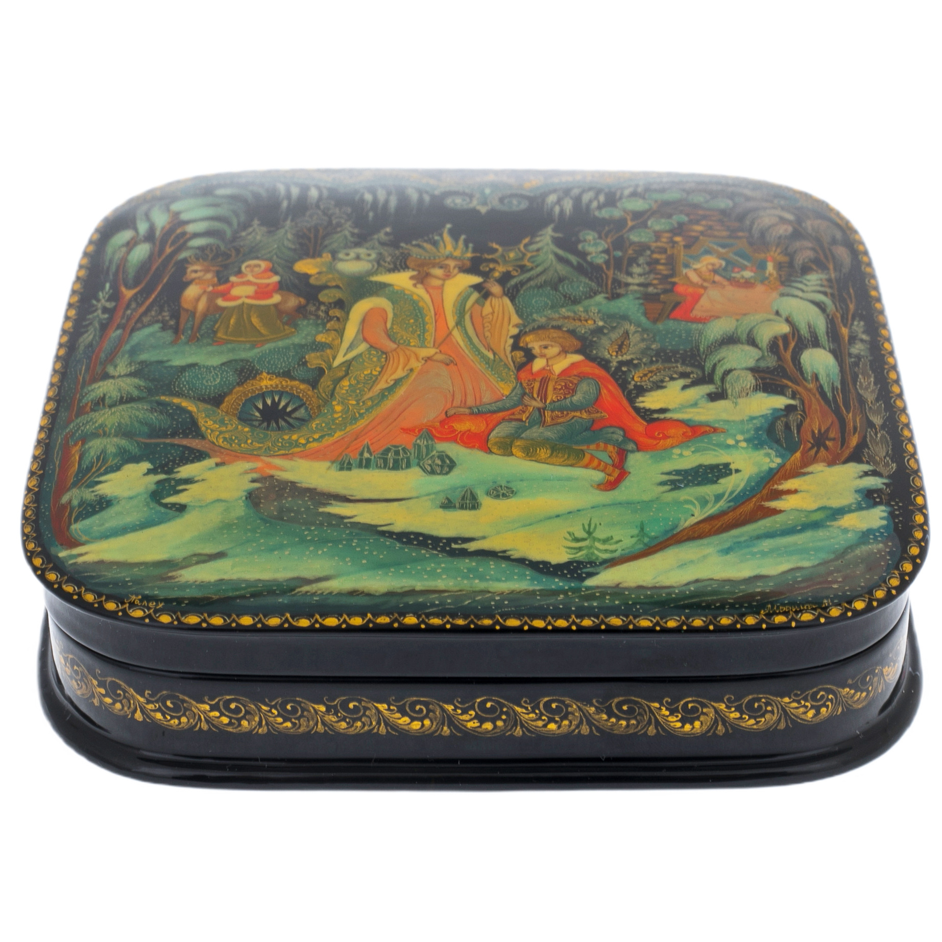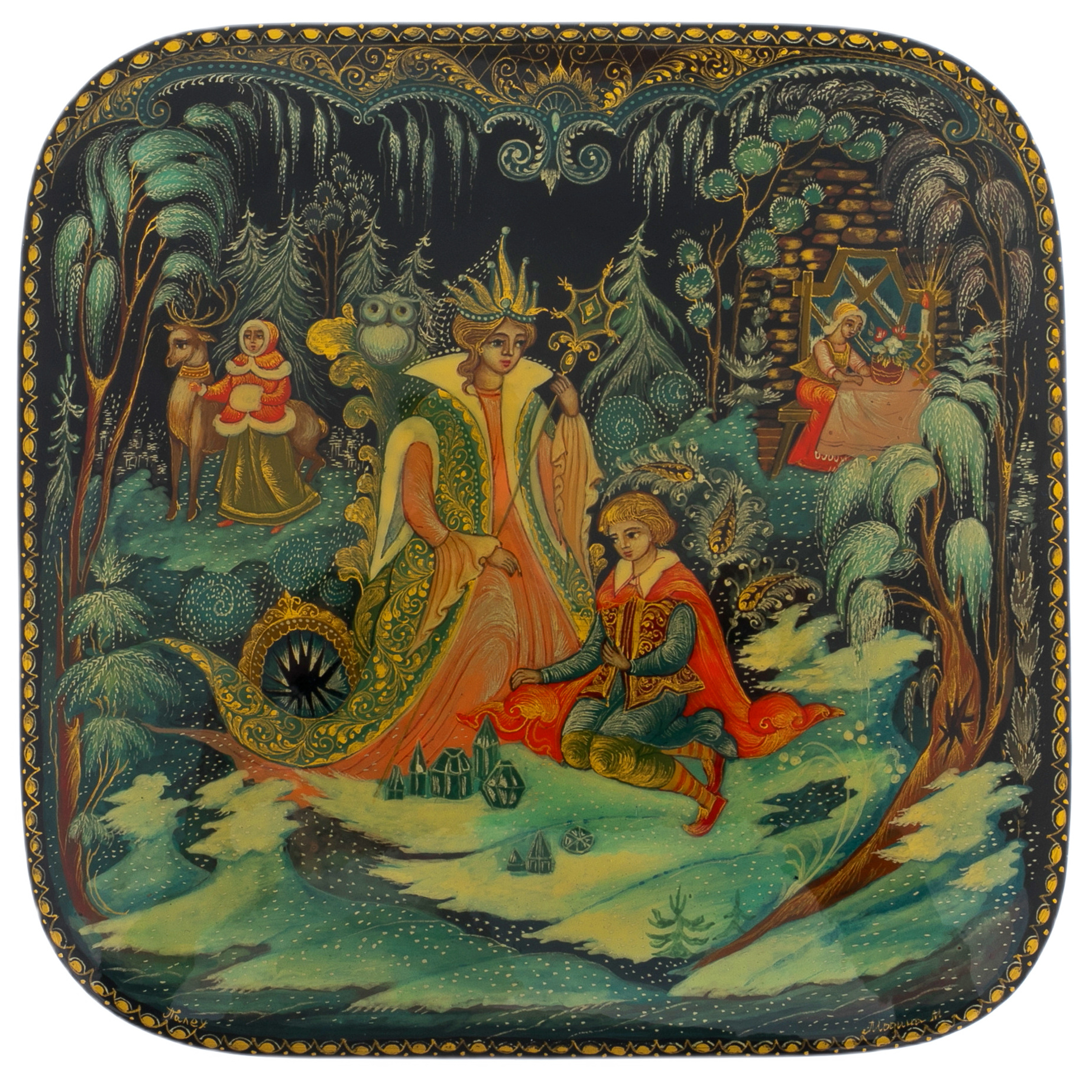 Шкатулка "Снежная королева" из Палеха — это утончённый шедевр, воплощающий силу магии и холодное величие зимы. Её квадратная форма с мягко закруглёнными углами вызывает ассоциации с безмятежным спокойствием, пронзающим до глубины души. Лаковое покрытие, глубокое и блестящее, как зимнее ночное небо, становится идеальным фоном для сюжета, где оживает сказка.