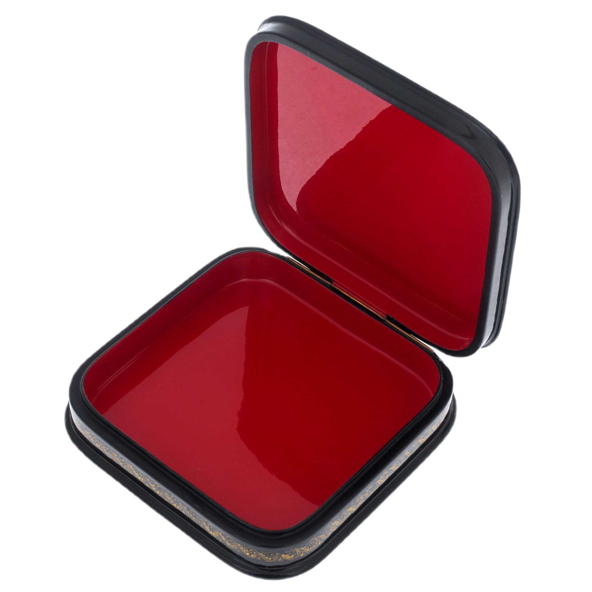 Золотое обрамление по краям шкатулки — словно звёздная пыль, подчёркивающая каждую грань её совершенства. Орнамент выглядит как тонкая кружевная паутинка, окружающая историю, которая не стареет с годами.