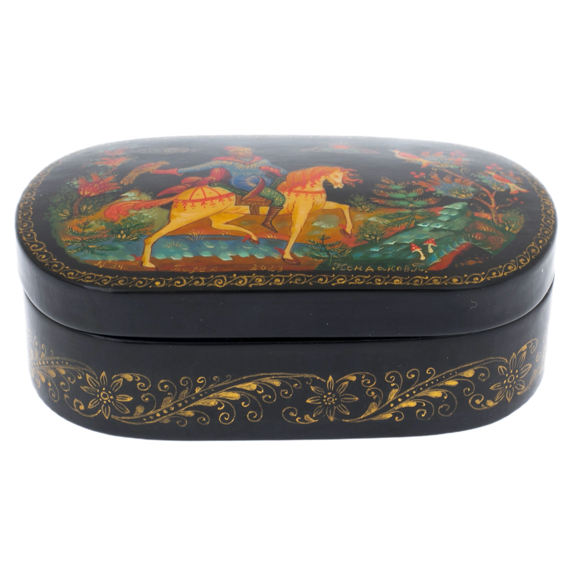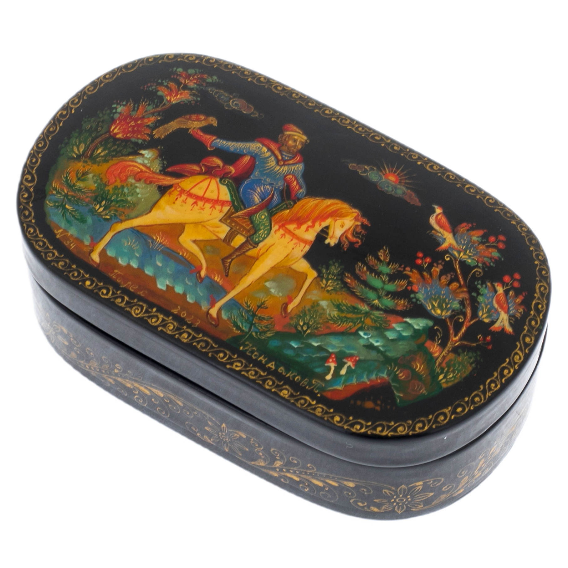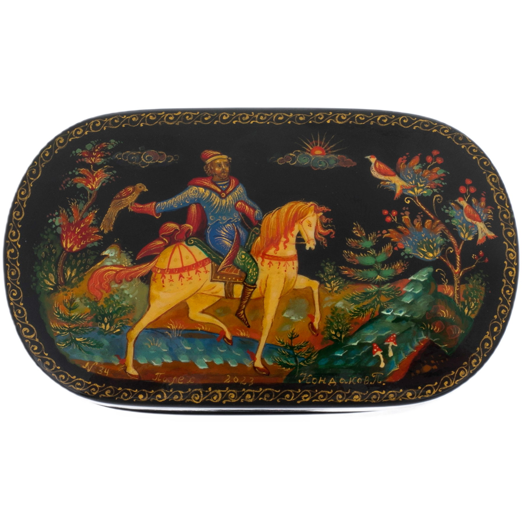 Шкатулка "Соколиная охота" — воплощение искусства, напоминающего о былых временах и величии русской княжеской знати. В её центре — сцена соколиной охоты, древней традиции, доступной лишь избранным. Всадник на золотистом коне, облаченный в яркий наряд, с гордостью и уверенностью держит птицу на руке, готовую к охоте. Его осанка излучает силу и благородство, а фигура коня — олицетворение верности и мощи, словно выхваченной из легенд.