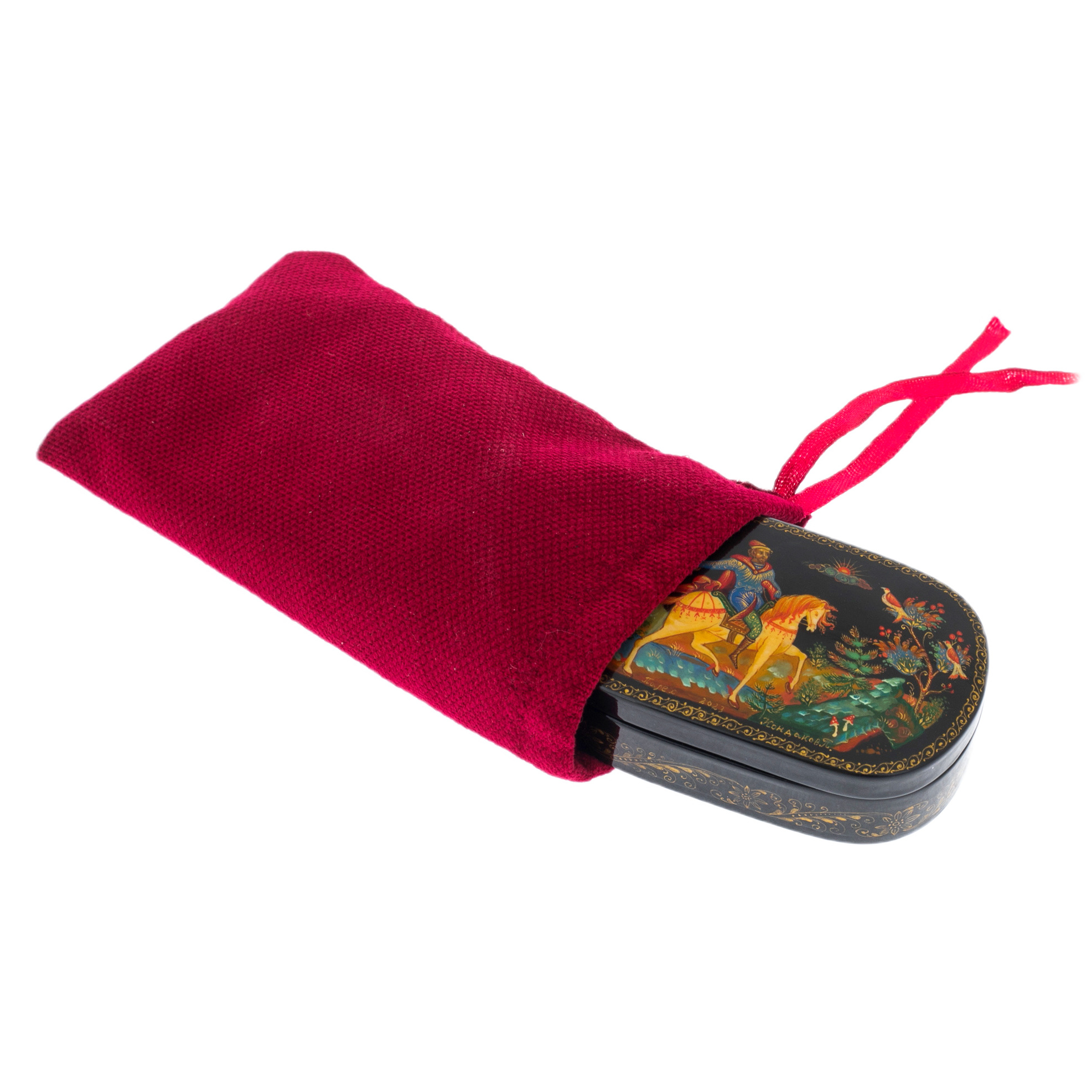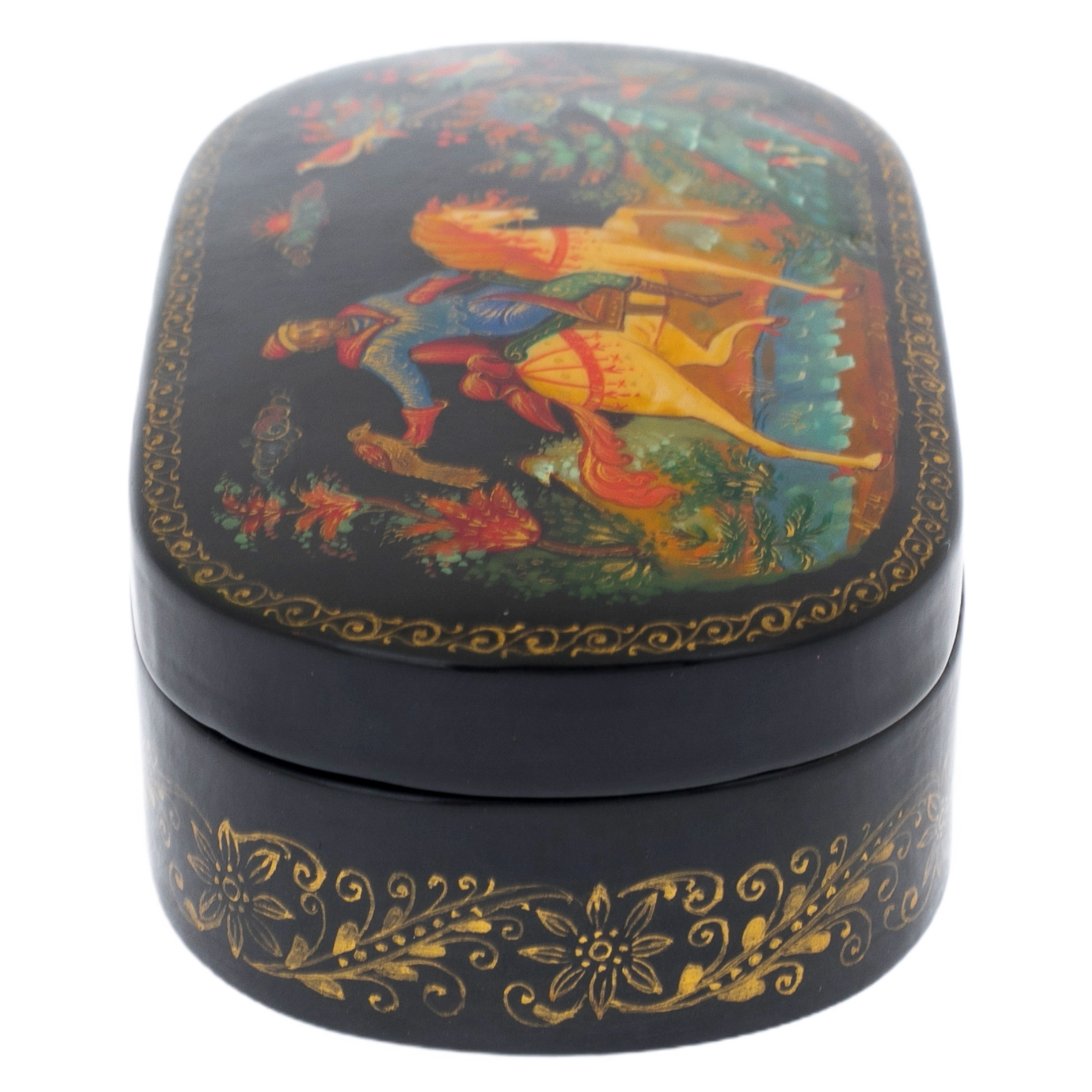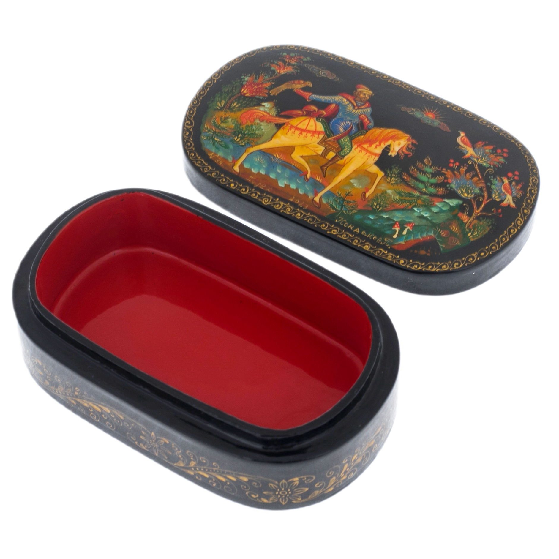 По краям шкатулка украшена тончайшими золотыми орнаментами, придающими завершённость и возвышенность образу. Эта шкатулка — не просто контейнер для украшений, а символическое наследие, часть которого может стать вашим. Она словно несёт в себе силу предков, их стремление к величию и славе, сохраняя в себе благородство и искусство русской земли.