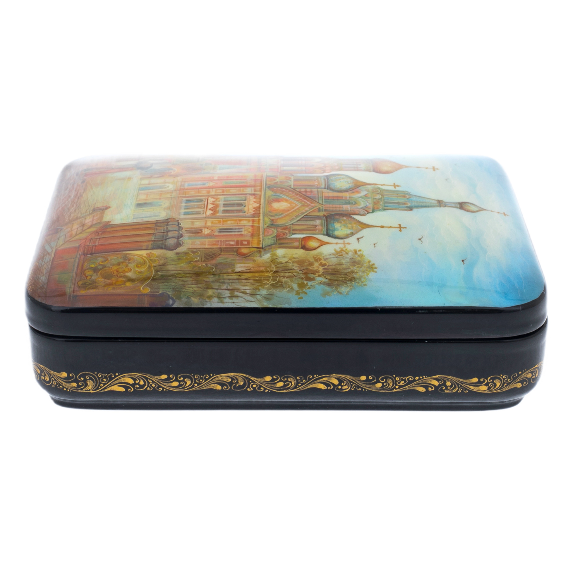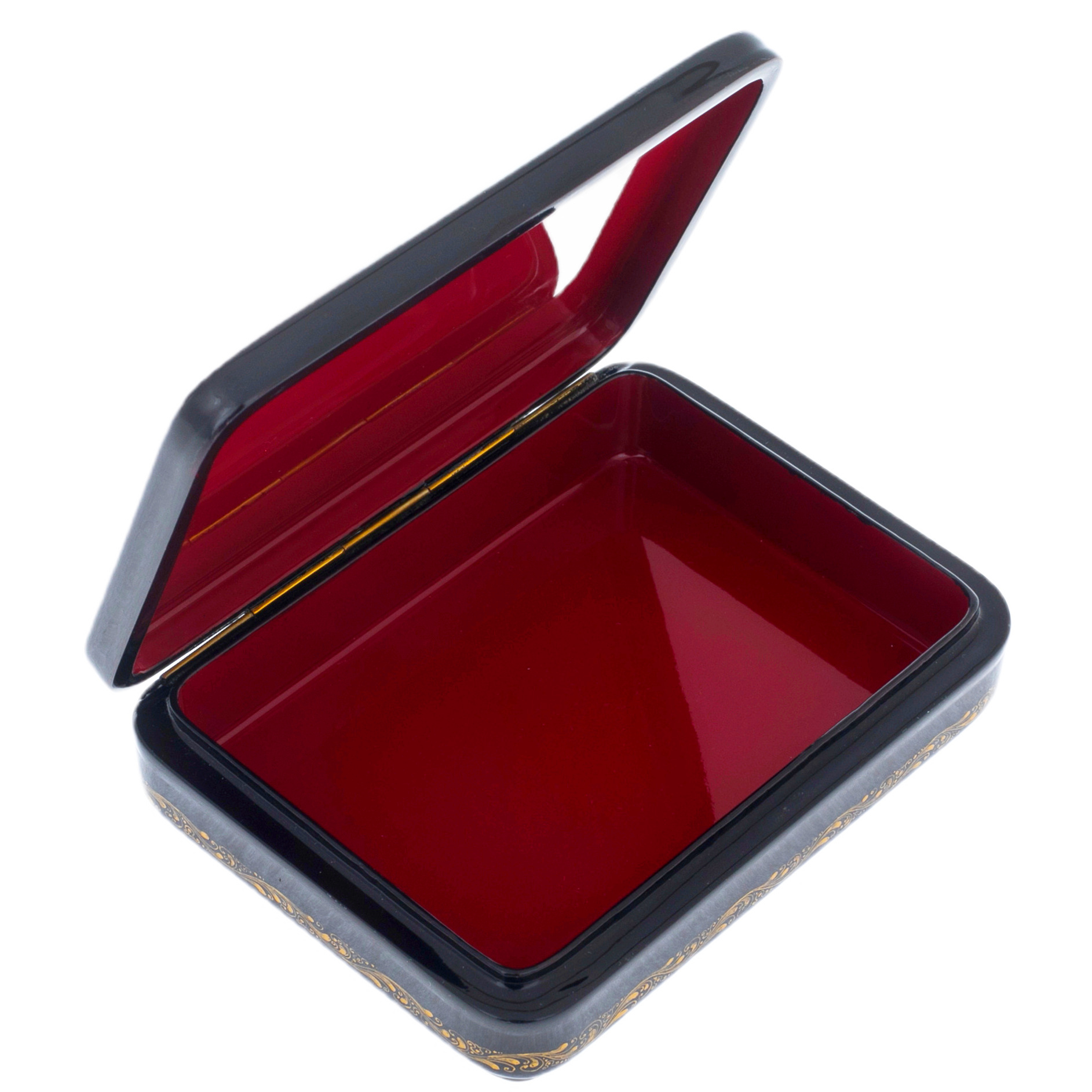 Эта шкатулка обрамлена золотым узором, подчеркивающим её утонченность и роскошь. Каждая линия, каждый завиток орнамента — это невидимая связь с древними традициями мастерства, где каждый мазок — отражение бережного отношения к искусству и истории. Лаковая поверхность, глубокая и зеркальная, словно приглашает провести рукой по гладкой текстуре, ощутив холодную элегантность, в которой заключена тайна былых эпох.