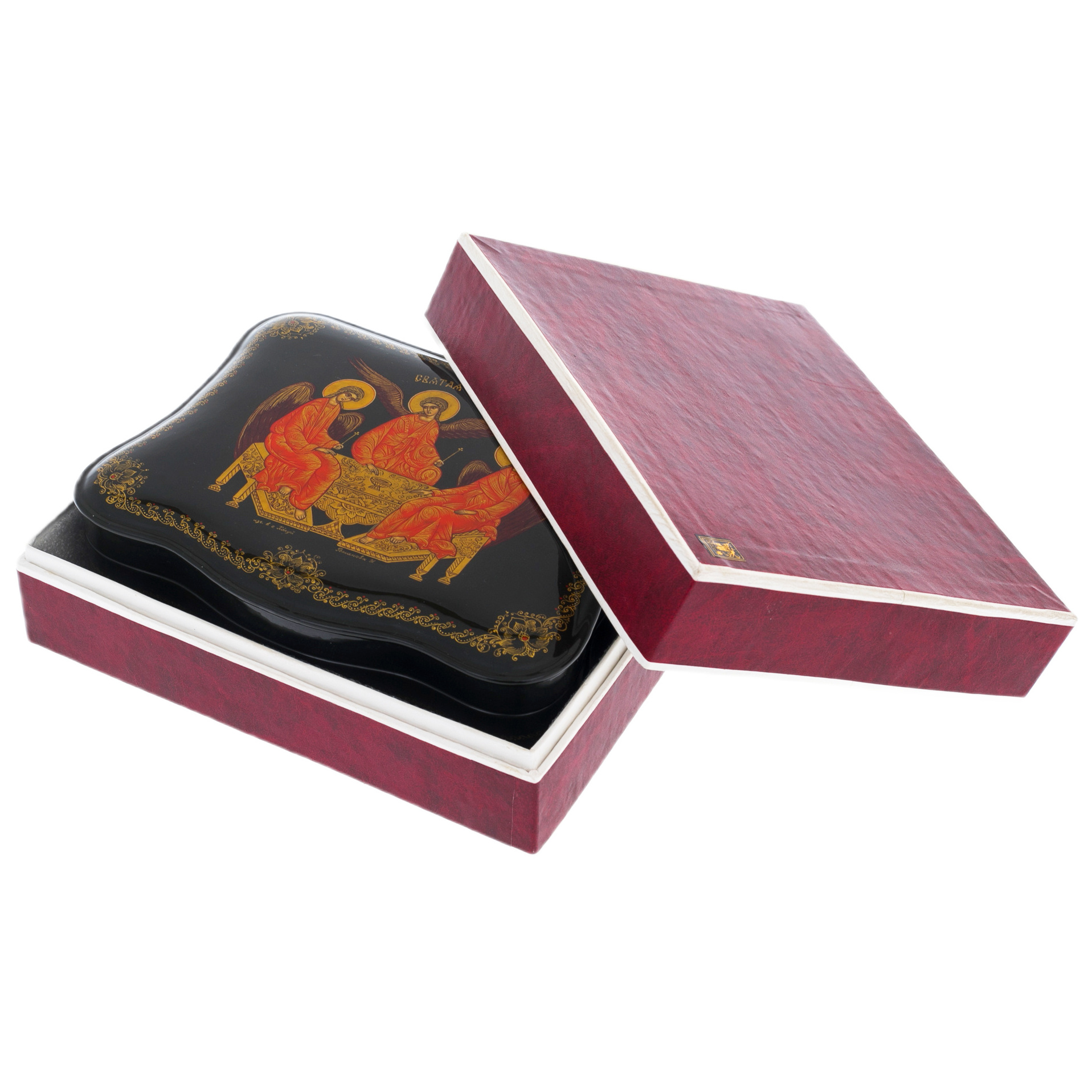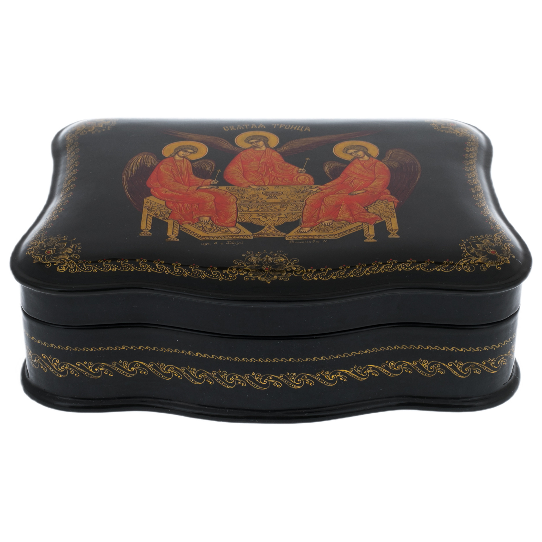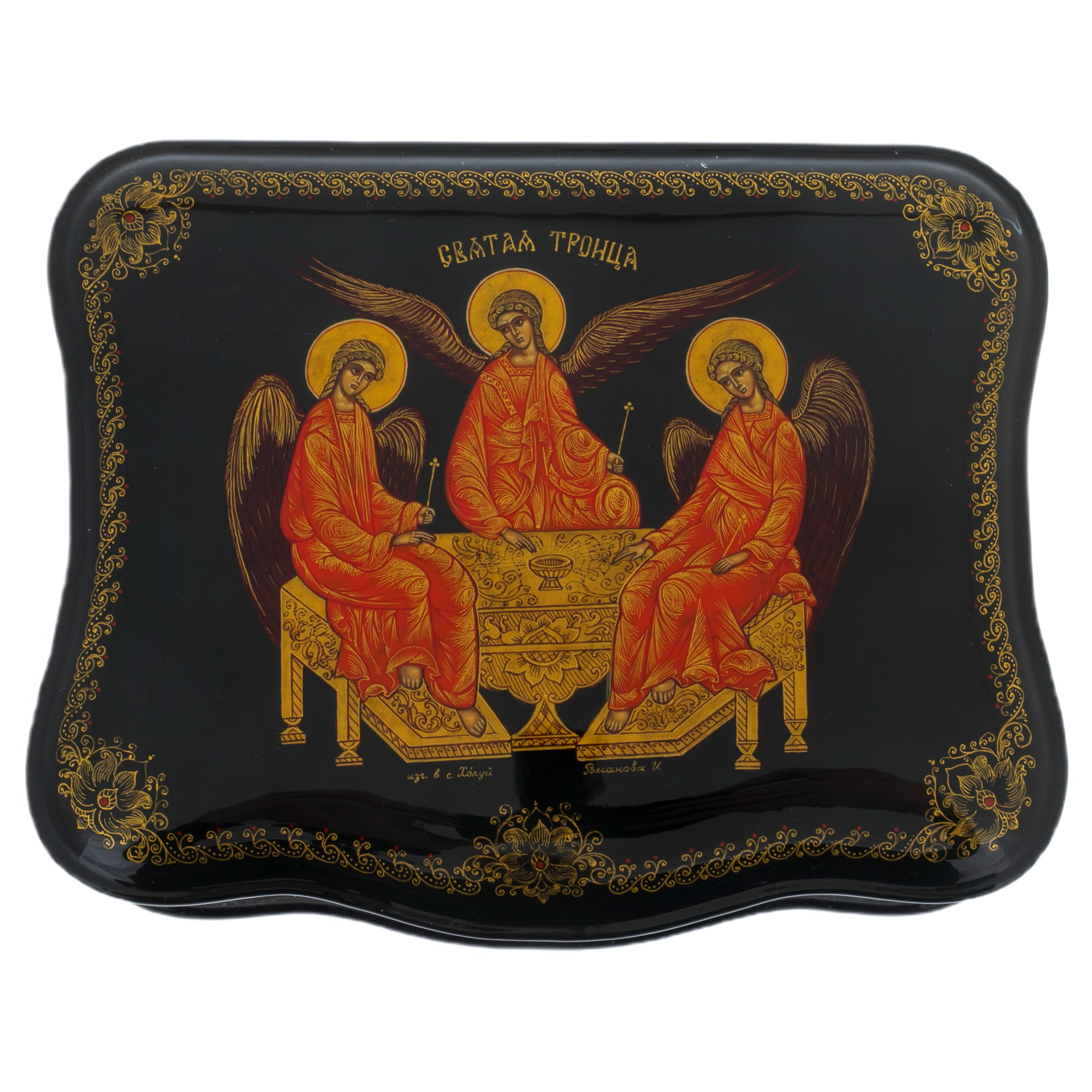 На крышке оживает священный образ Троицы, вдохновлённый бессмертной иконой Андрея Рублёва. Три ангела, облачённые в яркие золотисто-алые одеяния, будто парят в вечности, окружённые сиянием ореолов. Их позы и выражения лиц наполнены небесным спокойствием, символизируя единство, мудрость и вселенскую любовь. Композиция, выполненная с безукоризненным вниманием к деталям, переносит зрителя в пространство, где время замирает перед лицом святыни. Золотой орнамент, мягко огибающий сцену, усиливает ощущение торжественности, как лучи света, падающие на древние свитки.