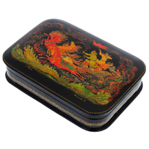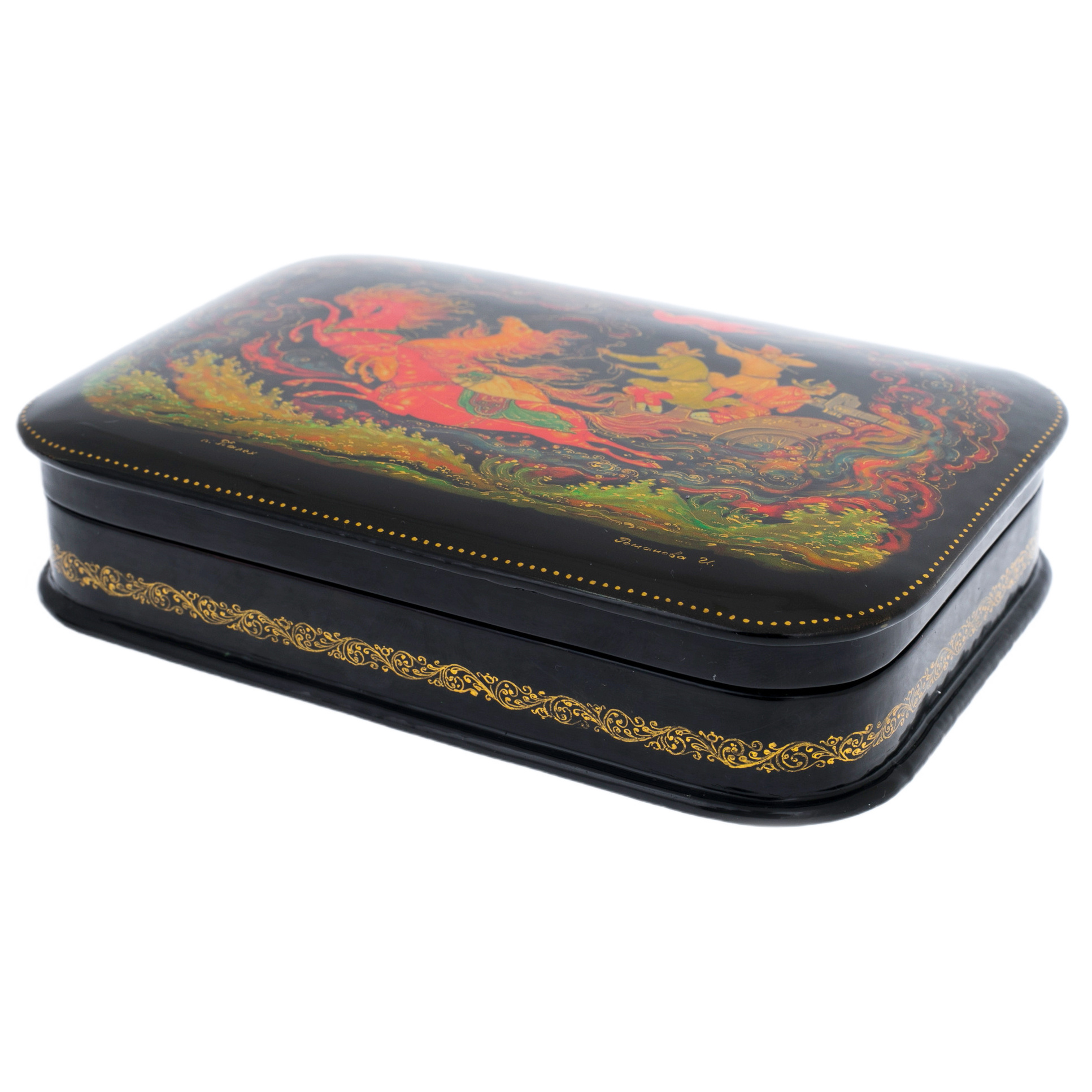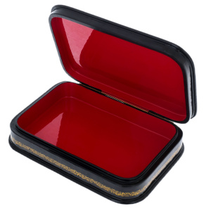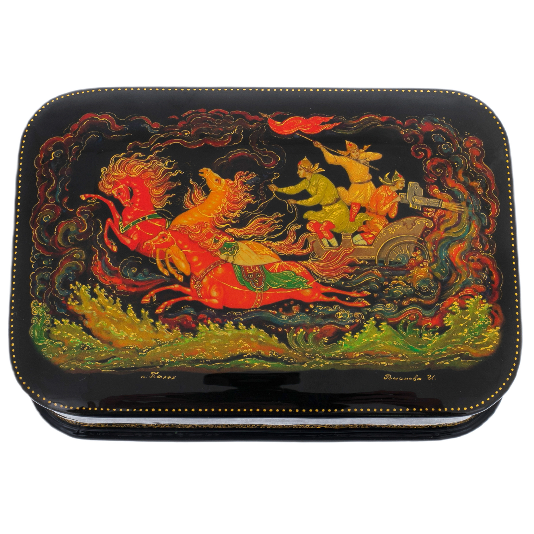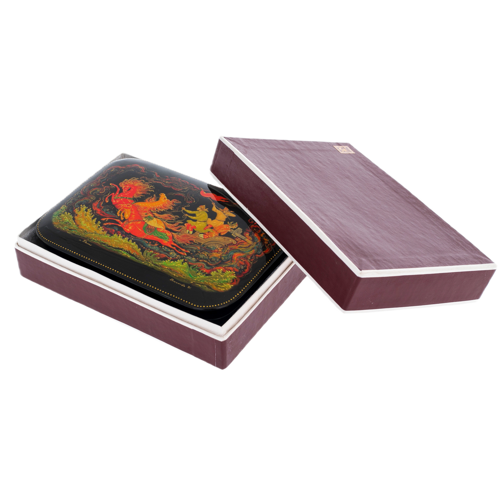 Это произведение палехских мастеров, выполненное в технике традиционной лаковой миниатюры, изначально создававшейся для самых взыскательных ценителей русского искусства. Корпус шкатулки формируется из прочной папье-маше, проходящего многоступенчатую сушку и покрываемого глубоким чёрным лаком, создающим эффект бездонной глянцевой поверхности. Внутреннее пространство выстлано густым красным лаком, контрастирующим с тёмным внешним блеском и подчёркивающим ощущение камерной драгоценности.