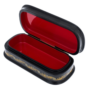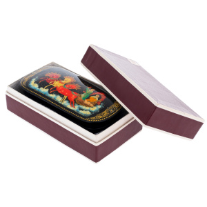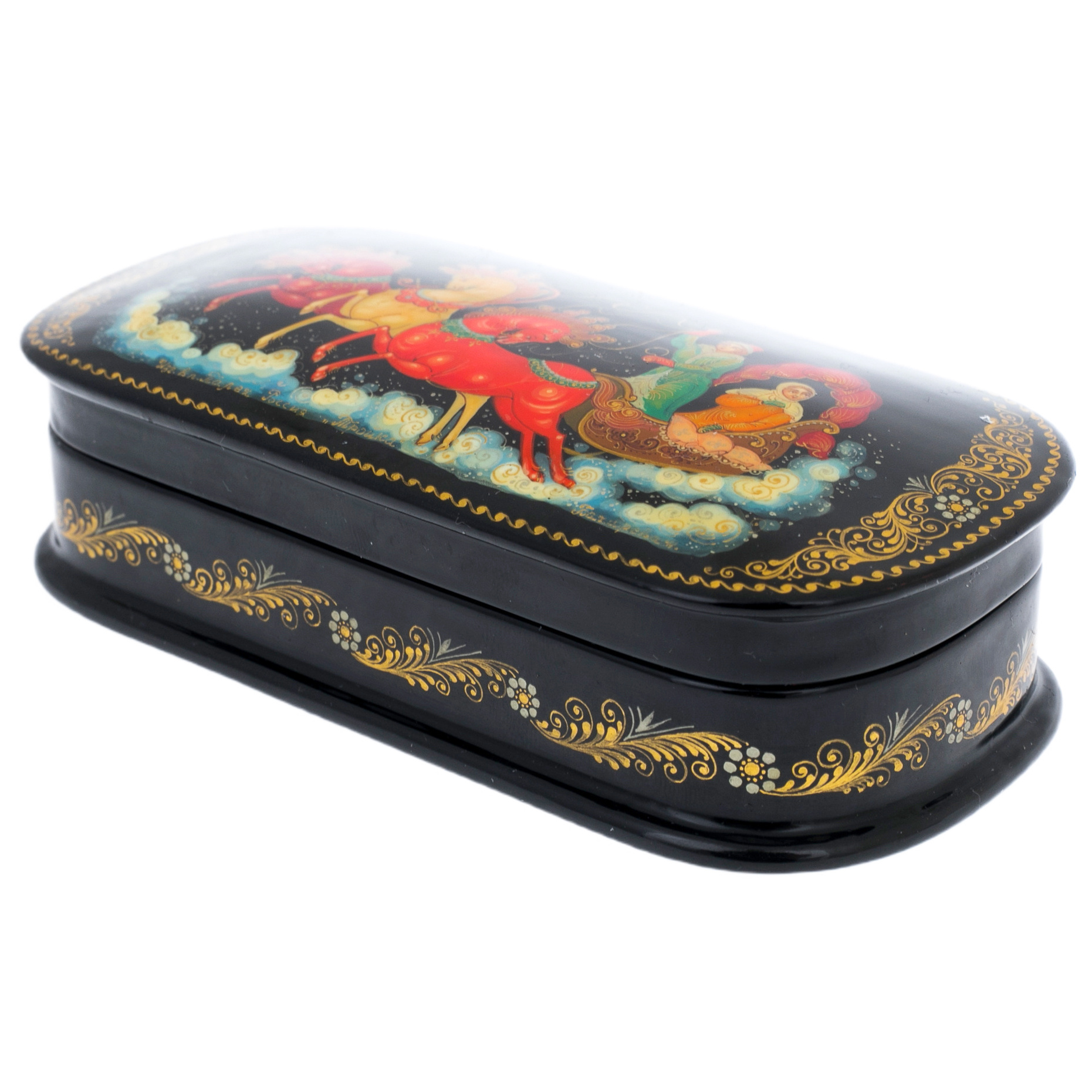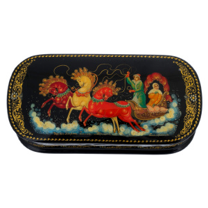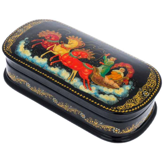 Это произведение палехских мастеров, выполненное в технике традиционной лаковой миниатюры, изначально создававшейся для самых взыскательных ценителей русского искусства. Корпус шкатулки формируется из прочной папье-маше, проходящего многоступенчатую сушку и покрываемого глубоким чёрным лаком, создающим эффект бездонной глянцевой поверхности. Внутреннее пространство выстлано густым красным лаком, контрастирующим с тёмным внешним блеском и подчёркивающим ощущение камерной драгоценности.