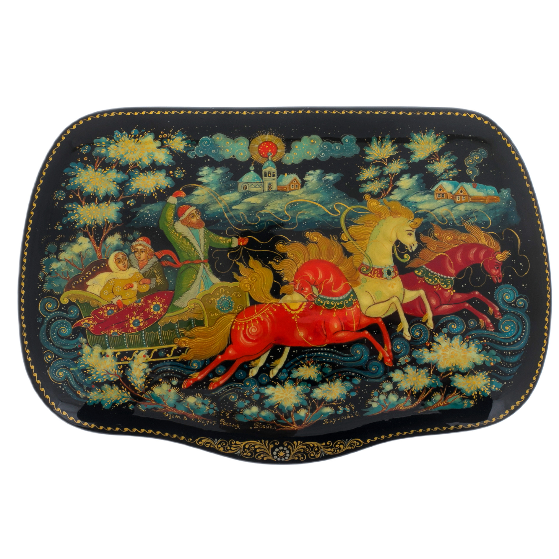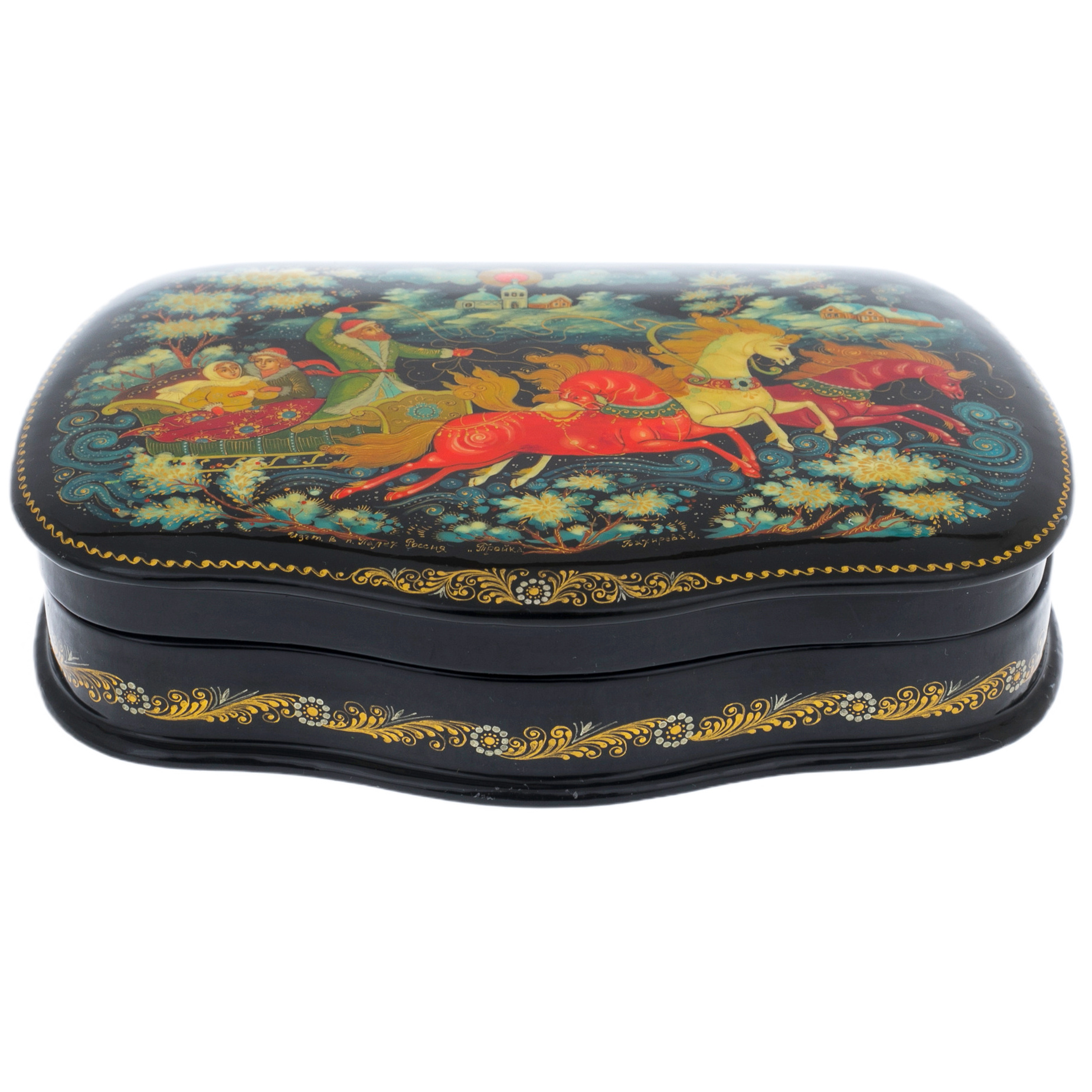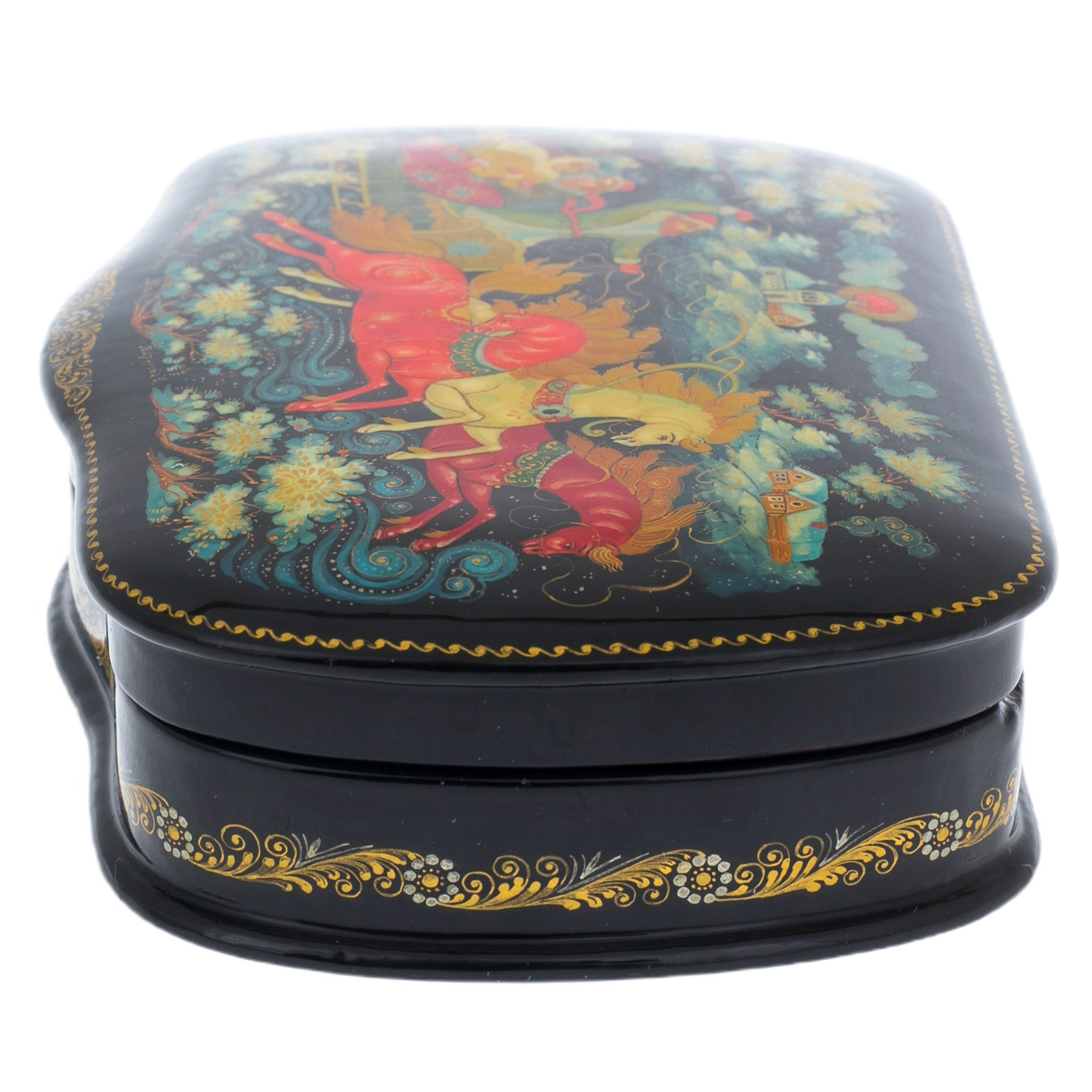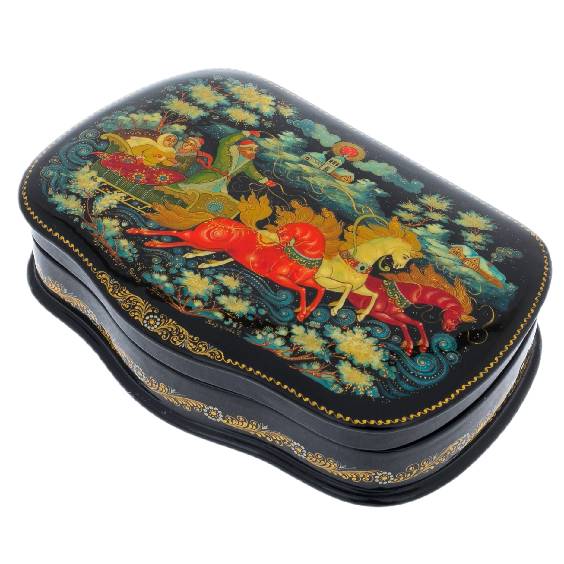 Шкатулка "Тройка" — это не просто предмет интерьера, а истинный символ искусства и мастерства, воплощённый в каждом штрихе. Изготовленная из прессованного высококачественного древесного картона (папье-маше), пропитанного горячим льняным маслом, она представляет собой воплощение многовековых традиций русского искусства. Грунт, состоящий из льняного масла, сажи и глины, создаёт идеальную основу для великолепной миниатюрной живописи, выполненной темперными яичными красками. Поверхность, покрытая черным масляным лаком, сверкает на свету, подчеркивая каждую деталь, а орнамент, выполненный сусальным золотом с добавлением вишневой смолы, придаёт изделию особый шарм и роскошь.