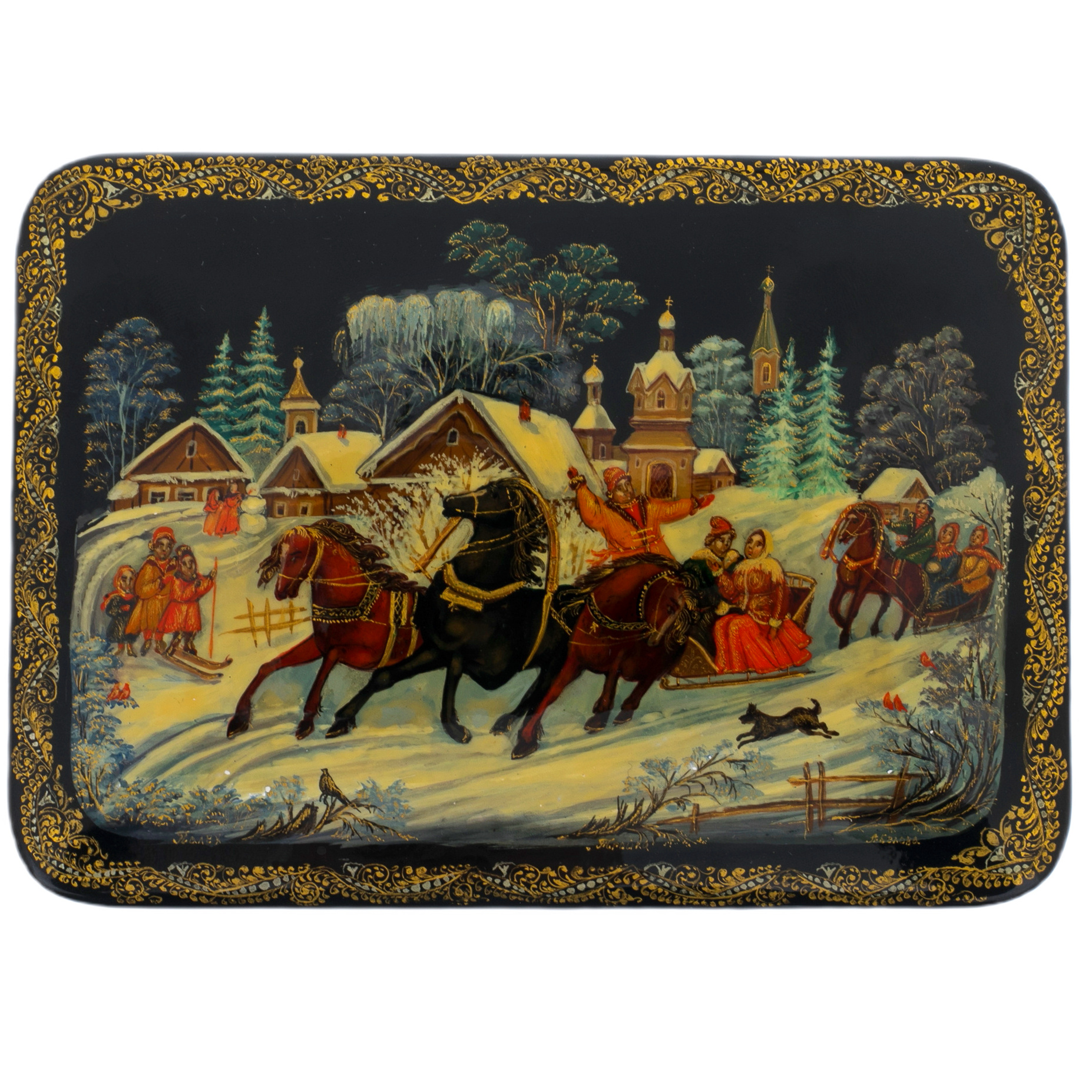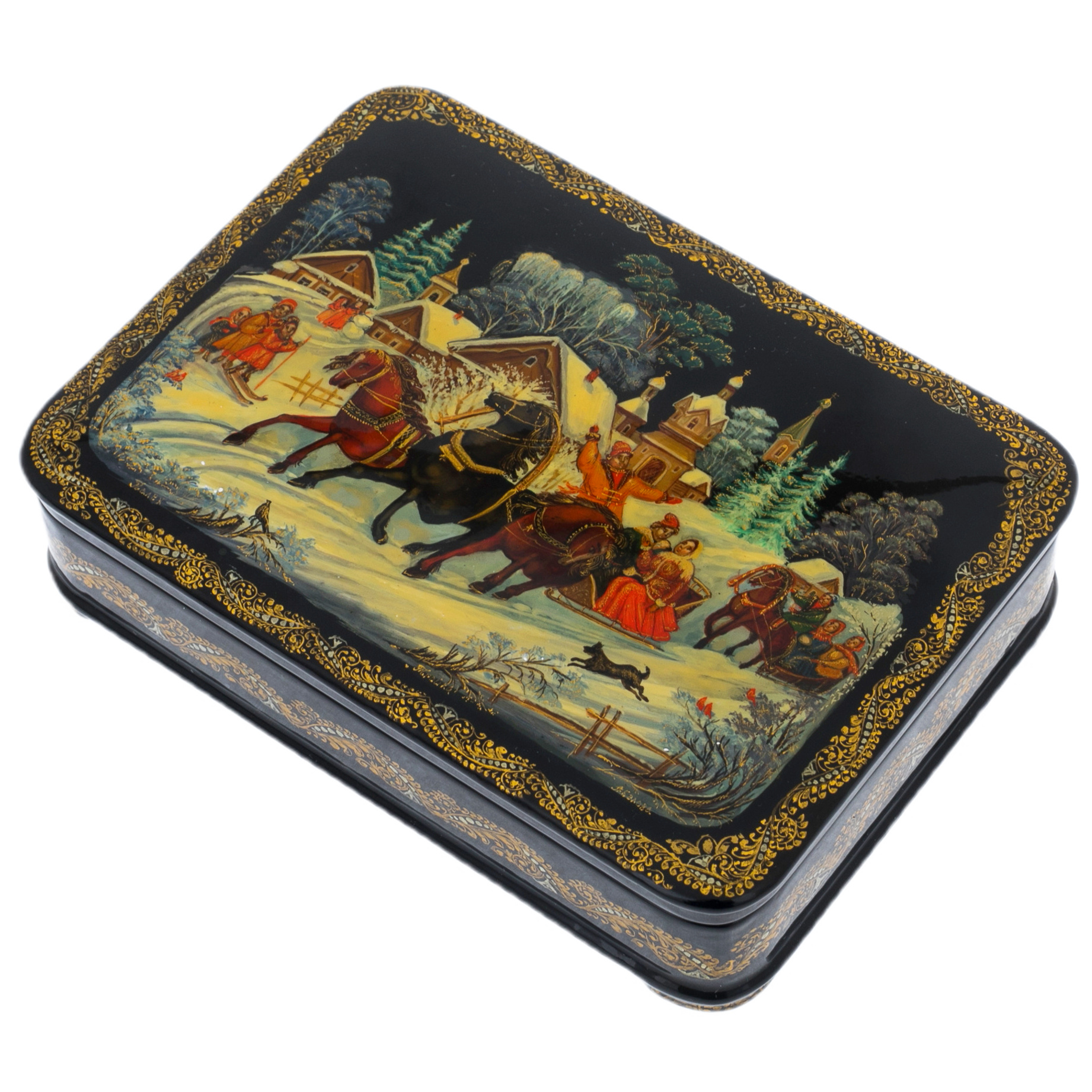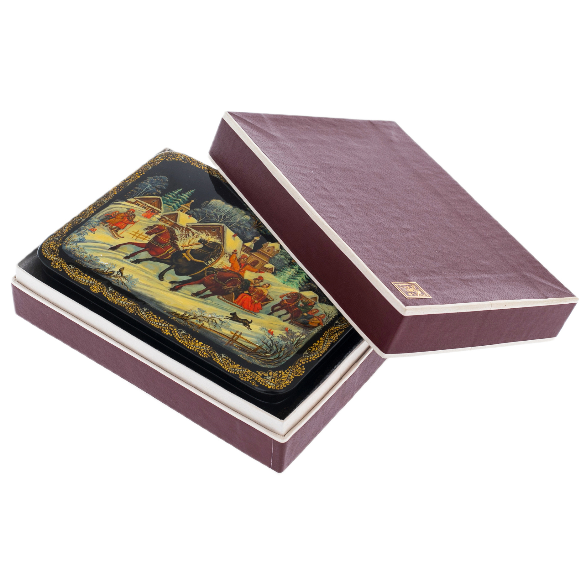 Изысканная шкатулка "Тройка" от палехских мастеров — истинный артефакт, способный перенести в мир русских сказок и легенд. Словно волшебный портал, она открывает двери в эпоху, когда смелые богатырские подвиги и яркие эмоции переплетались в едином танце жизни. Изящные линии, плавно извивающиеся по поверхности, создают ощущение движения, будто тройка мчится по снежным просторам, оставляя за собой искристые следы.